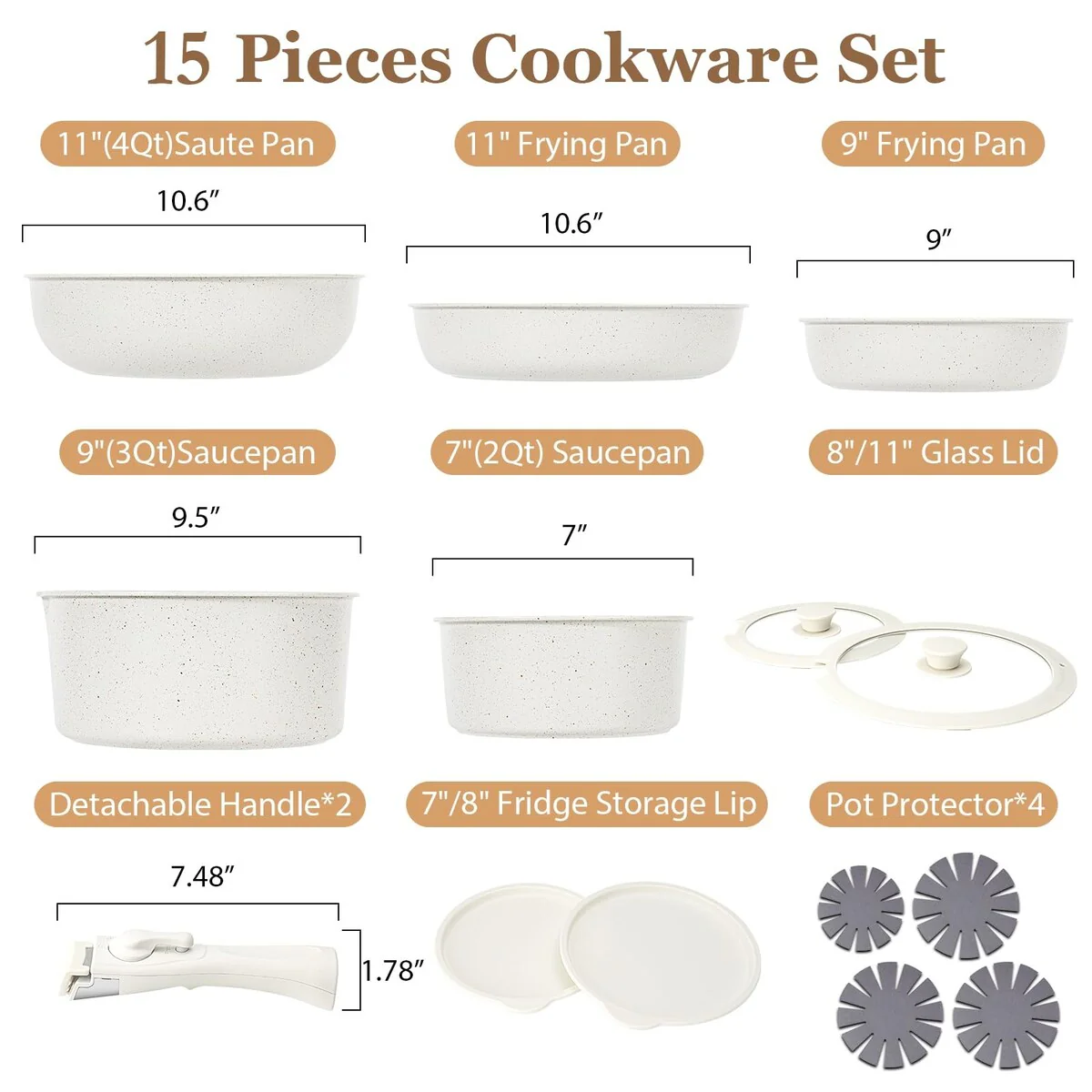 Complete Set : 15 pieces cookware set includes 1pcs 10.6" Saute Pan,1pcs 9&10.6"Frying Pans, 1pcs 2QT Sauce Pan & 3QT Sauce Pan, 2* Removable Handle, 8.7&11"Glass Lid, 4*Pot Protectors, 2*Fridge Storage Lid. Suitable for sautéing, frying, simmering, boiling, and more, catering to a wide range of cooking needs.