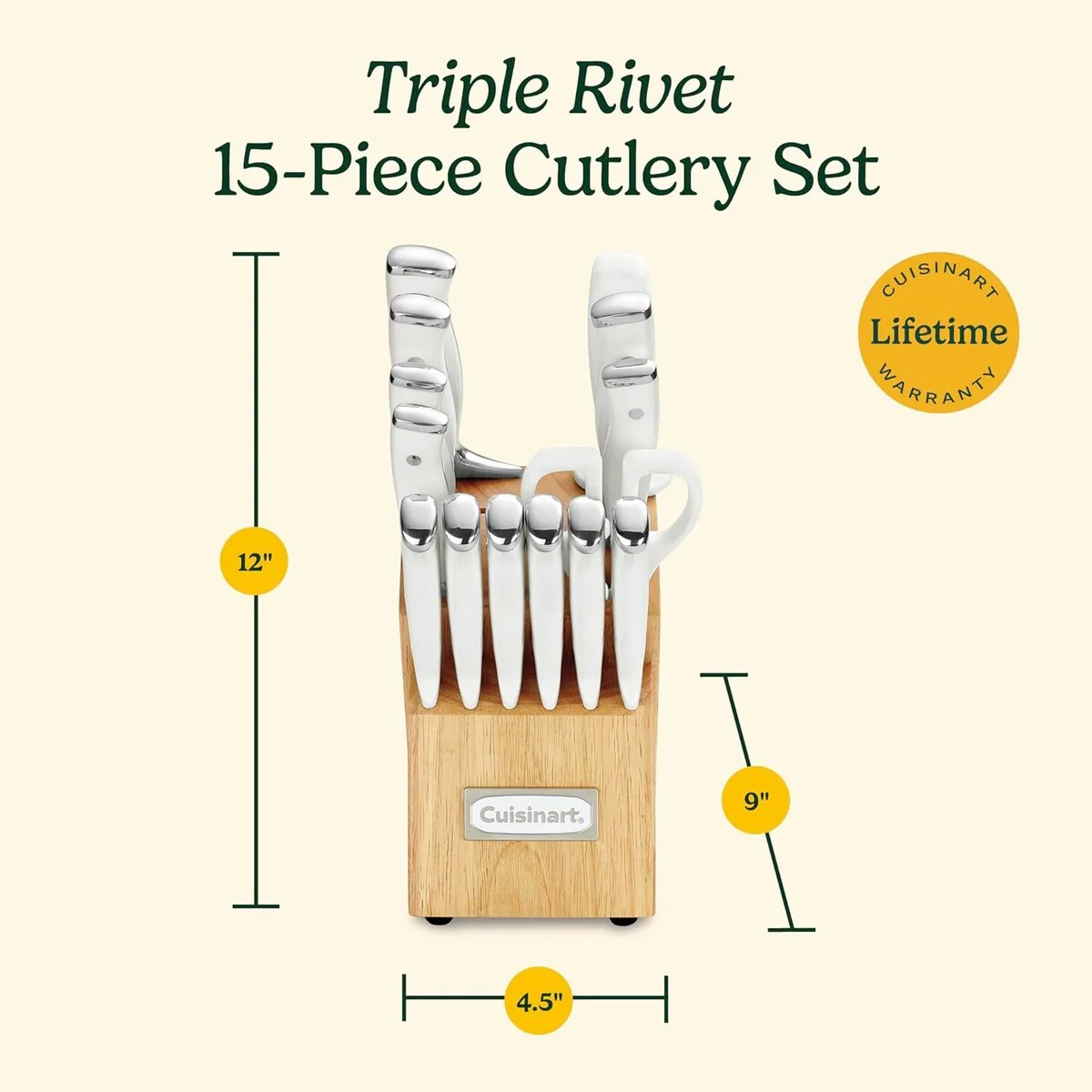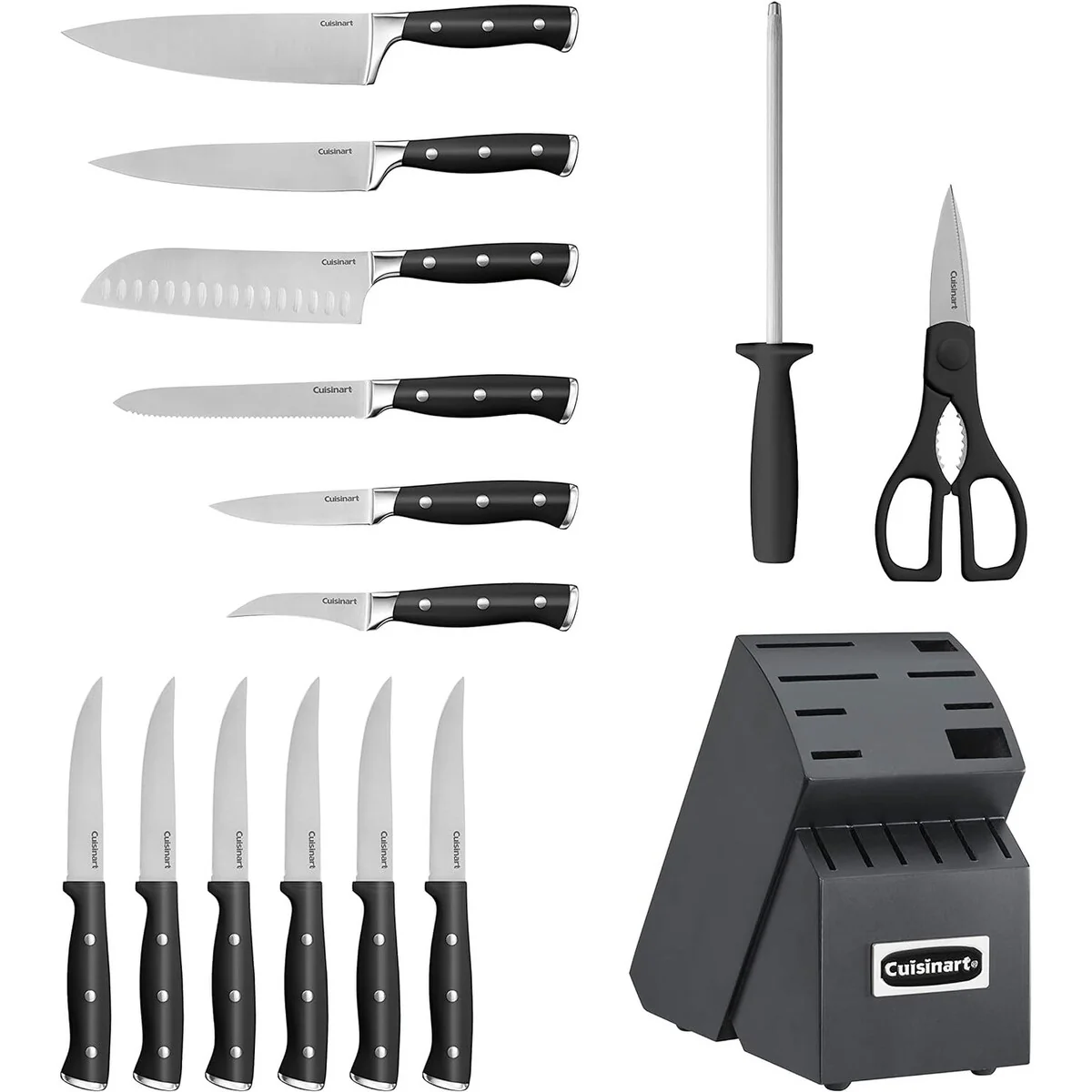 The Classic Forged Triple Rivet Cutlery possesses superior high-carbon stainless steel blades for precision and accuracy. Â 8-inch Chef Knife, 8-inch Slicing Knife, 7-inch Santoku Knife, 5.5-inch Utility Knife, 3.5-inch Paring Knife, 2.75-inch Bird’s Beak Paring Knife, 4.5-inch Steak Knives (6), 8-inch Sharpening Steel, All-Purpose Household Shears and Wooden Block.