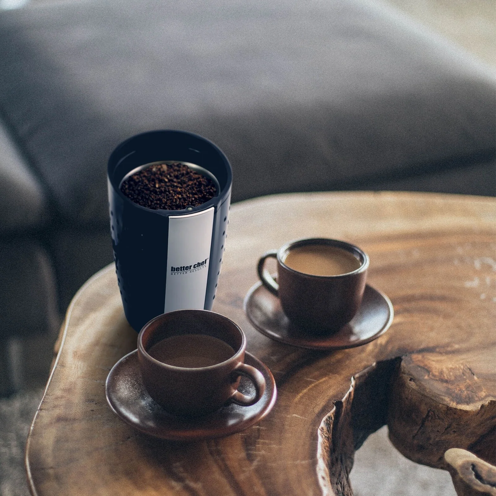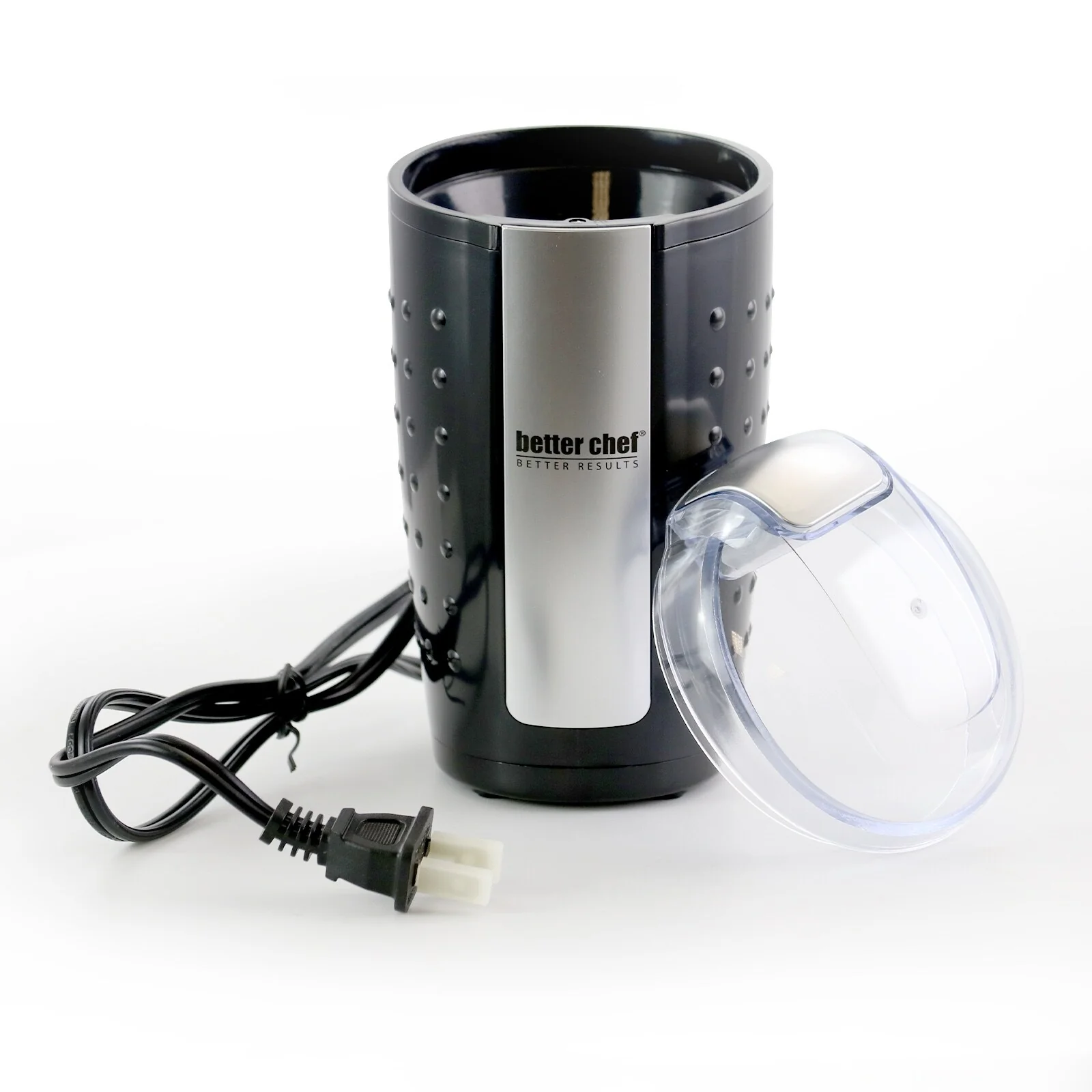 Compact and POWERFUL, the Better Chef Power Blade Coffee Grinder’s 150-Watt motor will grind not just coffee, but nuts, spices, and more. Whether you want some rough chopped nuts for an ice cream sundae or coffee beans ground to dust for your morning joe, with the Better Chef Grinder, it is simply a matter of how long you keep the unit running. With the easy-grip textured surface and one-touch operation, you can hold the unit in place while the durable stainless steel blades make quick work of whatever you need pulverized. It also comes with a safety locking mechanism, so no worries about a plume of dust erupting from the grinder while it is running. And with a 100G/3.5oz capacity, you’ll have enough grounds to get even the heaviest drinker through the morning. When you’re finished the unit even has cord storage built in, just put in the cupboard and you’ll never have to deal with a hanging power cable. We all love our coffee freshly ground. No one wants some week old, stale, store bought, powder. So give the Better Chef grinder, a shot, go through that extra 2.5 minute grinding prep, and you will have coffee as it was meant to be drunk, fresh, fulfilling, and perfect for that morning jolt! Measures: 7" x 4" x 4" 1.5 LB Capacity:3.5 FL OZ * 150 Watt motor can grind coffee, nuts, spices and more* One touch operation with safety lock* durable stainless steel blades* 100G/3.5OZ stainless steel grinding chamber* Easy grip textured surcace* Cord Storage Item Dimensions: 4.00" x 4.00" x 7.00"Item Weight: 1.50lbs