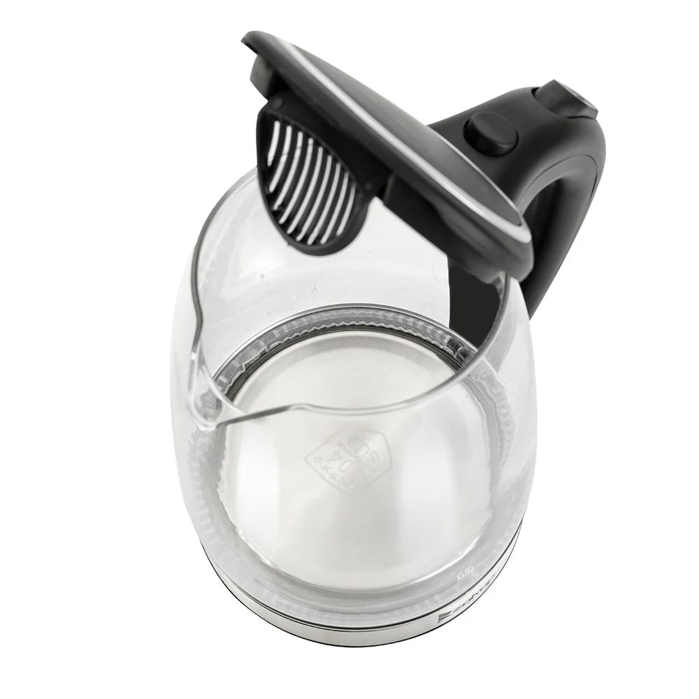 The ZOKOP HD-1857-A 110V 1500W 1.8L  Electric Glass Kettle is the perfect blend of elegance and functionality. Not  only is this kettle a beautiful addition to any kitchen countertop, but it also  boils water efficiently, saving time and energy over the use of conventional  stovetop kettles. A halo of blue LED lights beautifully illuminates the pot when  it’s in use, so it’s not only practical, but very attractive to look at. In a  matter of minutes, hot water will be ready to use for instant coffee, tea, hot  cereal, instant macaroni, soup, or oatmeal.