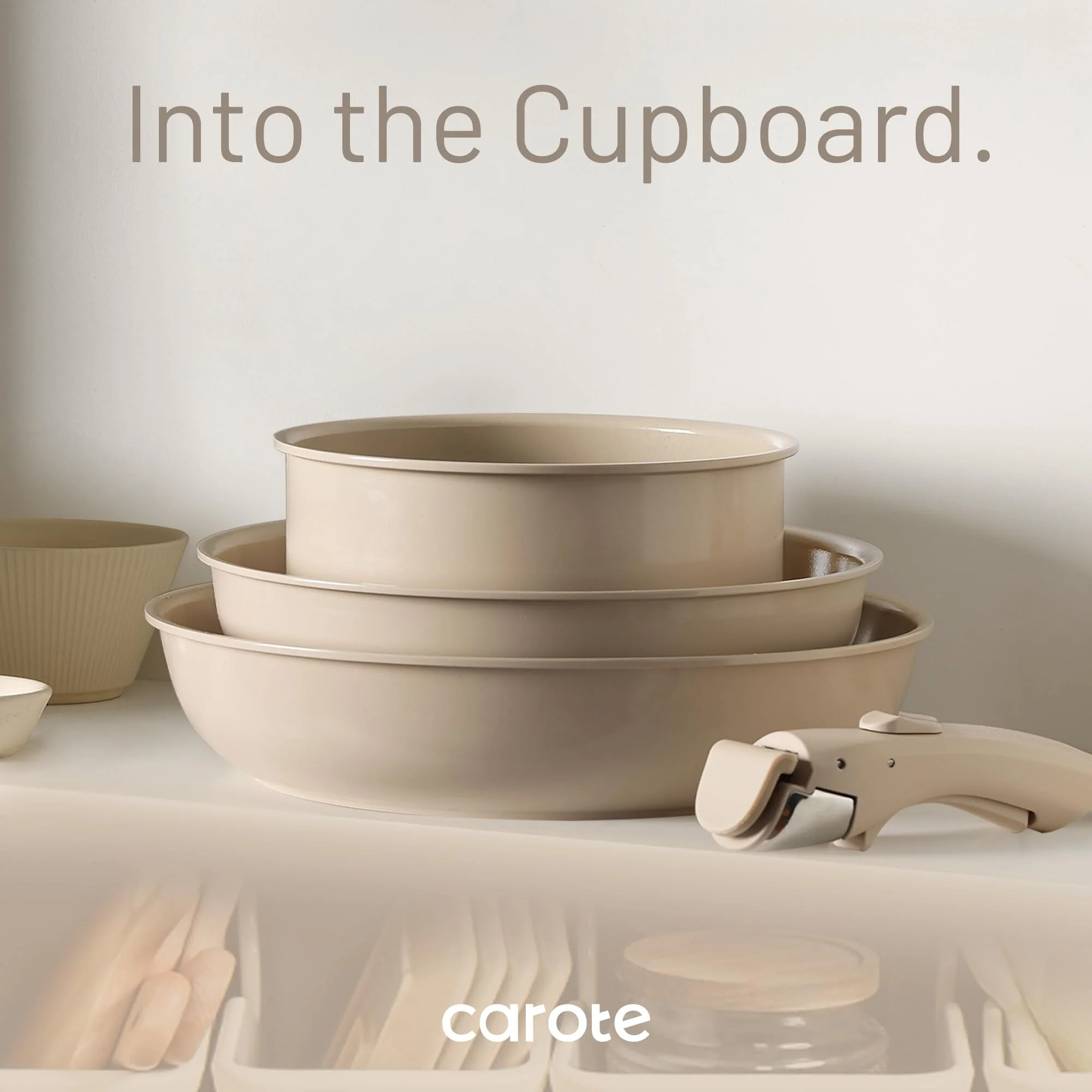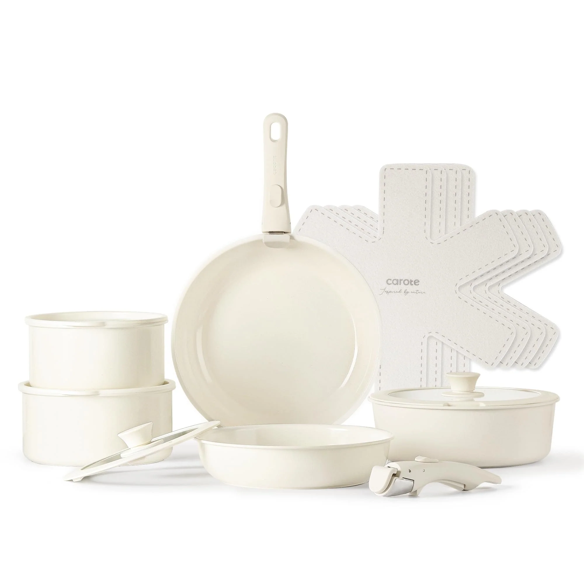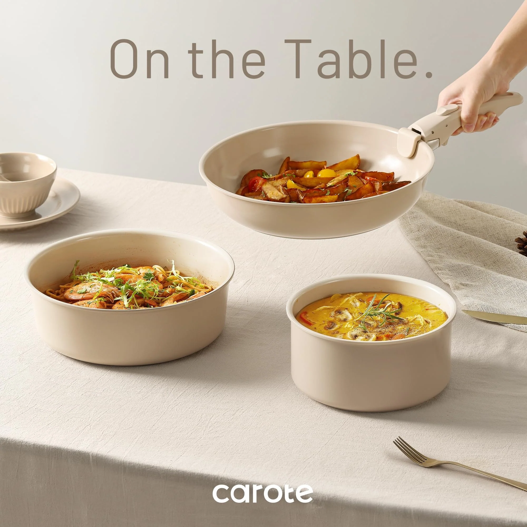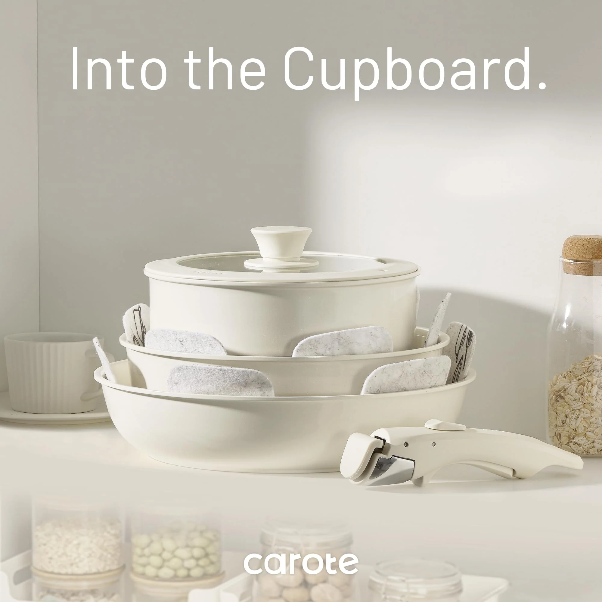 : Optimal storage and easy stacking with the handles off saves up to 70% more space for detachable handle pots and pans set.
