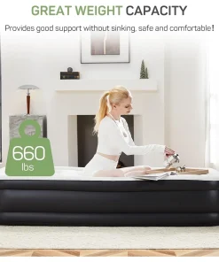 Experience the superior comfort and convenience of our air mattress, designed for indoor and outdoor use. The soft suede top layer provides a gentle touch, making it ideal for a good night’s sleep and easy to clean. The non-slip bottom ensures stability and reduces noise, allowing you to move without being disturbed. Our air mattress has an upgraded internal design with elastic honeycomb column support, which can withstand up to 660 lbs. without sagging. The sturdy PVC material is not only scratch-resistant but also maintains its shape. Equipped with a built-in 110-Volt high-power electric pump, inflating or deflation has never been easier. Your air mattress comes with a convenient storage bag that not only protects the mattress but also makes it easy to carry.Â