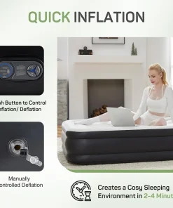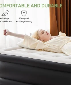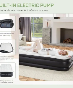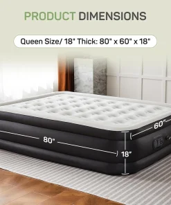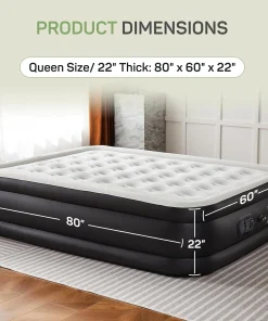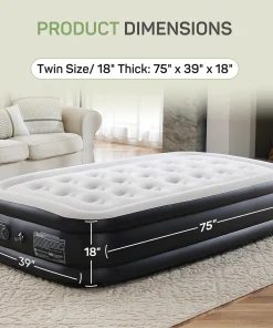 - Built-in Electric Pump for fast inflation/deflation: built-in 110-Volt high-power electric air pump, quietly inflates/deflates the air bed in minutes with the push of a button, this integrated pump simplifies the inflation process, eliminates the need for manual valves, and significantly reduces the risk of leaks while speeding up inflation and deflation times, enjoy fast setup times tailored for different sizes: 22 in. queen – 240s, 18 in. queen – 200s, 16 in. queen – 150s, 18 in. twin – 130s, 16 in. twin – 110s.