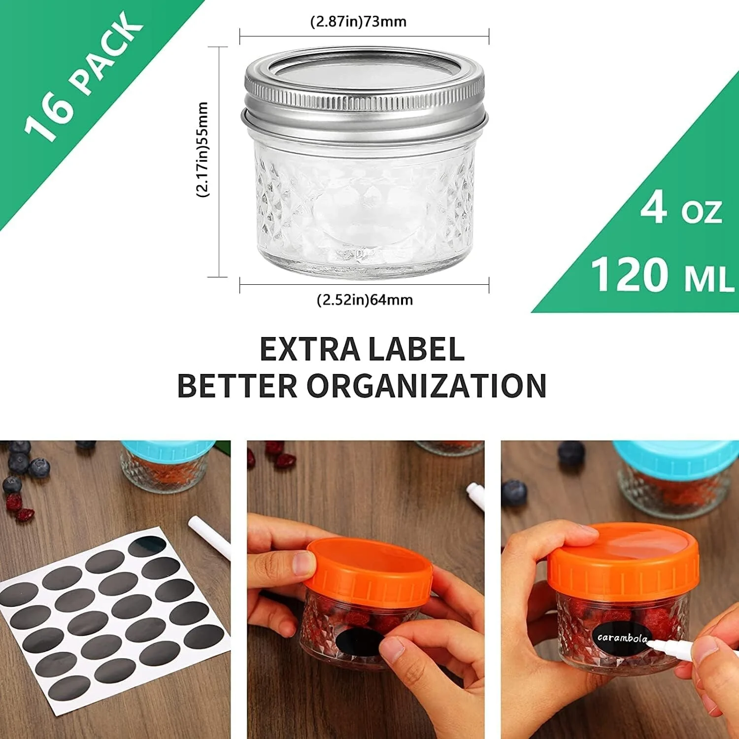 - Set Includes: 16 pieces of 4oz Mason jars with split lids . We will also provide an additional 16 pieces of plastic lids in 8 different colors, 16 pieces of silicone sealing rings for regular Mason jars, 16 labels.