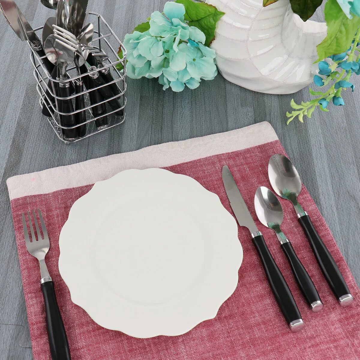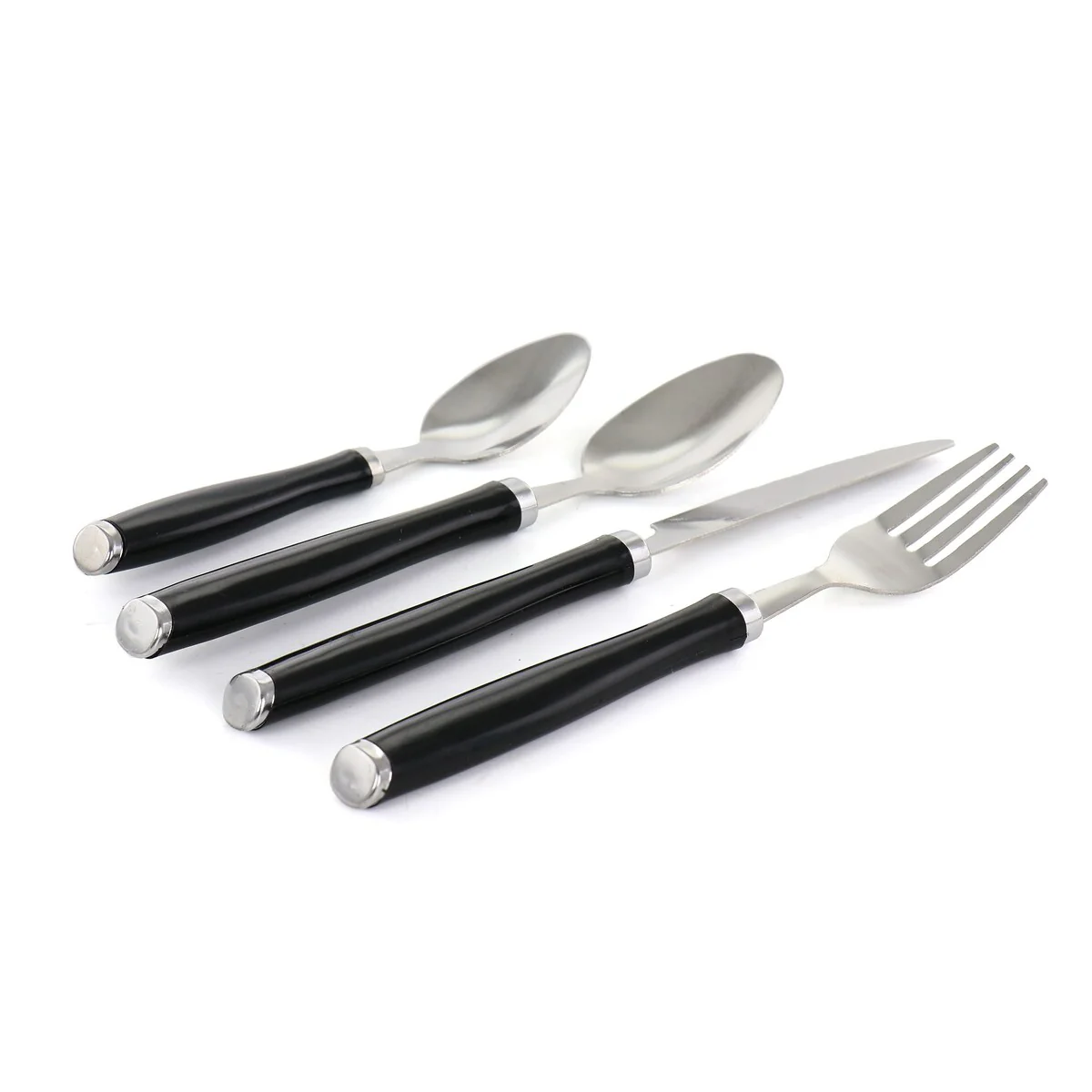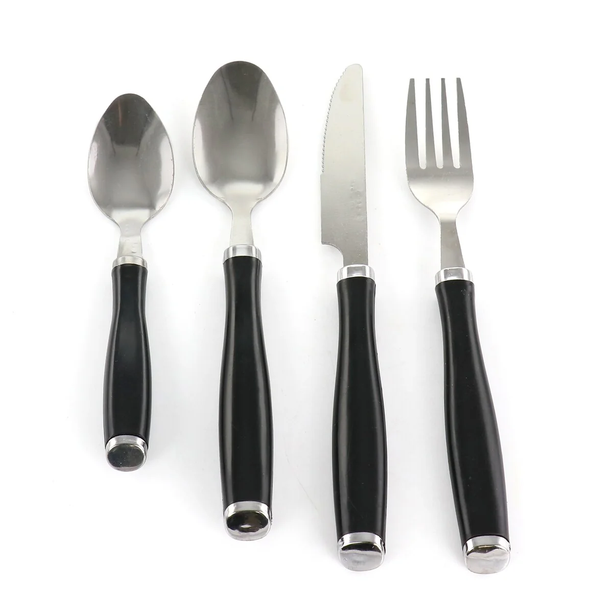 Keep your utensils   organized with this 16 Piece Flatware Set with Metal Caddy in Graphite. This set includes four of each dinner forks, dinner   knives, dinner spoons, and teaspoons. The included stylish metal caddy with   four sections for each utensil will keep everything together while allowing you to have your utensils out for display and easy grabbing. With a stainless   steel build and a plastic handle, these utensils are sturdy yet   lightweight. Item Dimensions: 9.50" x 4.00" x   4.00"
