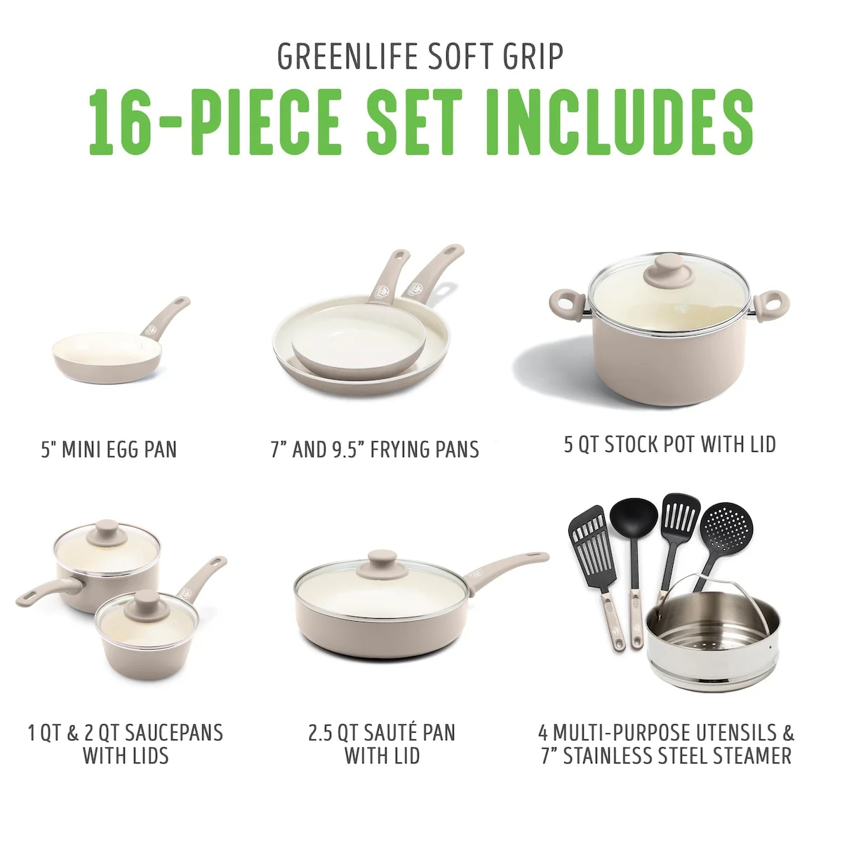 SET INCLUDES: 4" mini frying pan, 7" and 9.5" frying pans, 1QT and 2QT saucepans with lids, 5QT stock pot with lid, 2.5QT sauté pan with lid, 7" stainless steel steamer, and 4 kitchen utensils  Â
