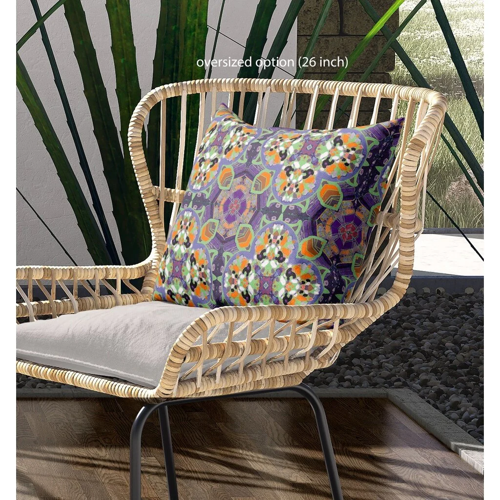 Let the contrasting hues of this Purple Orange Cloverleaf Indoor Outdoor Throw Pillow enliven your living space with a sense of warmth and vibrance. The gorgeous purple-toned background is teeming with intricate cloverleaf and geometric patterns featuring pastel green and bright orange shades for visual interest. Crafted from high-quality broadcloth fabric which is smooth and glossy to give a plush appearance to the pillow while being durable to last for a long time. Ideal for indoor and outdoor settings, this zippered pillow features a soft polyfill insert that makes it super soft and cozy to rest your head or support your back for maximum comfort. A piece of art on its own, this colorful throw pillow is sure to spruce up any modern or bohemian home. 16" x 16" x 5"