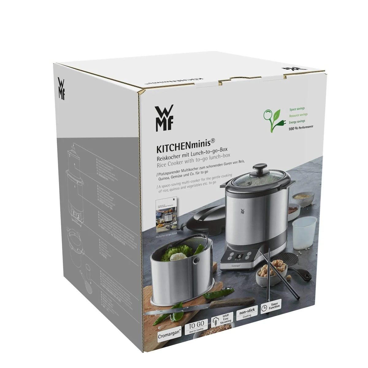 Rice cooker with compact dimensions to save space made of high quality Cromargan stainless steel resistant to acids and scratches   Â
