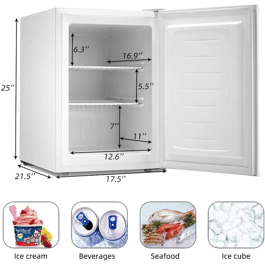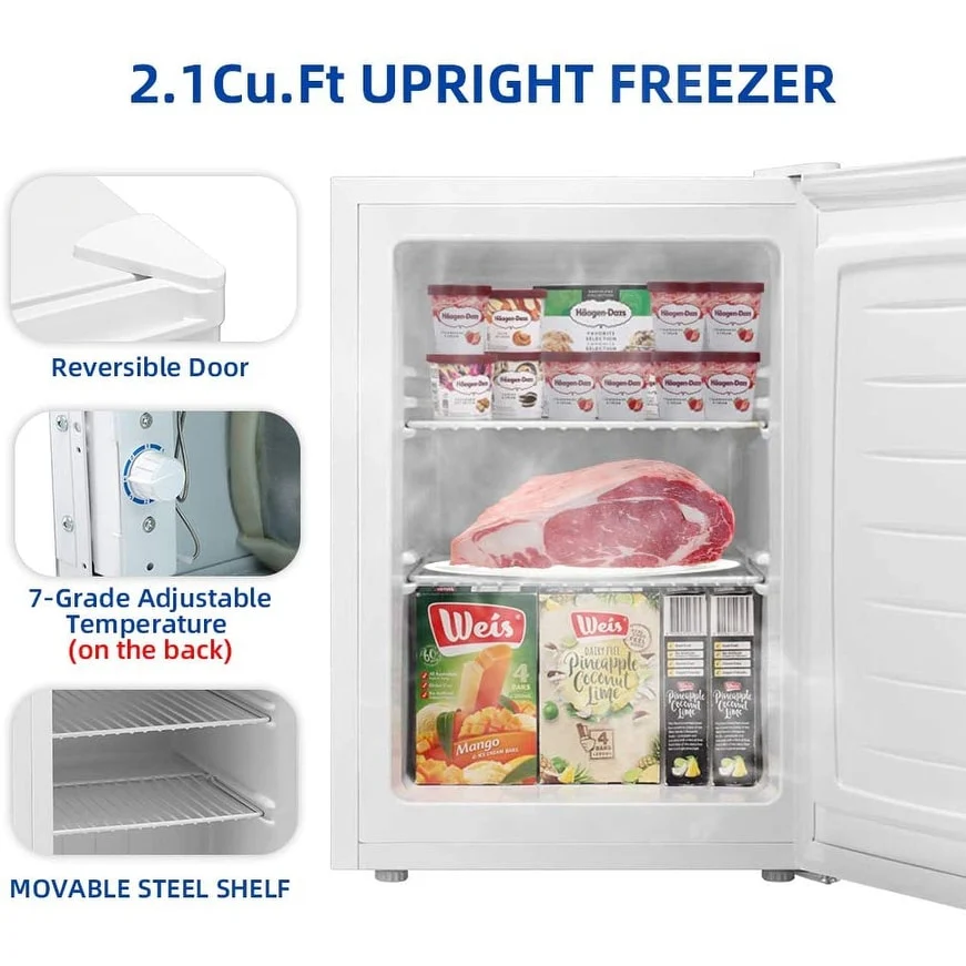 - Kismile 2.1 Cubic Feet Upright Freezer provides you with the extra storage for your frozen food needs, Ideal for your extra freezer storage needs. Simple look, simple design, small body so you can use it anywhere. The compact Freezer is perfect for dorm rooms,office break rooms, RVs, bars. Large capacity, don’t worry about not being able to hold the food ; Strong freezing power, enjoy fresh food anytime and anywhere.