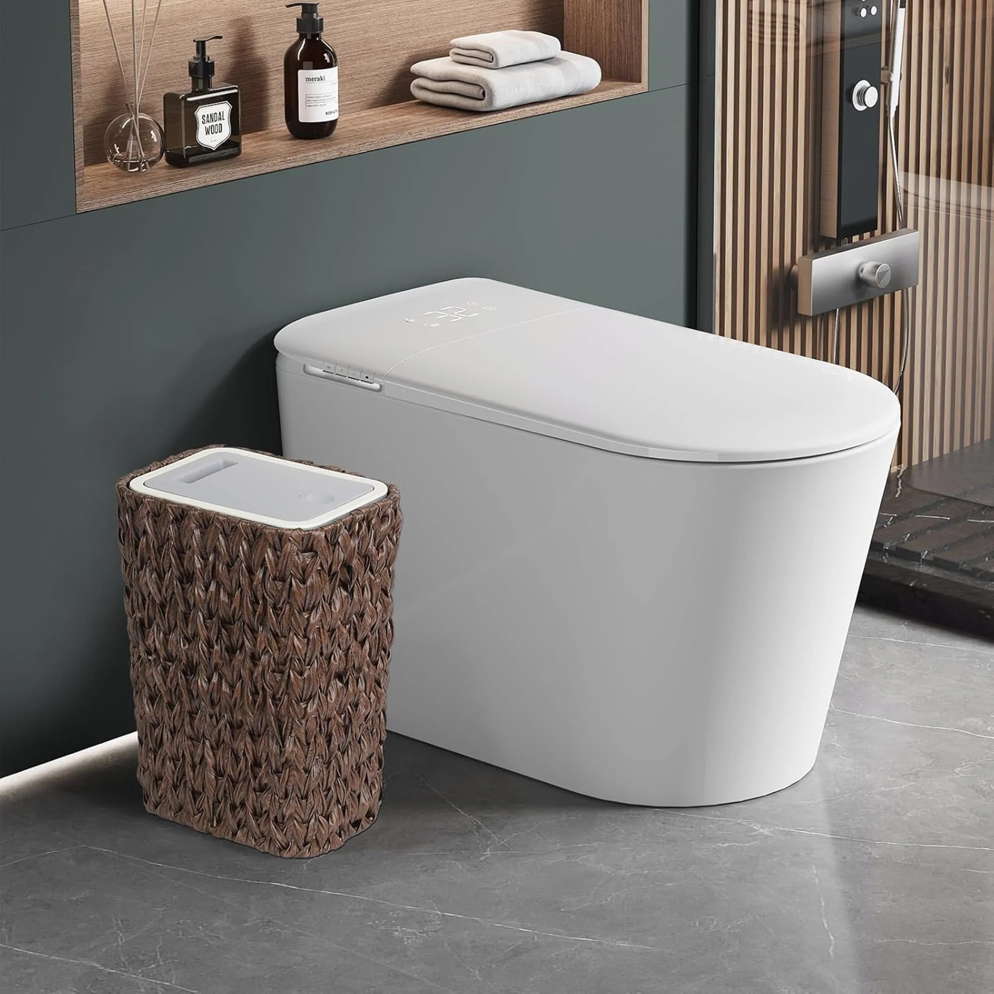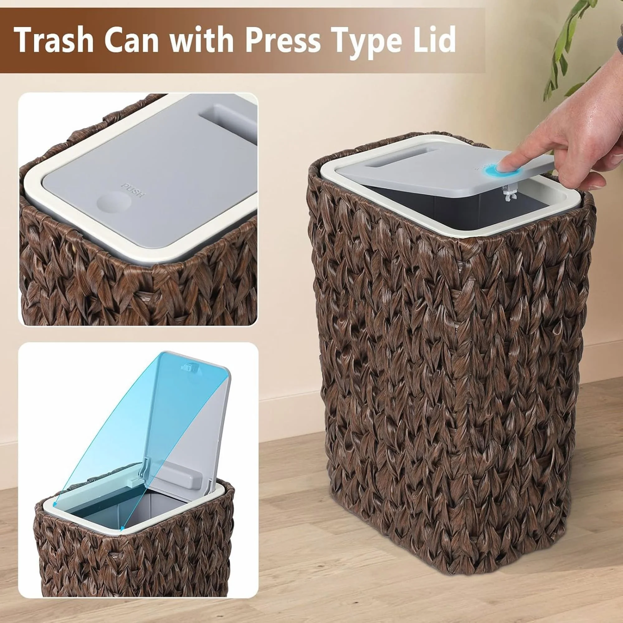 【Product Features】★【Superior Odor Control 】This small bathroom trash can with lid is neat and tidy. Clean lines and smooth surfaces of wicker trash can make it easy to keep clean and maintain. Under sink garbage can with lid traps garbage smells inside, so your space smells fresh and clean all the time. With this pop up kitchen trash can with lid, you can say goodbye to unsightly messes and unpleasant odors!★【Maximize Your Space】our slim and narrow bathroom trash can is designed to fit into tight spaces, Measuring 9.6*7.0*13.6 inches,for tight spaces such as bathrooms, bedrooms, or small kitchens. Slim profile of mini garbage can allows small bathroom garbage can to fit in narrow areas, while contemporary design of trash can with lid and wicker style adds a touch of style to any room.★【Superior Odor Control 】This small bathroom trash can with lid is neat and tidy. Clean lines and smooth surfaces of wicker trash can make it easy to keep clean and maintain. Under sink garbage can with lid traps garbage smells inside, so your space smells fresh and clean all the time. With this pop up kitchen trash can with lid, you can say goodbye to unsightly messes and unpleasant odors!★【Versatile and Practical】Whether you need a small trash bin for your bathroom, bedroom, or office, our 2.6-gallon office trash can is a perfect choice. It’s lightweight and easy to move, and you can also disassemble it into a rattan wastebasket and kitchen trash can at any time, which can meet all your needs in any case.【Keep it looking its best】1.Fabric furniture Care;Dust regularly. Clean gently with a clean, slightly damp cloth. Professional cleaning is recommended.2.Wood Furniture Care:We recommend dusting frequently with a clean, soft, dry, lint-free cloth. Clean the surface by rubbing in the direction of the grain and wipe dry.3.Avoid direct sunlight.4.Avoid the use of all chemicals, household cleaners, abrasives, or cleaners that contain lemon, vinegar, or other acids that may damage the finish.5.Do not place hot appliances, such as curling irons and hot hair dryers directly on the countertop.6.Spot clean using distilled water and water-based cleaning agents, foam or mild water-free cleaning solvents. 7.Always test a small inconspicuous area first.8.Hardware may loosen over time; periodically check to make sure all connections are tight【Notes】1.Size Notice:Manual measurement has been used, there may be some reasonable errort, thanks for your understanding.2.Color Notice:Due to factors such as display equipment and shooting environment, the color of the item may be slightly different from the picture, which is a normal phenomenon, please refer to the actual item3.Assembly Notice:Please read assemble manual in advance. Please do not over-tighten nuts, as this may cause distortion or breakage.4.It is recommended to put a layer of foam or soft cushion on the floor when installing to avoid scratching the floor.5.If the item has any defects, damage or missing parts, please contact us with pictures or videos so that we can understand your needs and help you quickly, and always remember to retain its original packaging to ensure any return requests. We will try our best to solve any problems you may have.6.If you receive the wrong product, please attach the product picture, the infographic of the outer package and the picture containing SKUs, so that we can verify and quickly deal with it for you