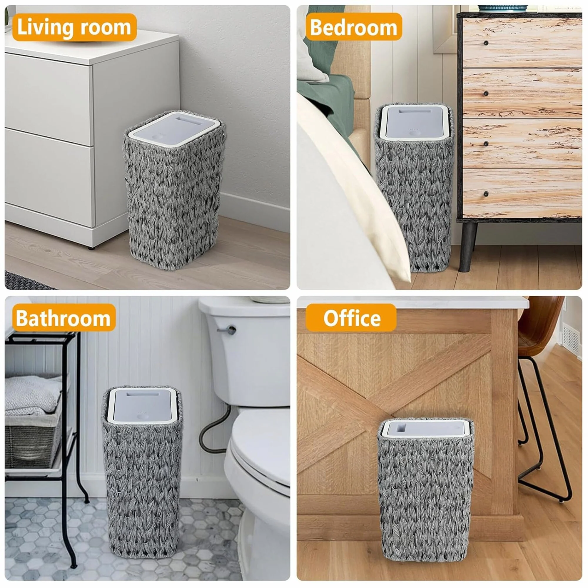【Product Features】★【Maximize Your Space】our slim and narrow bathroom trash can is designed to fit into tight spaces, Measuring 9.6*7.0*13.6 inches,for tight spaces such as bathrooms, bedrooms, or small kitchens. Slim profile of mini garbage can allows small bathroom garbage can to fit in narrow areas, while contemporary design of trash can with lid and wicker style adds a touch of style to any room.★【Superior Odor Control 】This small bathroom trash can with lid is neat and tidy. Clean lines and smooth surfaces of wicker trash can make it easy to keep clean and maintain. Under sink garbage can with lid traps garbage smells inside, so your space smells fresh and clean all the time. With this pop up kitchen trash can with lid, you can say goodbye to unsightly messes and unpleasant odors!★【Dog Proof Pop-up Lid Trash Can】Effortless Press-up Lid – Enjoy the convenience of our dog proof trash can with its innovative pop-up lid. Need press the lid to open or close it, This feature of slim bathroom garbage can is especially helpful for households with curious pets that tend to knock over or rummage through dog proof diaper trash can.★【Versatile and Practical】Whether you need a small trash bin for your bathroom, bedroom, or office, our 2.6-gallon office trash can is a perfect choice. It’s lightweight and easy to move, and you can also disassemble it into a rattan wastebasket and kitchen trash can at any time, which can meet all your needs in any case.【Keep it looking its best】1.Fabric furniture Care;Dust regularly. Clean gently with a clean, slightly damp cloth. Professional cleaning is recommended.2.Wood Furniture Care:We recommend dusting frequently with a clean, soft, dry, lint-free cloth. Clean the surface by rubbing in the direction of the grain and wipe dry.3.Avoid direct sunlight.4.Avoid the use of all chemicals, household cleaners, abrasives, or cleaners that contain lemon, vinegar, or other acids that may damage the finish.5.Do not place hot appliances, such as curling irons and hot hair dryers directly on the countertop.6.Spot clean using distilled water and water-based cleaning agents, foam or mild water-free cleaning solvents. 7.Always test a small inconspicuous area first.8.Hardware may loosen over time; periodically check to make sure all connections are tight【Notes】1.Size Notice:Manual measurement has been used, there may be some reasonable errort, thanks for your understanding.2.Color Notice:Due to factors such as display equipment and shooting environment, the color of the item may be slightly different from the picture, which is a normal phenomenon, please refer to the actual item3.Assembly Notice:Please read assemble manual in advance. Please do not over-tighten nuts, as this may cause distortion or breakage.4.It is recommended to put a layer of foam or soft cushion on the floor when installing to avoid scratching the floor.5.If the item has any defects, damage or missing parts, please contact us with pictures or videos so that we can understand your needs and help you quickly, and always remember to retain its original packaging to ensure any return requests. We will try our best to solve any problems you may have.6.If you receive the wrong product, please attach the product picture, the infographic of the outer package and the picture containing SKUs, so that we can verify and quickly deal with it for you