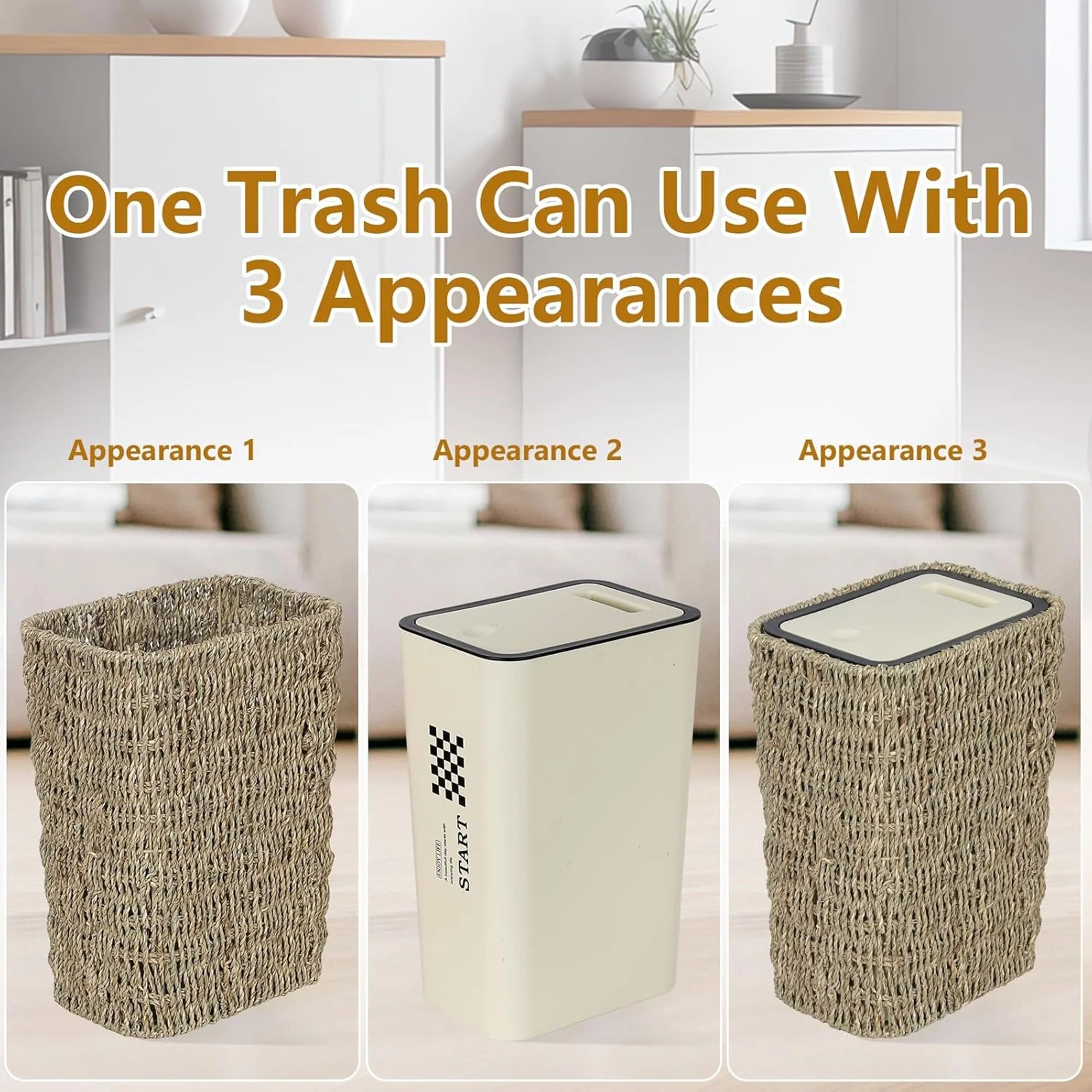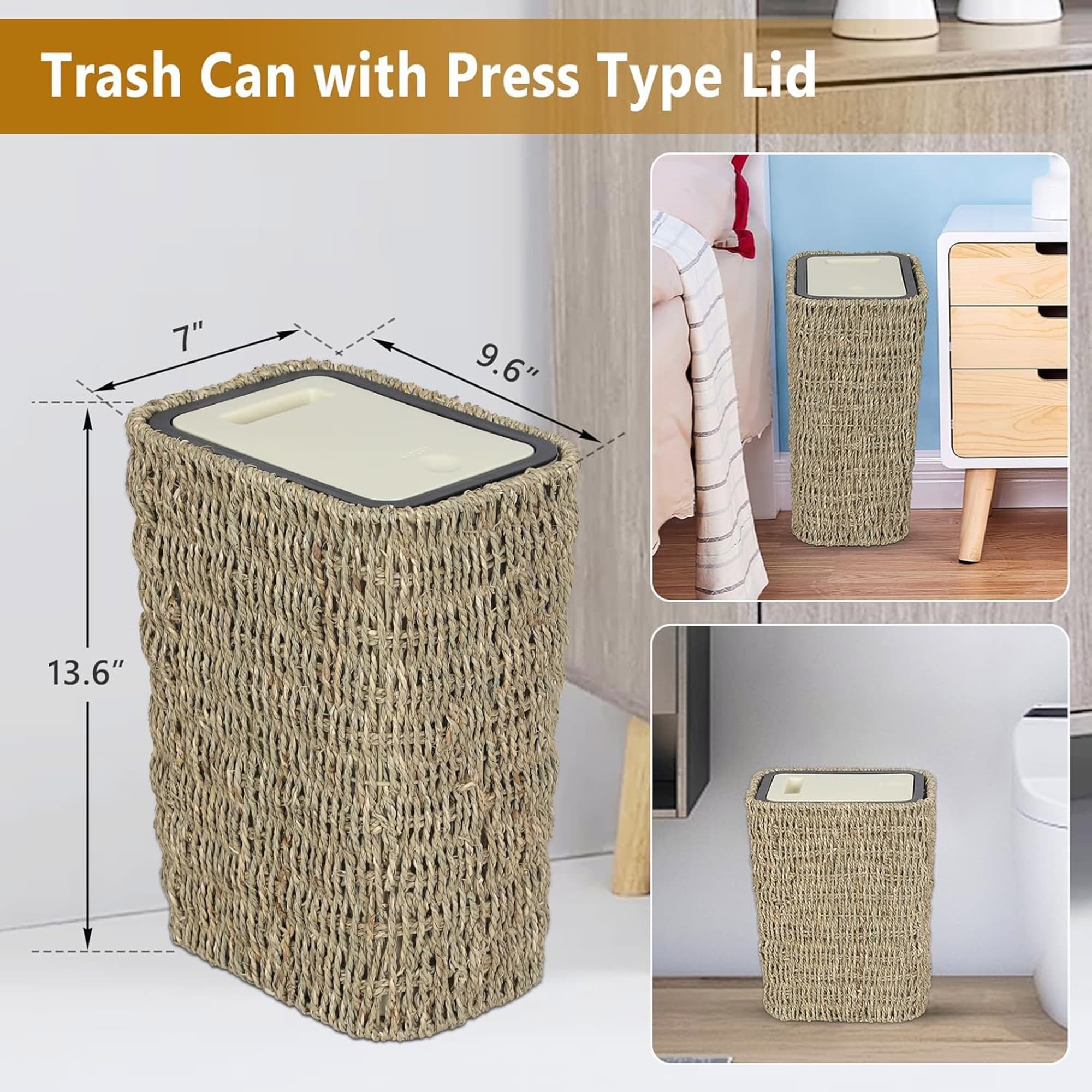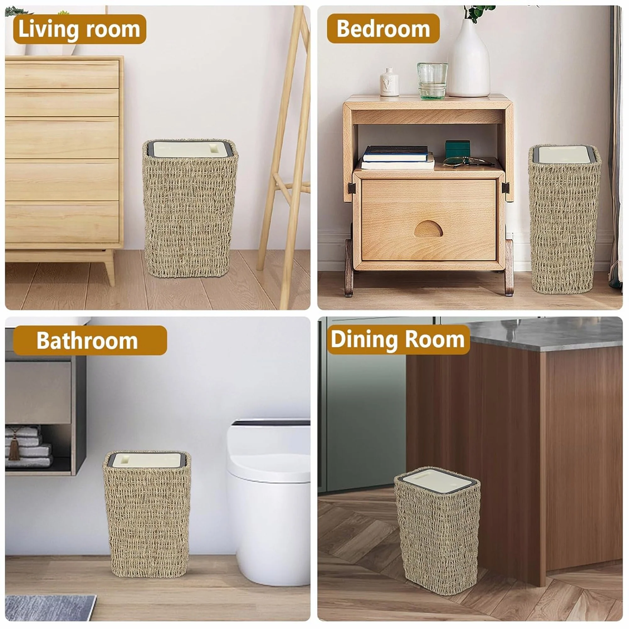 【Product Features】★【Maximize Your Space】our slim and narrow 3-pack bathroom trash can is designed to fit into tight spaces, Measuring 9.6*7.0*13.6 inches,for tight spaces such as bathrooms, bedrooms, or small kitchens. Slim profile of mini trash can allows small bedroom trash can to fit in narrow areas, while contemporary design of compost bin and wicker style adds a touch of style to any room.★【Superior Odor Control 】This wicker basket is neat and tidy. Clean lines and smooth surfaces of diaper trash can make it easy to keep clean and maintain. Under sink trash can traps garbage smells inside, so your space smells fresh and clean all the time. With this pop up trash can with lid, you can say goodbye to unsightly messes and unpleasant odors!★【Waste Basket and Laundry Hamper 2 in1】Whether you need a small bin for your bathroom, bedroom, or office, our 3-gallon wastebasket is a perfect choice. you can disassemble it into a rattan laundry hamper and kitchen trash can at any time, The combination of multiple functions can meet your needs in all aspects.★【Dog Proof Pop-up Lid Trash Can】Effortless Press-up Lid – Enjoy the convenience of our small trash can with its innovative pop-up lid. Need press the lid to open or close it, This feature of slim bathroom garbage can is especially helpful for households with curious pets that tend to knock over or rummage through dog proof trash can.【Keep it looking its best】1.Fabric furniture Care;Dust regularly. Clean gently with a clean, slightly damp cloth. Professional cleaning is recommended.2.Wood Furniture Care:We recommend dusting frequently with a clean, soft, dry, lint-free cloth. Clean the surface by rubbing in the direction of the grain and wipe dry.3.Avoid direct sunlight.4.Avoid the use of all chemicals, household cleaners, abrasives, or cleaners that contain lemon, vinegar, or other acids that may damage the finish.5.Do not place hot appliances, such as curling irons and hot hair dryers directly on the countertop.6.Spot clean using distilled water and water-based cleaning agents, foam or mild water-free cleaning solvents. 7.Always test a small inconspicuous area first.8.Hardware may loosen over time; periodically check to make sure all connections are tight【Notes】1.Size Notice:Manual measurement has been used, there may be some reasonable errort, thanks for your understanding.2.Color Notice:Due to factors such as display equipment and shooting environment, the color of the item may be slightly different from the picture, which is a normal phenomenon, please refer to the actual item3.Assembly Notice:Please read assemble manual in advance. Please do not over-tighten nuts, as this may cause distortion or breakage.4.It is recommended to put a layer of foam or soft cushion on the floor when installing to avoid scratching the floor.5.If the item has any defects, damage or missing parts, please contact us with pictures or videos so that we can understand your needs and help you quickly, and always remember to retain its original packaging to ensure any return requests. We will try our best to solve any problems you may have.6.If you receive the wrong product, please attach the product picture, the infographic of the outer package and the picture containing SKUs, so that we can verify and quickly deal with it for you
