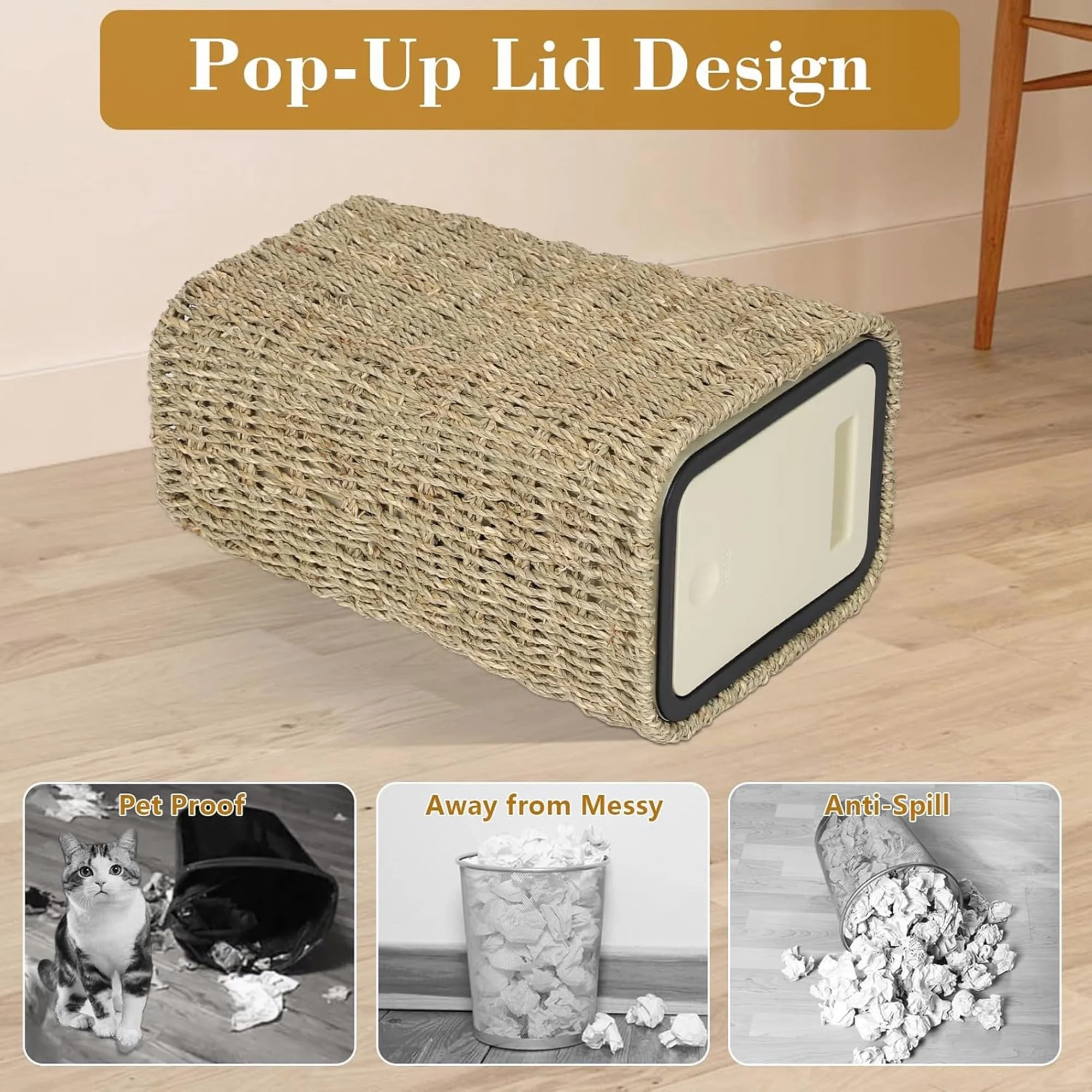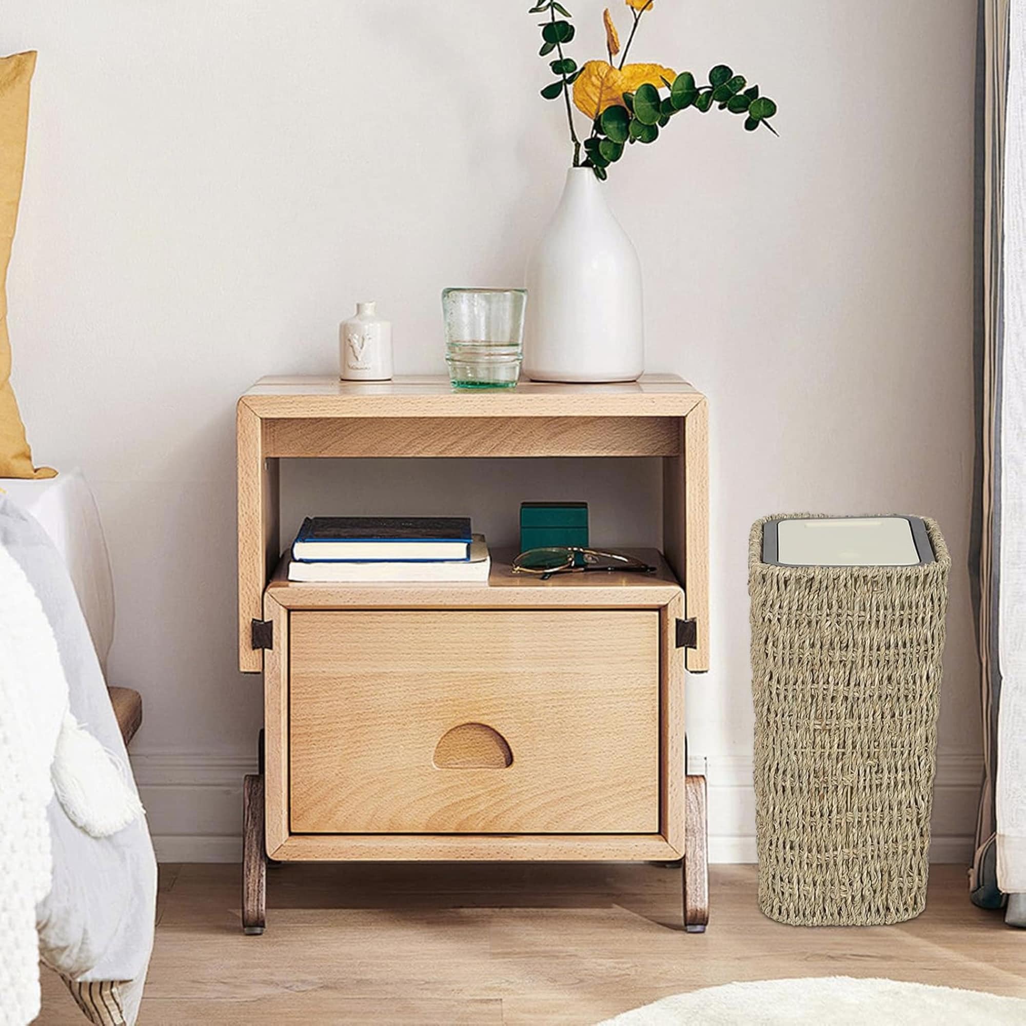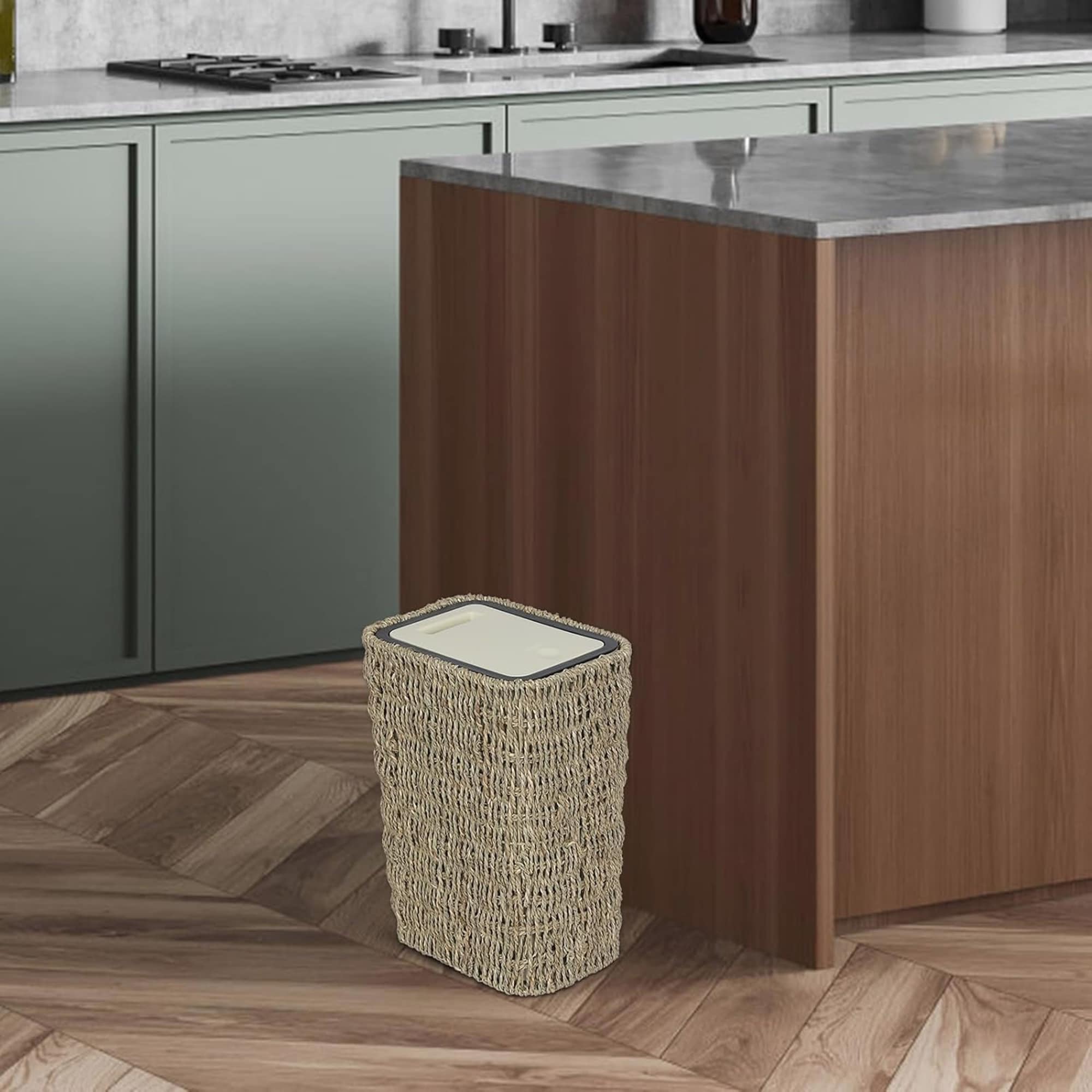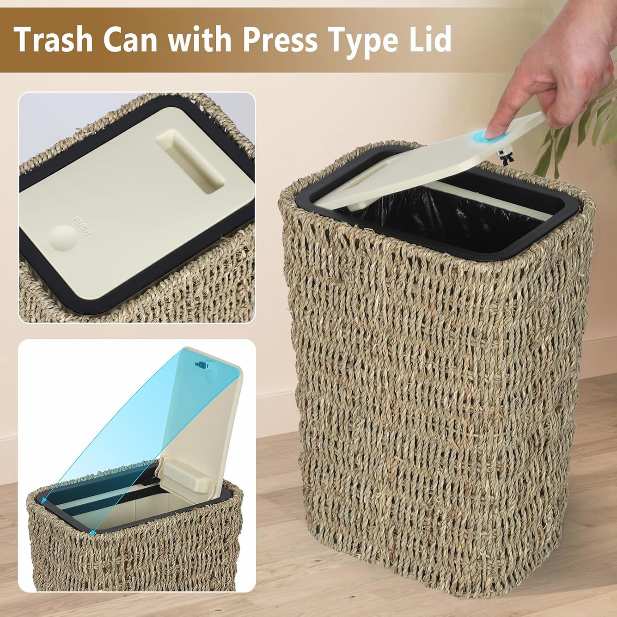 【Product Features】★【Maximize Your Space】our slim and narrow 3-pack bathroom trash can is designed to fit into tight spaces, Measuring 9.6*7.0*13.6 inches,for tight spaces such as bathrooms, bedrooms, or small kitchens. Slim profile of mini trash can allows small bedroom trash can to fit in narrow areas, while contemporary design of compost bin and wicker style adds a touch of style to any room.★【Superior Odor Control 】This wicker basket is neat and tidy. Clean lines and smooth surfaces of diaper trash can make it easy to keep clean and maintain. Under sink trash can traps garbage smells inside, so your space smells fresh and clean all the time. With this pop up trash can with lid, you can say goodbye to unsightly messes and unpleasant odors!★【Waste Basket and Laundry Hamper 2 in1】Whether you need a small bin for your bathroom, bedroom, or office, our 3-gallon wastebasket is a perfect choice. you can disassemble it into a rattan laundry hamper and kitchen trash can at any time, The combination of multiple functions can meet your needs in all aspects.★【Dog Proof Pop-up Lid Trash Can】Effortless Press-up Lid – Enjoy the convenience of our small trash can with its innovative pop-up lid. Need press the lid to open or close it, This feature of slim bathroom garbage can is especially helpful for households with curious pets that tend to knock over or rummage through dog proof trash can.【Keep it looking its best】1.Fabric furniture Care;Dust regularly. Clean gently with a clean, slightly damp cloth. Professional cleaning is recommended.2.Wood Furniture Care:We recommend dusting frequently with a clean, soft, dry, lint-free cloth. Clean the surface by rubbing in the direction of the grain and wipe dry.3.Avoid direct sunlight.4.Avoid the use of all chemicals, household cleaners, abrasives, or cleaners that contain lemon, vinegar, or other acids that may damage the finish.5.Do not place hot appliances, such as curling irons and hot hair dryers directly on the countertop.6.Spot clean using distilled water and water-based cleaning agents, foam or mild water-free cleaning solvents. 7.Always test a small inconspicuous area first.8.Hardware may loosen over time; periodically check to make sure all connections are tight【Notes】1.Size Notice:Manual measurement has been used, there may be some reasonable errort, thanks for your understanding.2.Color Notice:Due to factors such as display equipment and shooting environment, the color of the item may be slightly different from the picture, which is a normal phenomenon, please refer to the actual item3.Assembly Notice:Please read assemble manual in advance. Please do not over-tighten nuts, as this may cause distortion or breakage.4.It is recommended to put a layer of foam or soft cushion on the floor when installing to avoid scratching the floor.5.If the item has any defects, damage or missing parts, please contact us with pictures or videos so that we can understand your needs and help you quickly, and always remember to retain its original packaging to ensure any return requests. We will try our best to solve any problems you may have.6.If you receive the wrong product, please attach the product picture, the infographic of the outer package and the picture containing SKUs, so that we can verify and quickly deal with it for you