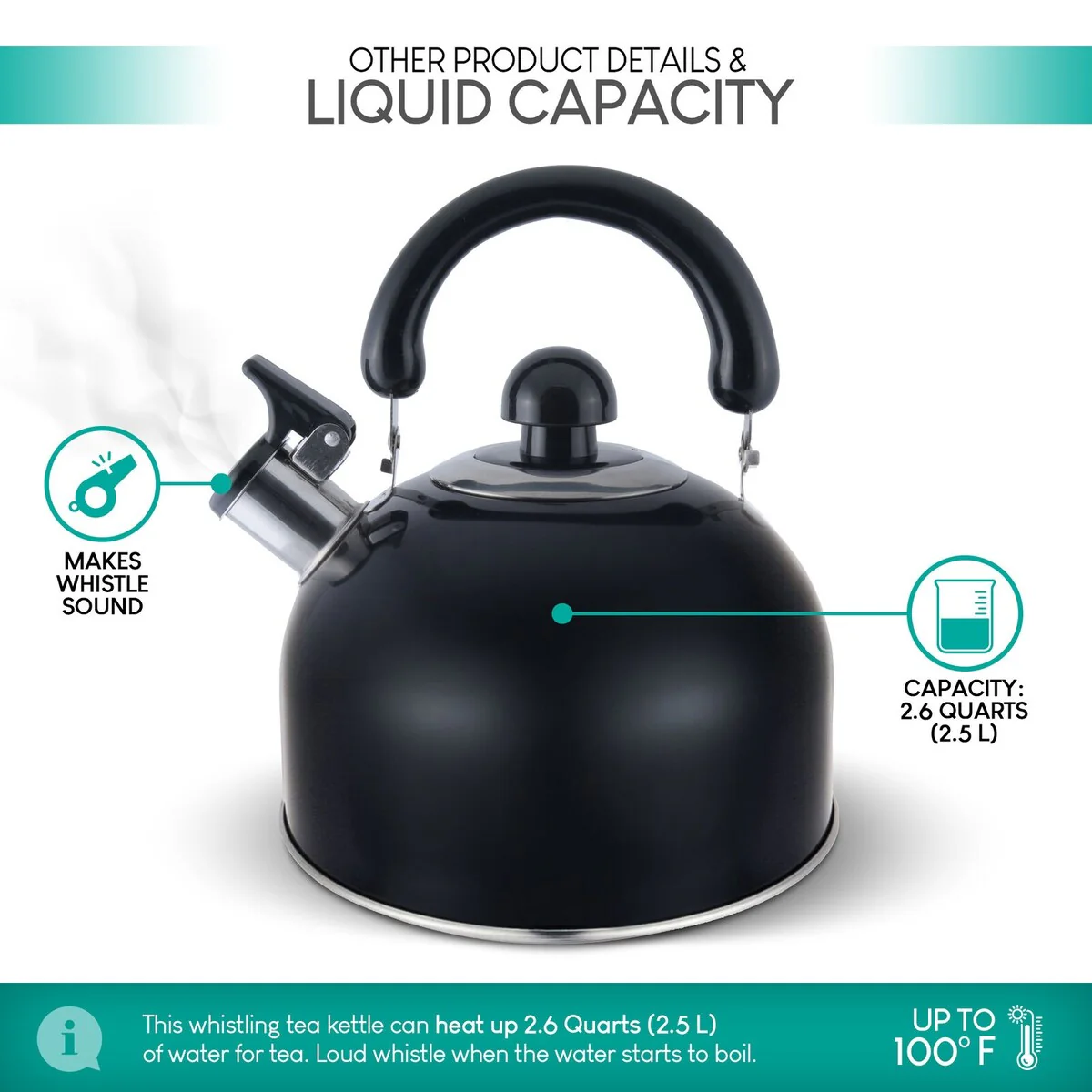- Capable of heating up 2.6 Quarts (2.5 L) of water for tea, it emits a loud whistle once the water starts to boil.