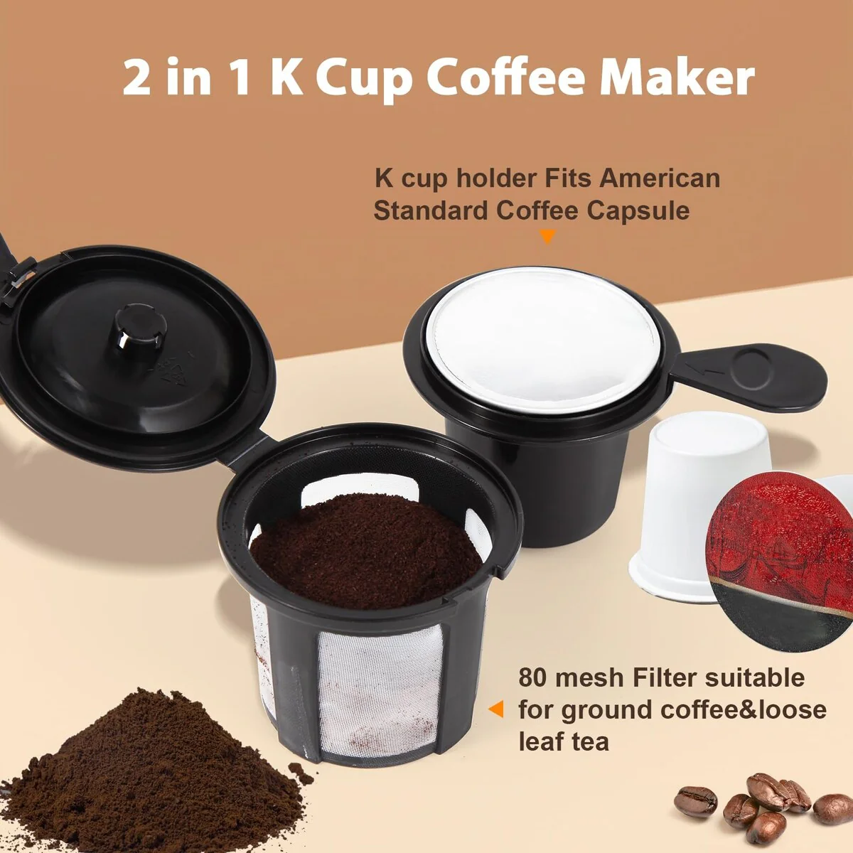 —— One machine for two purposes,If you like ground coffee or tea, you can choose to use reusable filter.If you like to use k cup capsule ,you can choose to use k cup holder.
