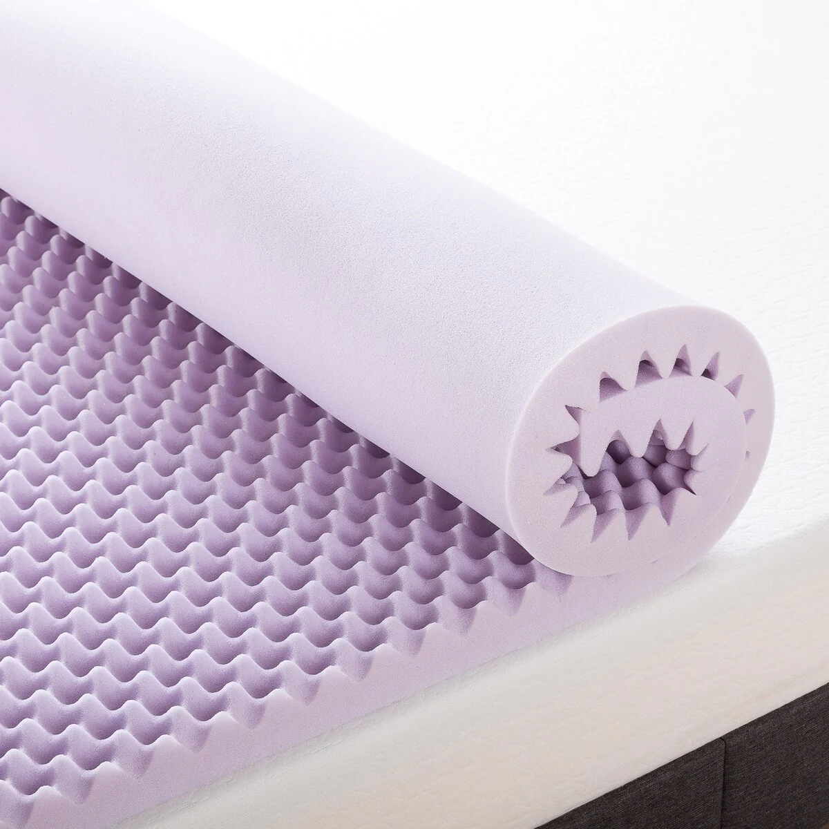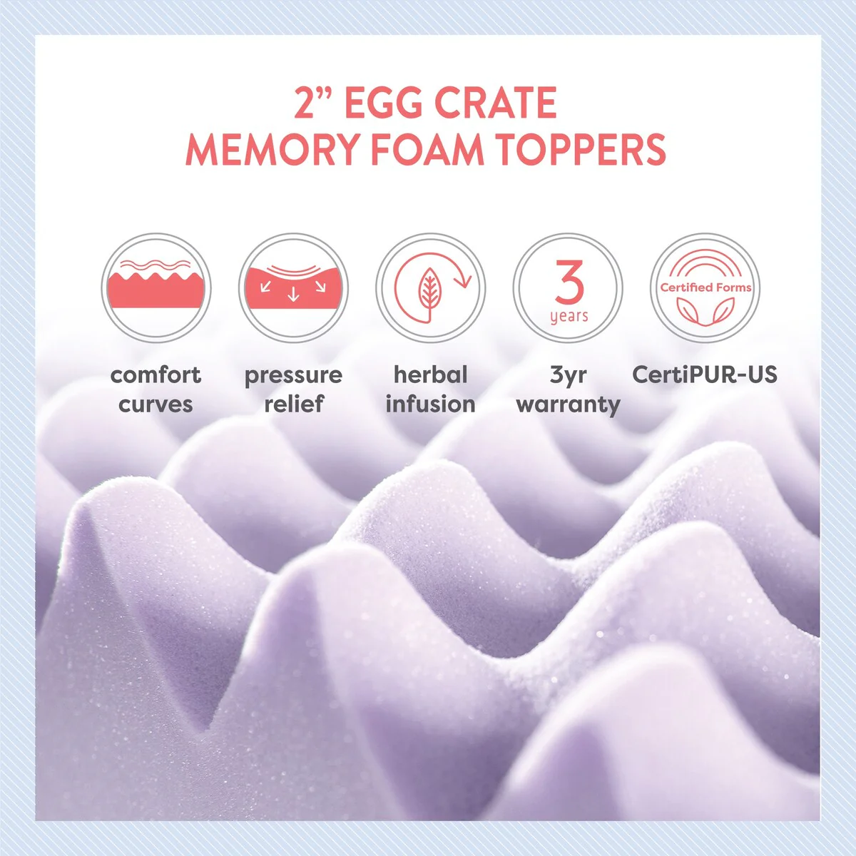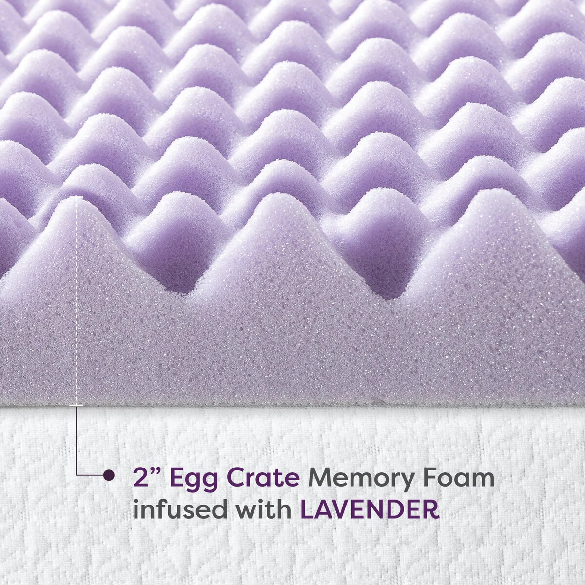 The 2-inch egg crate memory foam mattress topper provides a great sleeping surface and the perfect addition to any mattress. Once you lay down, the topper will start reacting to the temperature of your body and begin to mold itself to your shape. Your weight will be evenly distributed along the surface, relieving pressure points and helping you to sleep more without tossing and turning. The topper is also infused with lavender, ready to soothe you into a good night’s sleep. Â