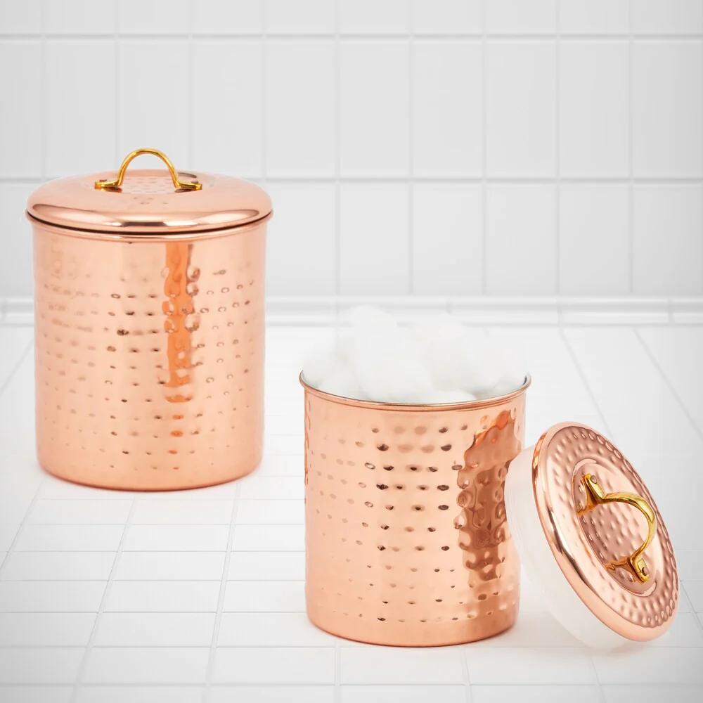 Store coffee, tea, or other pantry essentials inside this two-piece canister set. The hammered copper design offers timeless beauty, and fresh seal cover technology keeps your dry goods fresh and ready for use. This canister set features two different sizes to accommodate your favorite ingredients.