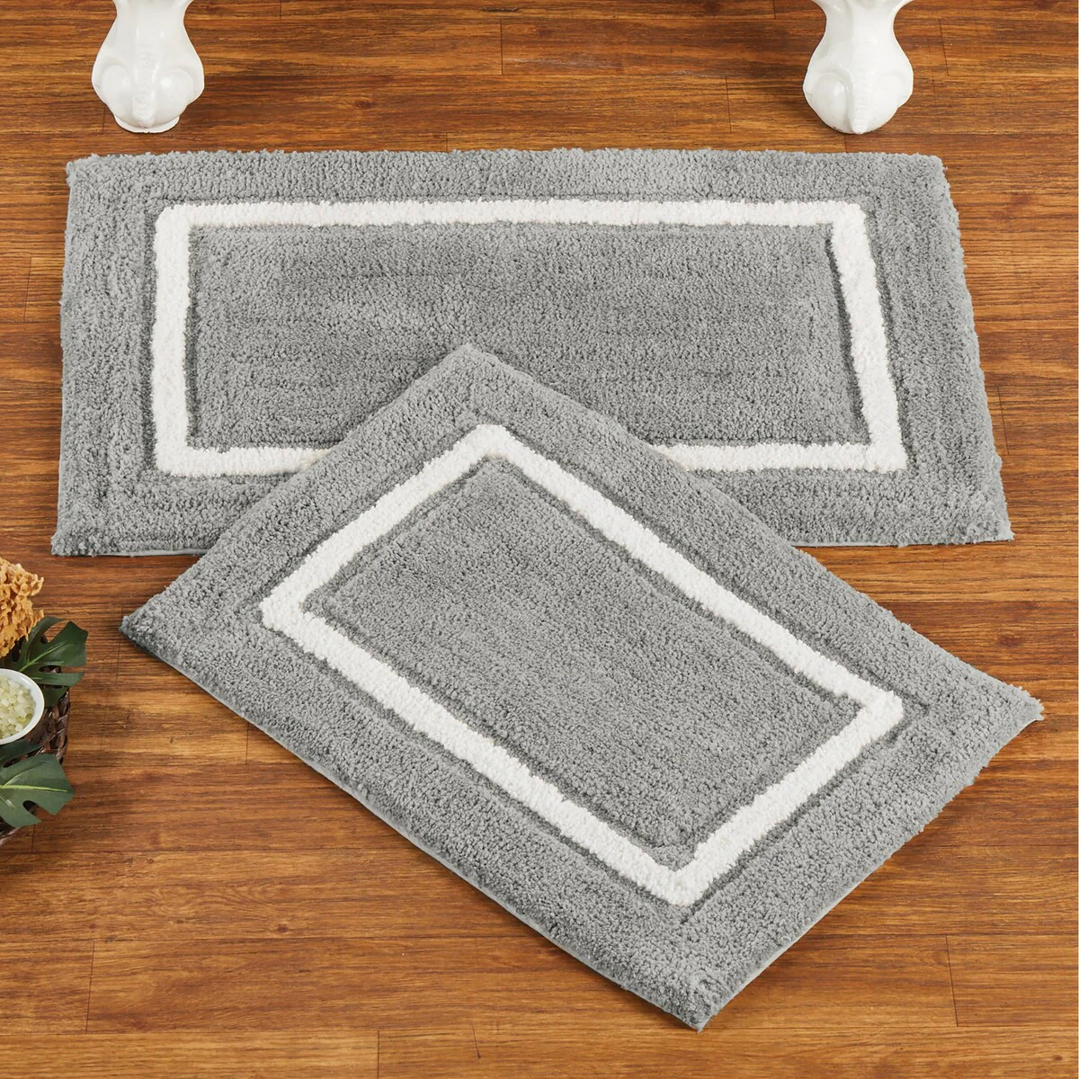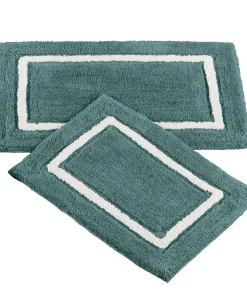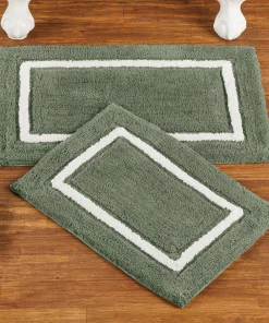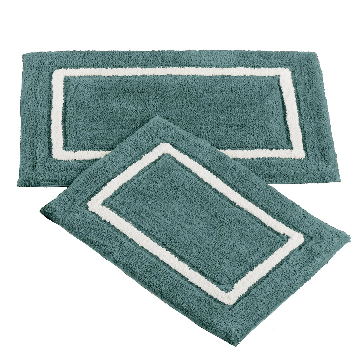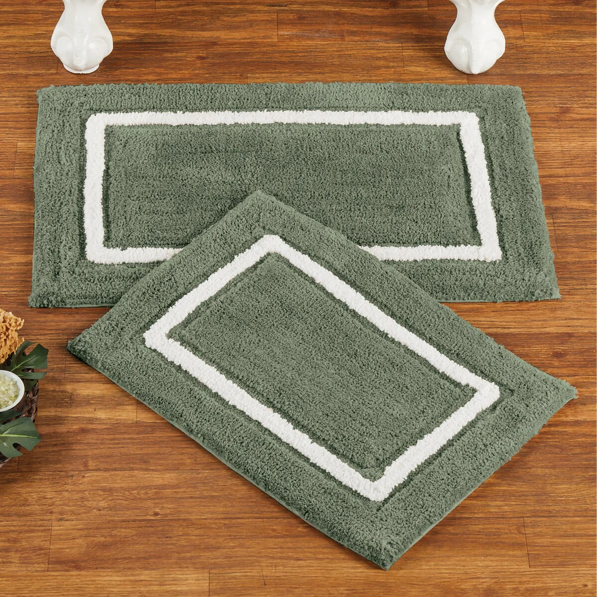These soft and absorbent bath rugs are a great way to add color and function to your bathroom. The set of 2 rugs features a white racetrack border atop a solid background. Available in 5 versatile colors, the set includes 2 sizes which are perfect to place in front of your tub and sink. Skid-resistant backing. Machine wash. Cotton and polyester; imported. Rugs are 24"L x 17"W and 30"L x 20"W. Choose: Grey, Beige, White, Blue or Sage. 2-Piece Set.