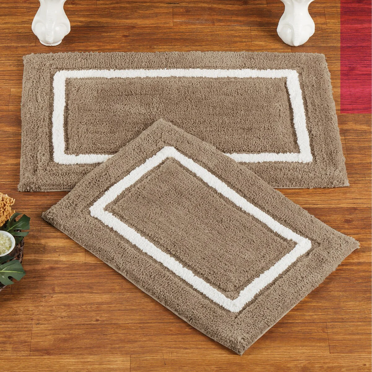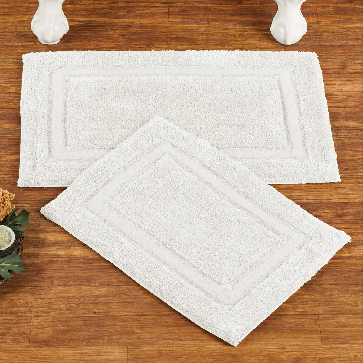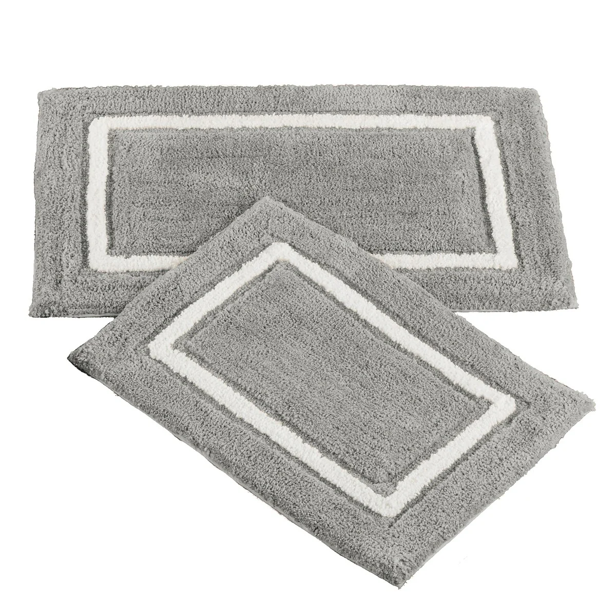 These soft and absorbent bath rugs are a great way to add color and function to your bathroom. The set of 2 rugs features a white racetrack border atop a solid background. Available in 5 versatile colors, the set includes 2 sizes which are perfect to place in front of your tub and sink. Skid-resistant backing. Machine wash. Cotton and polyester; imported. Rugs are 24"L x 17"W and 30"L x 20"W. Choose: Grey, Beige, White, Blue or Sage. 2-Piece Set.