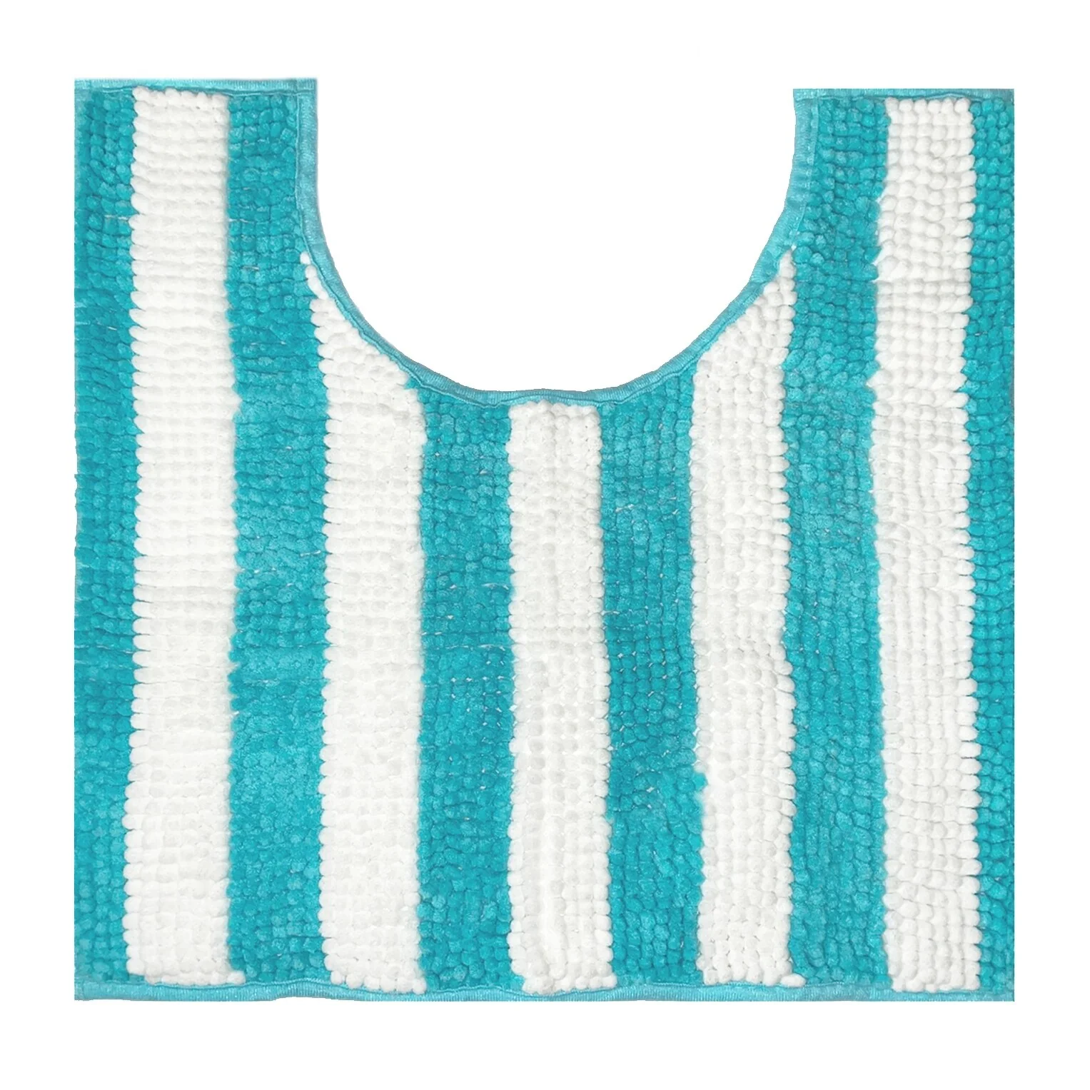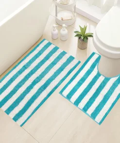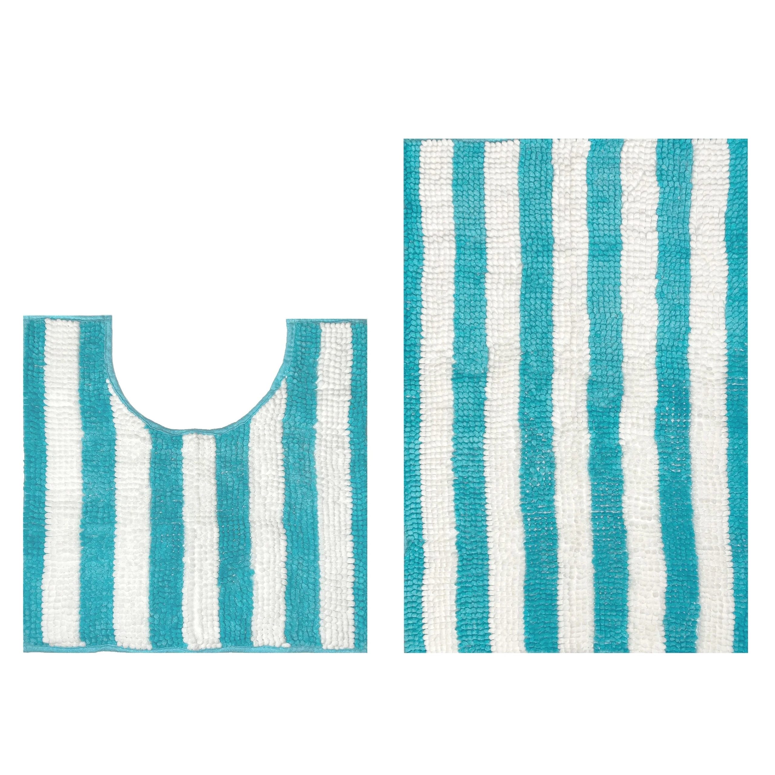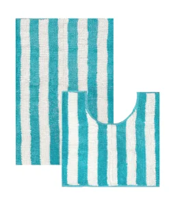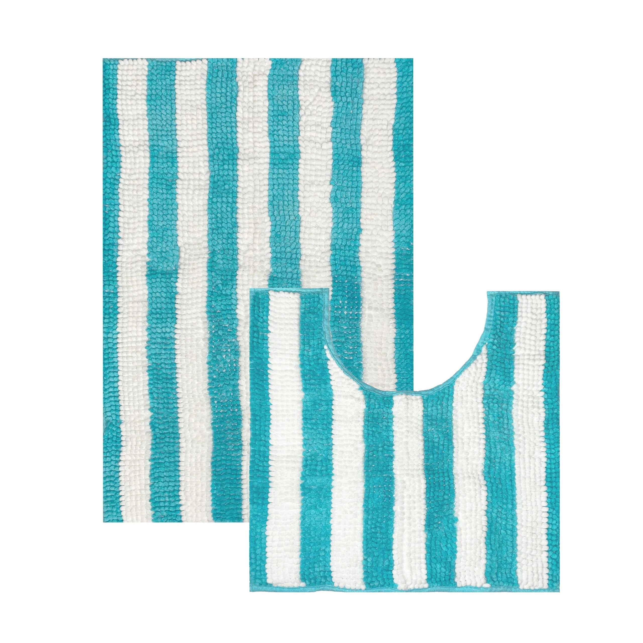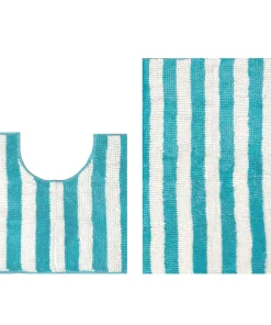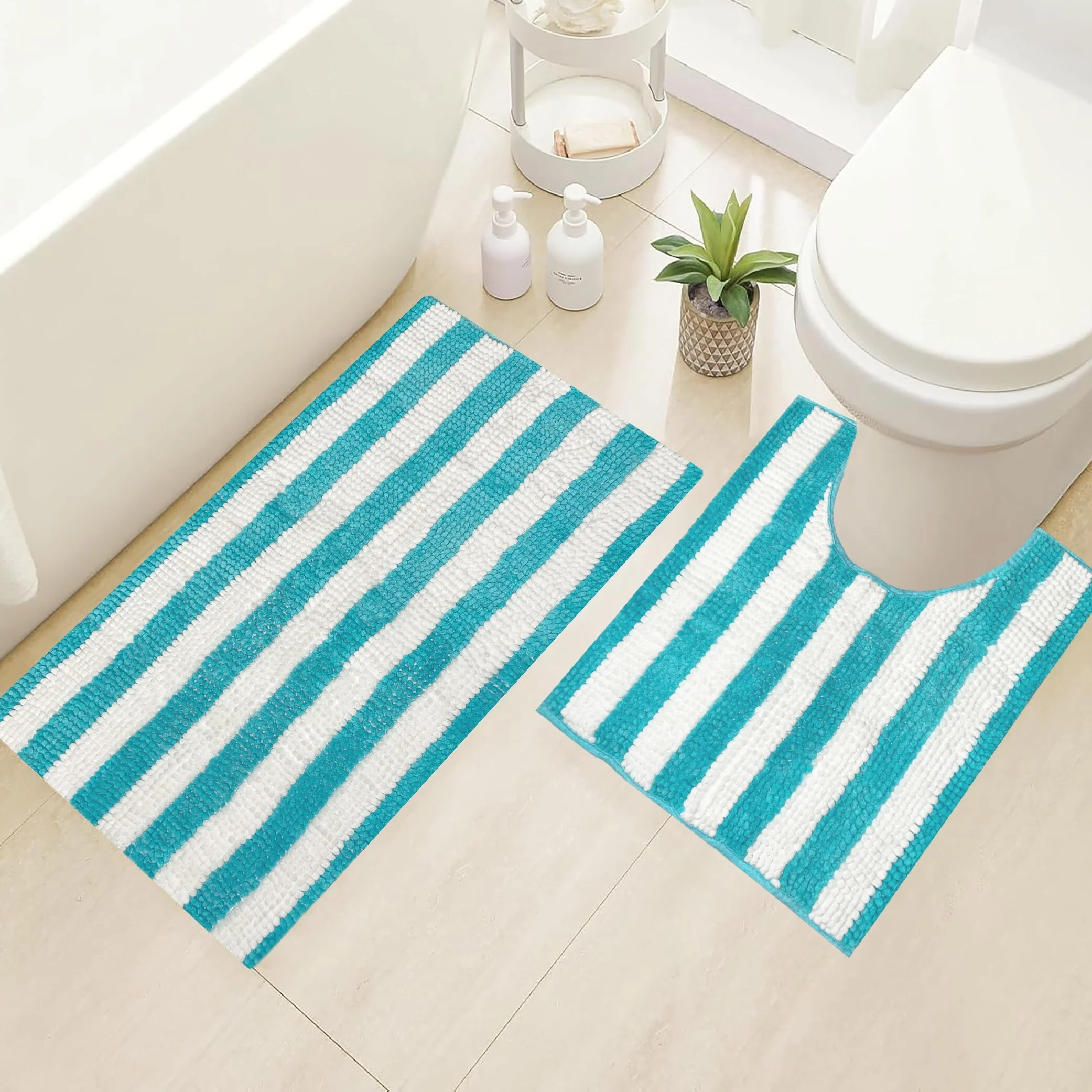 2 Piece Set Light Blue Stripe Soft Cozy Plush Chenille Bath Mat Bathroom Rug
