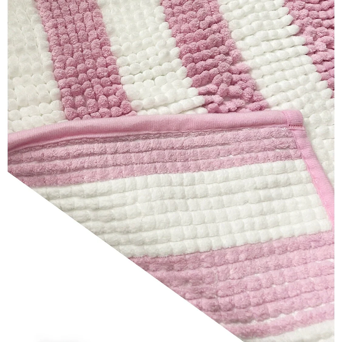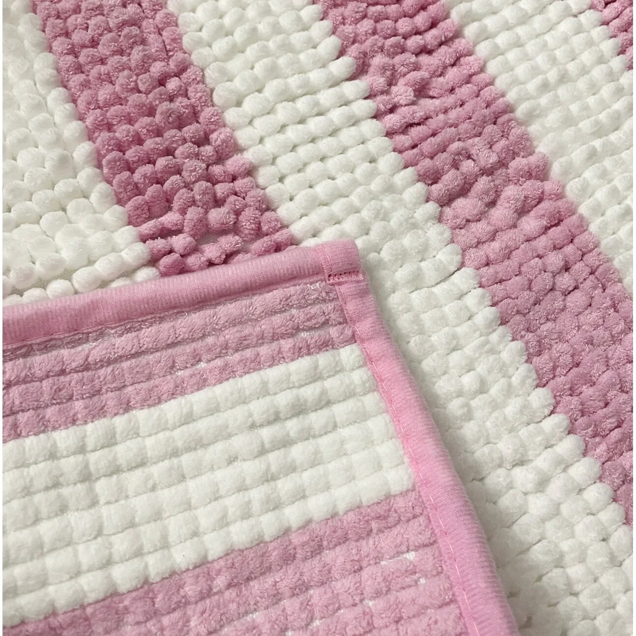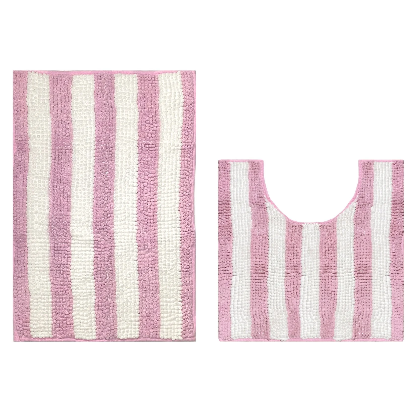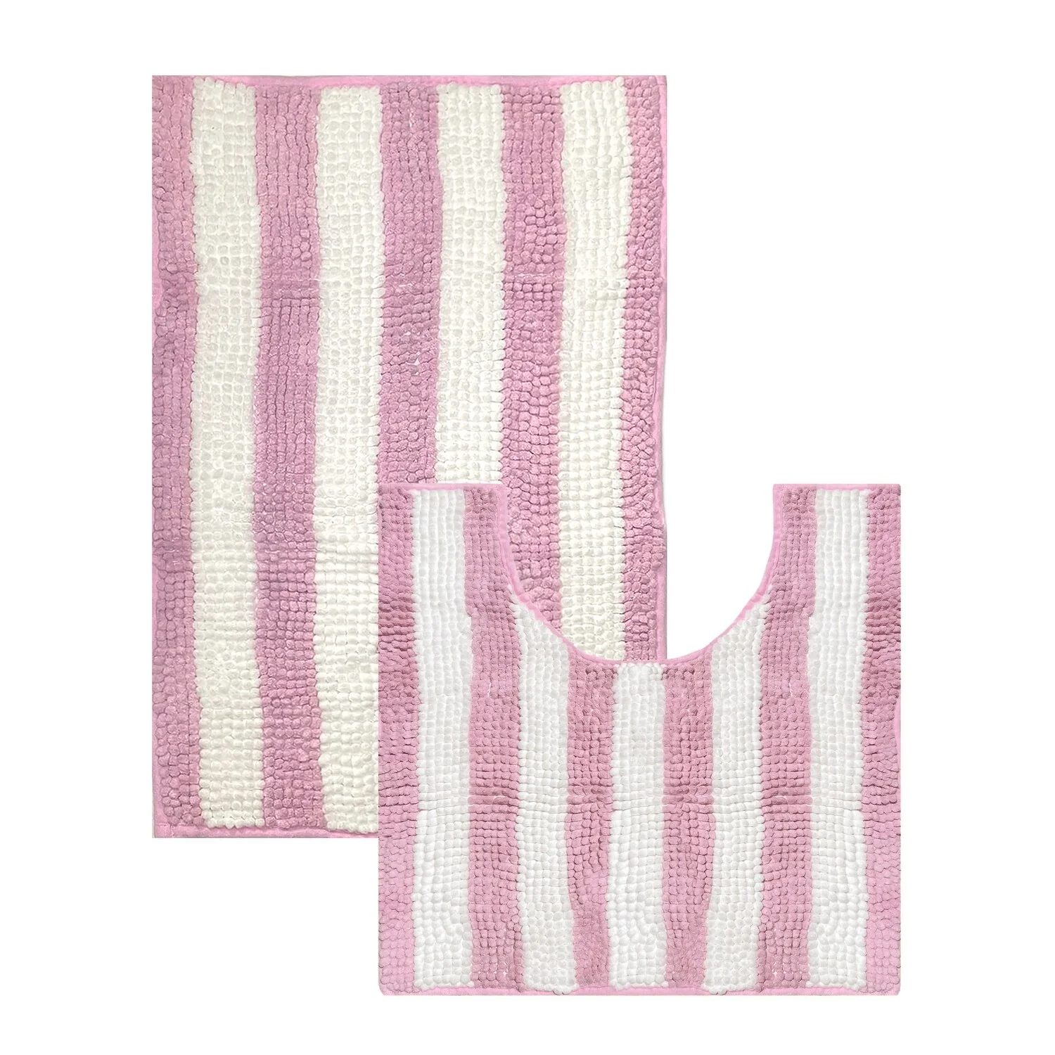 2 Piece Set Pink White Stripe Soft Cozy Plush Chenille Bath Mat Bathroom Rug