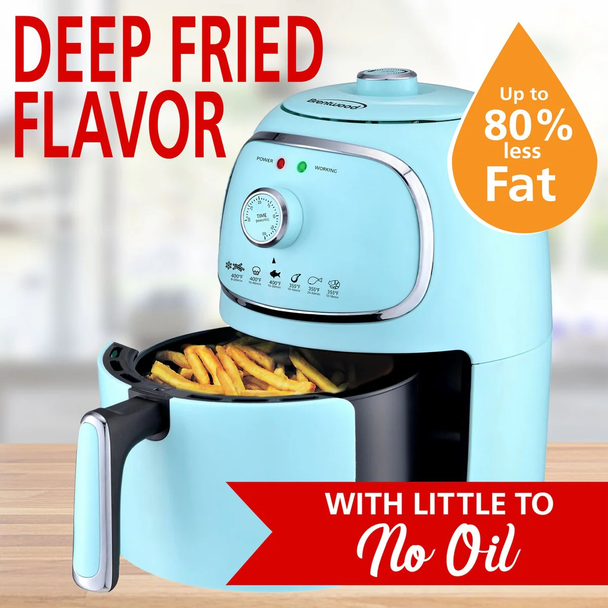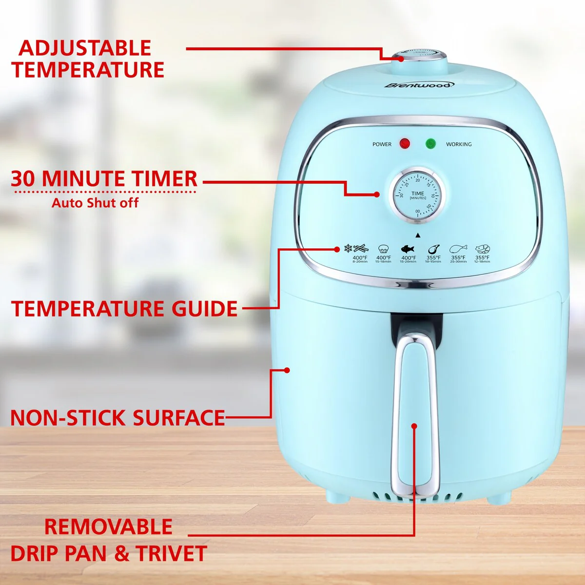 Use the powerful 2 Quart Small Electric Air Fryer to fry foods to perfection quickly and evenly without the guilt of extra fat and calories. Our air fryer requires little to no oil to beautifully cook french fries, onion rings, chicken wings, steak, roasted veggies and more. Use the quick reference temperature guide and the 30 minute timer with auto shut off for fast, crispy results. Cool touch, removable fry basket make serving easy. The frying pan and basket is made with a non-stick surface for effortless clean up.Set: Air Fryer30 Minute TimerAuto Shut OffTemp Range: 175-400 FNonstick PTFE Free SurfaceCool Touch, Removable Steel Fry BasketQuick Temp GuideColor: BluePower: 1200WCapacity: 2 QuartsCable Length: 25inSet Includes:Air Fryer with Fry BasketPer Item Measurements:Air Fryer: 10.2in length, 8in width, 11.5in height, 2qt capacity, 5.25lbs weight