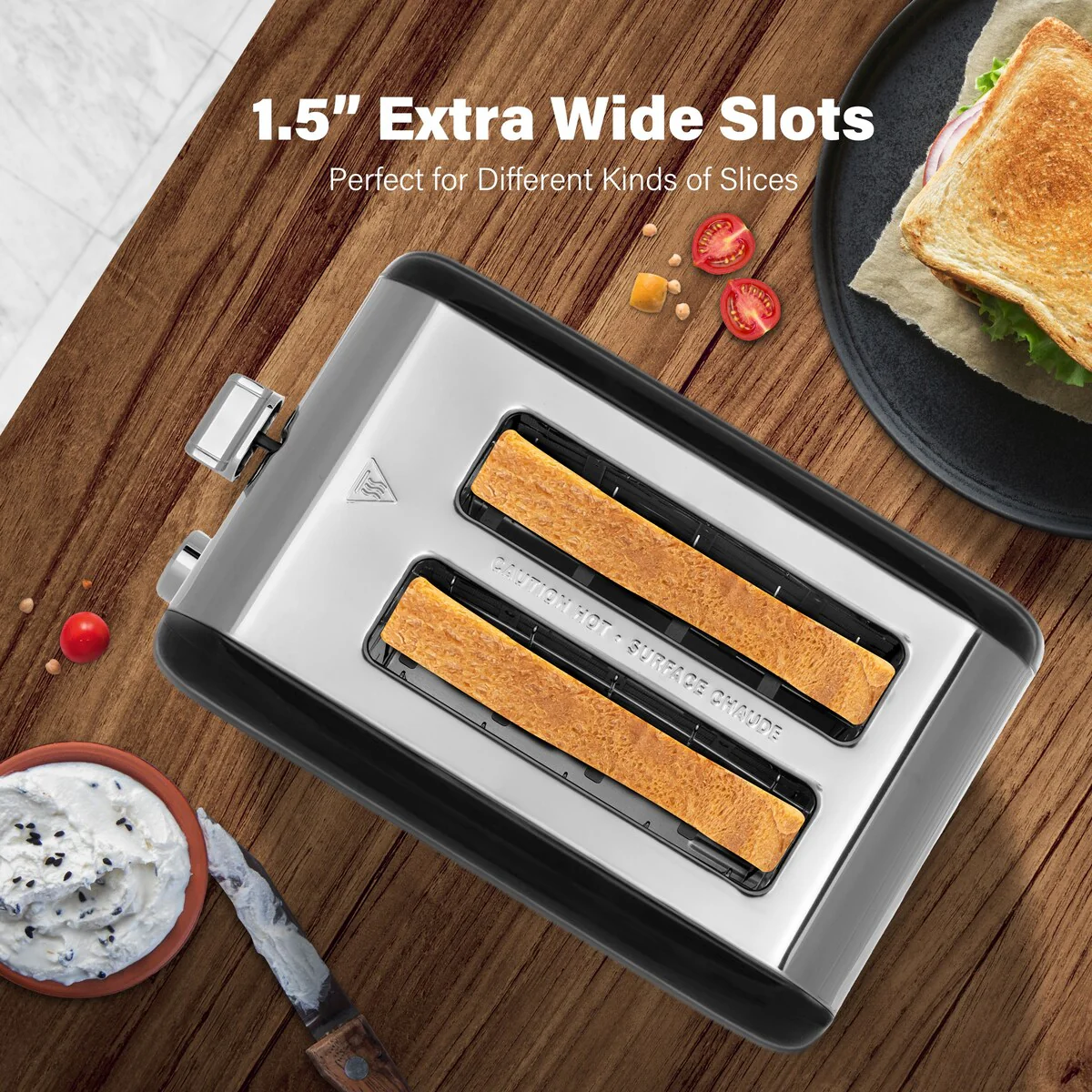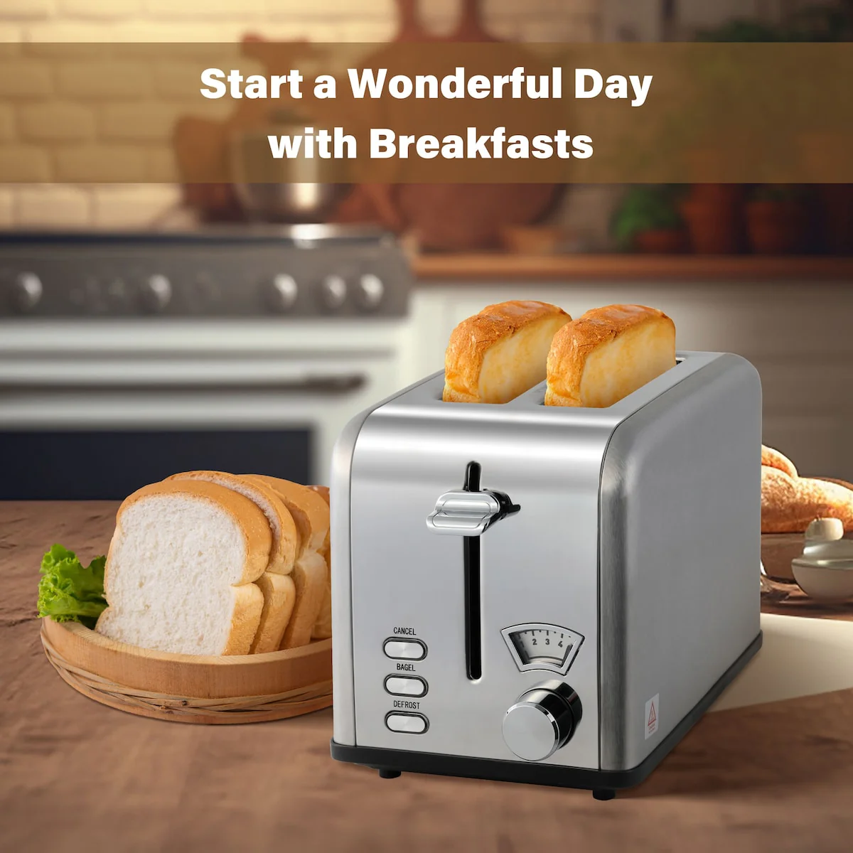 Advantage: 1.5" wide slot wider than many other 2 slice toasters, fit thicker bread and bagel. Conveniently remove and discard crumbs from the bottom with the pullout crumb tray, easy to clean. Built-in cord storage will keep clutter to a minimum. Customize Toast: Use the shade selector to make 5 kinds of lighter to darker toast. 3 functions meet your various toast needs: "Bagel" bake only one side, "Defrost" make frozen bread soft, "Cancel" helps you stop at any time. Ingenious Design: Retro style dashboard gives you 1950s feeling, fit for various decor style. The glossy design with 430 stainless steel makes it premium durability and functionality. It’s a perfect gift for your friends and family. Compact and Exquisite: Measuring Length 10.4"*Width 6.26"*Height 7", the toaster occupies a small area and fits perfectly into every corner of the kitchen. Bread Lovers: No matter you like English muffins or Texas-style toast or bagels… you can toast them all with this toaster! The wide slots fit any type of bread and help you make your breakfast easily and variously.