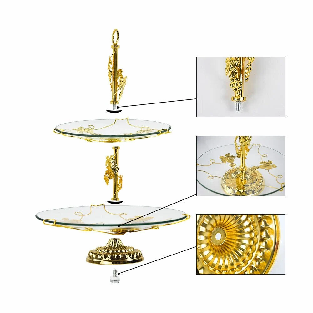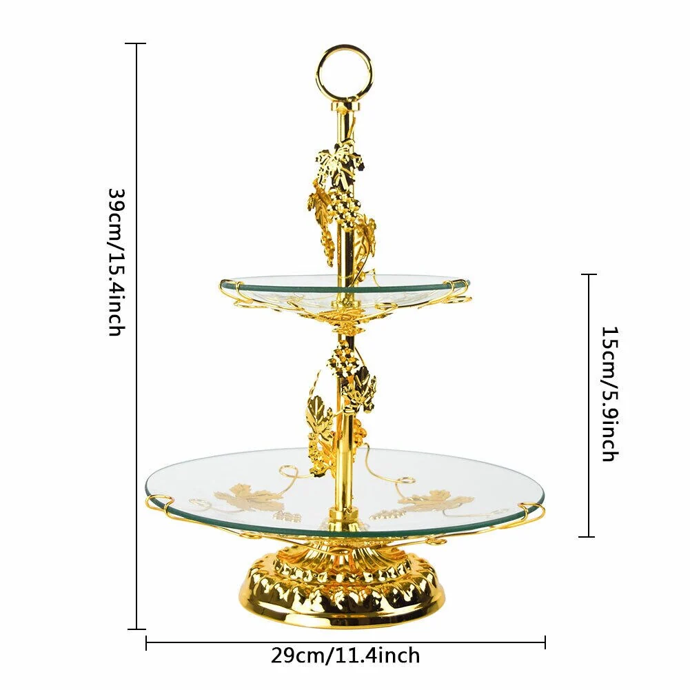 - [Elegance and Opulence in Design] Comprising two tiers of clear glass trays in distinct sizes, supported by gold-colored pillars intertwined with a decorative metal grape vine sculpture, this server platter exudes an air of sophistication. Every meticulous detail and exquisite craftsmanship will captivate your guests with a single glance, elevating your gatherings and earning endless compliments. air of sophistication. Every meticulous detail and exquisite craftsmanship will captivate your guests with a single glance,