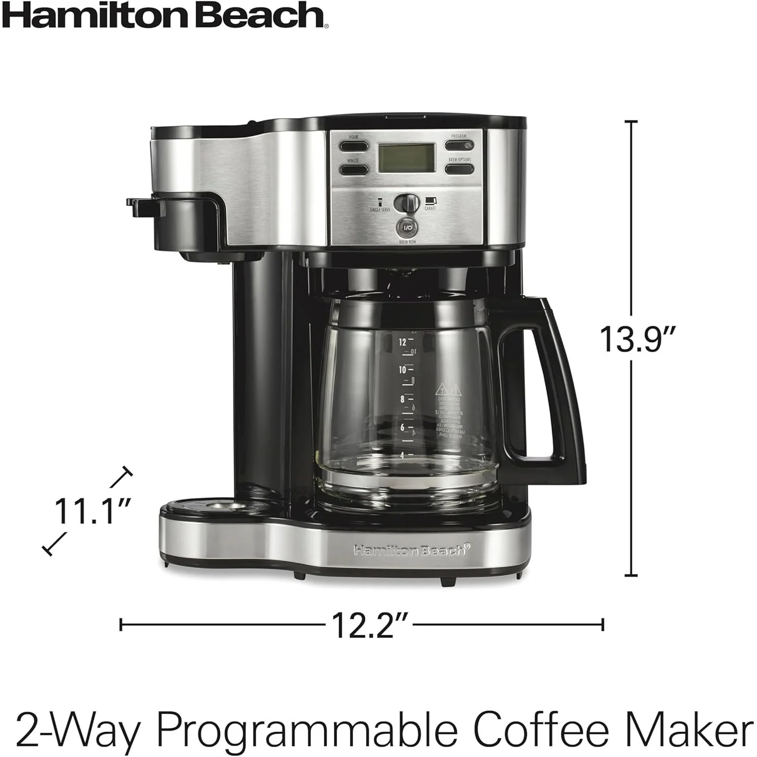 5 WAYS TO BREW: SINGLE CUP OR FULL POT. Brew a single-serve cup or a full coffee pot with your favorite ground coffee. Whichever way you brew, this programmable coffee maker makes it easy to do both. SIMPLE SINGLE-SERVE BREWING: With the included mesh scoop, adding your favorite ground coffee to the coffee maker couldn’t be easier: just scoop, place and brew. (Not compatible with K-Cup* pods.) ECO-FRIENDLY AND EASY ON YOUR WALLET. For fresh flavor and less waste, skip the plastic pods. Since this Hamilton Beach coffee maker doesn’t use K-Cup* pods, there’s less to buy and throw away. PROGRAMMABLE WITH MULTIPLE BREW SETTINGS: Choose whether to make a single cup or full pot, select bold or regular brew strength options, and program the coffee maker up to 24 hours in advance for wake-up ready coffee. GET YOUR FIRST CUP FAST WITH AUTO PAUSE & POUR: Pour yourself a quick cup as coffee brews with Auto Pause & Pour — no need to wait until the whole pot has finished brewing. 5 SEPARATE EASY-FILL WATER RESERVOIRS: Each brewer has its own water reservoir that’s easy to fill and features a water window, so you always know how much water is on each side.Â