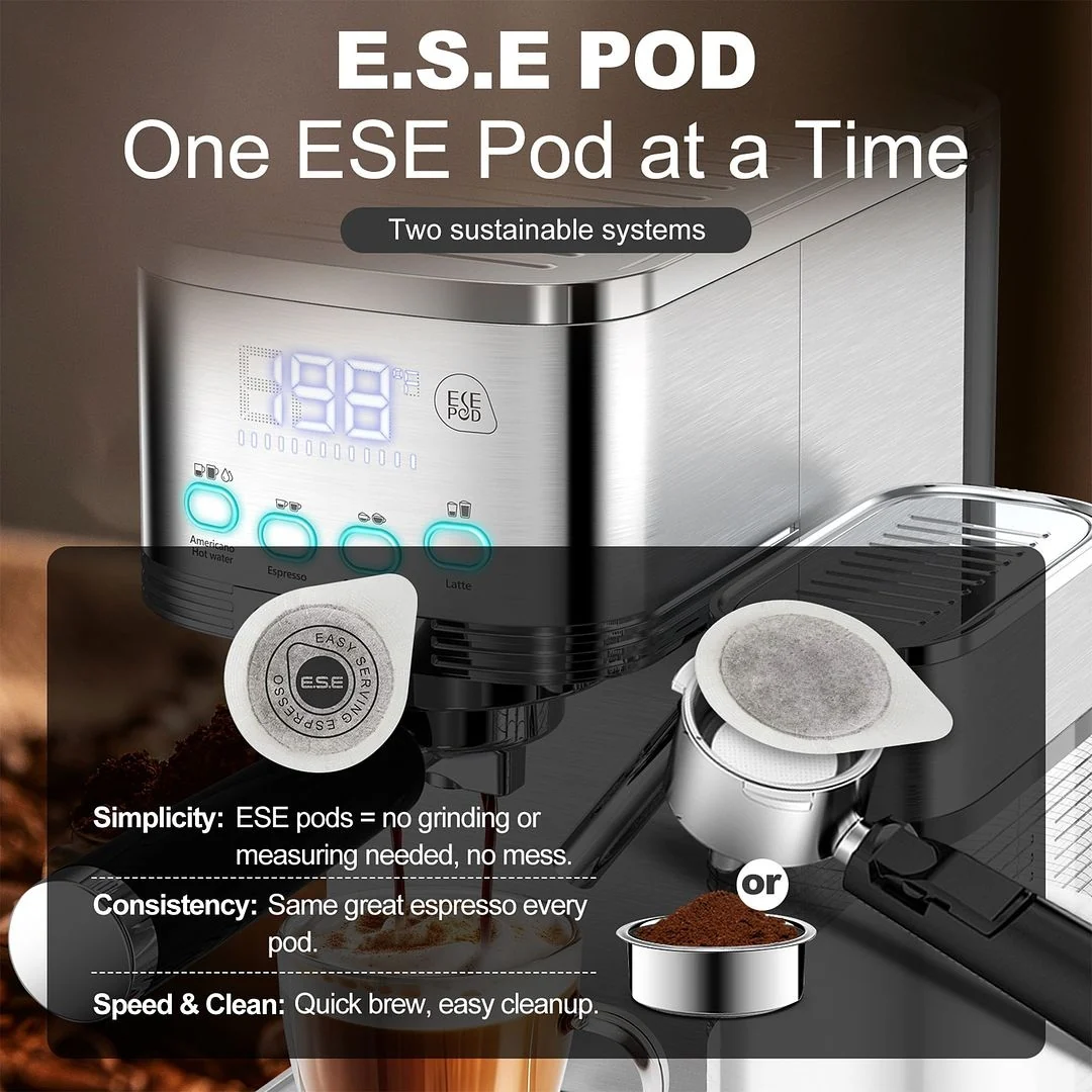 - Flexible Brewing Options with ESE Pod Filters: Choose from Single Shot, Double Shot, or the convenient ESE Pod Filter for a quick, mess-free coffee experience. Whether you prefer a solo espresso or a robust double shot, our machine caters to every preference.