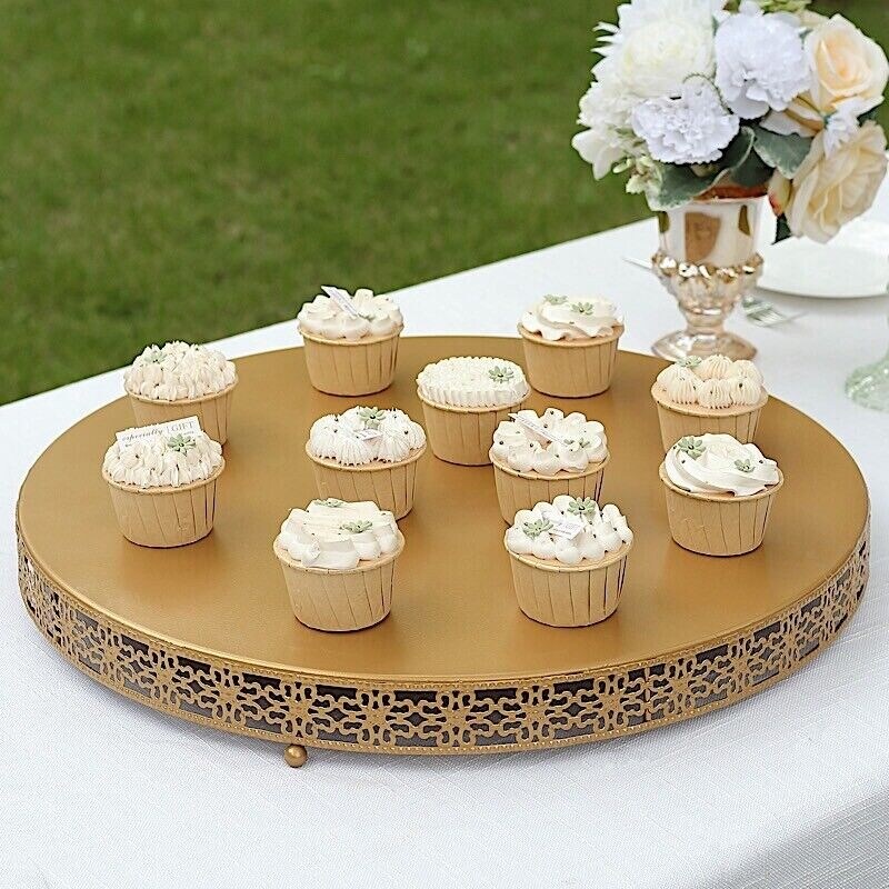 - Elevate the presentation of your desserts with this exquisite round cake stand! Made from premium metal and adorned with a charming Fleur De Lis edge design, this cake stand adds an air of elegance to your party dessert table.Â