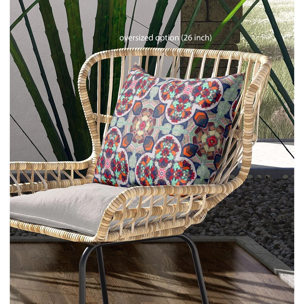 Lend a rich bohemian vibe into your living space with this beautifully designed Green Orange Cloverleaf Indoor Outdoor Zippered Throw Pillow. Showing off a cloverleaf-like design pattern in muted green and blues with pops of orange and red hues to strike a balance between warm and cool tones. Crafted from high-quality broadcloth fabric which is smooth and glossy to give a plush appearance to the pillow while being durable to last for a long time. This pillow comes with a neatly done zipper with a soft and durable polyfill insert for a luxurious feel and seamless finish. Trendy yet traditional at the same time, this decorative throw pillow features a fusion of colors to spruce up your home. 20" x 20" x 5"