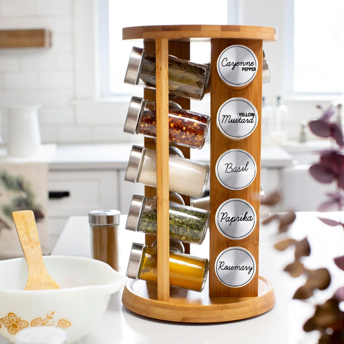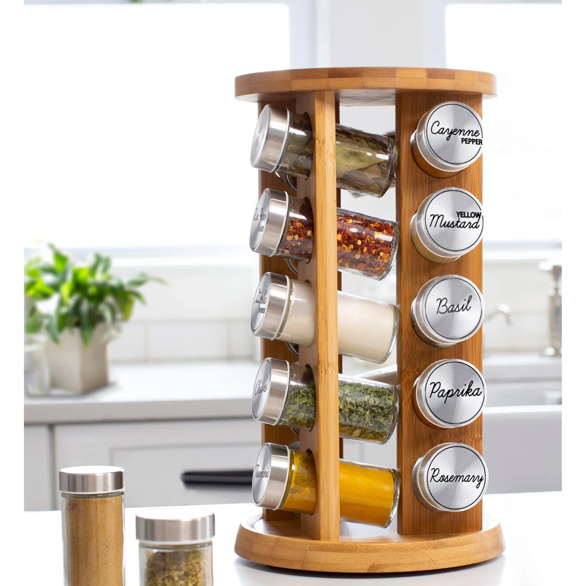 20 Jar Bamboo Spice Rack with Spices Included – Rotating Tower Organizer for Kitchen Spices and Seasonings,Free Spice Refills