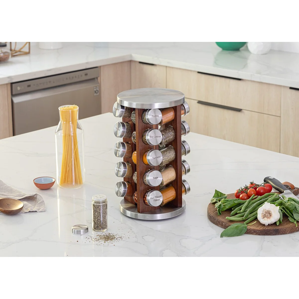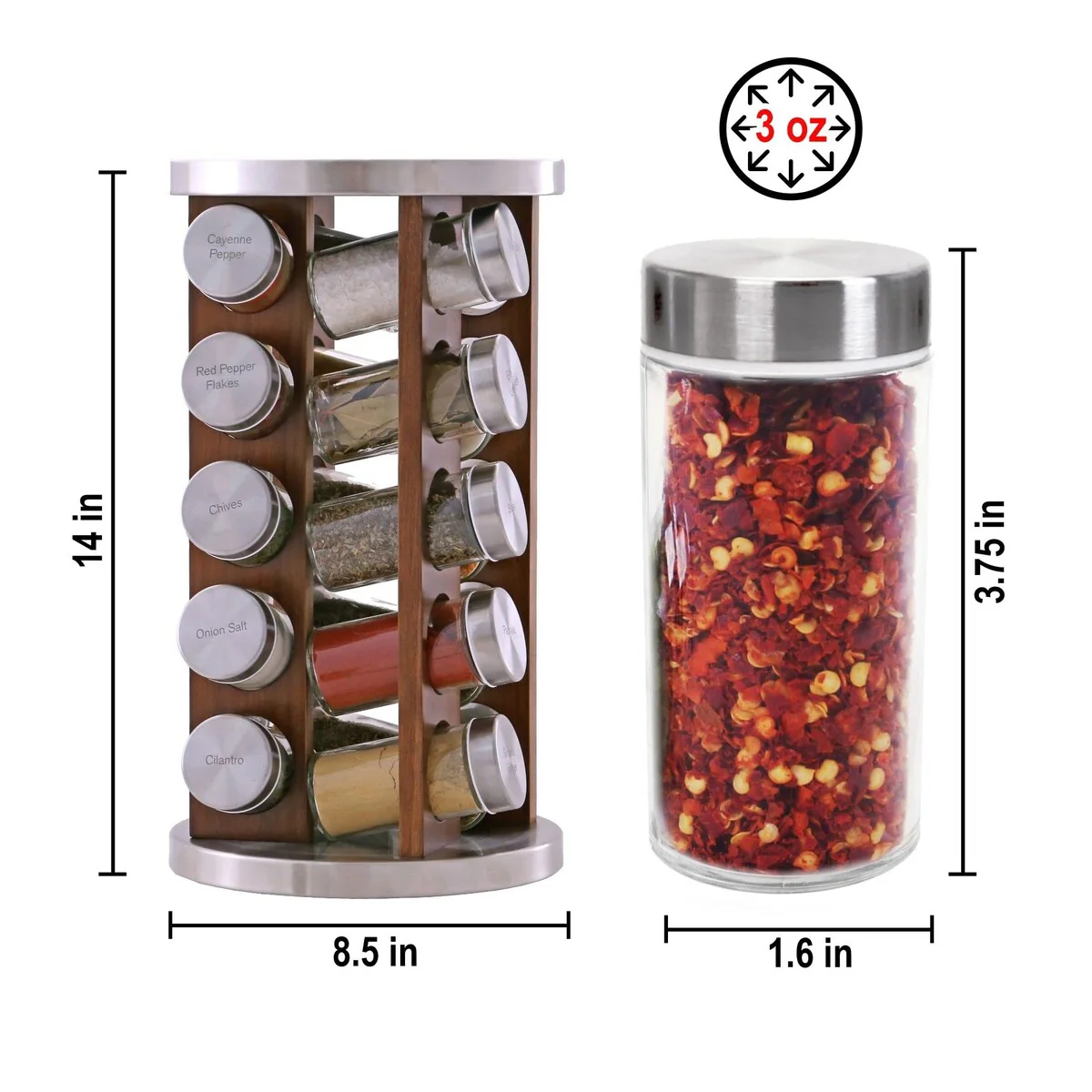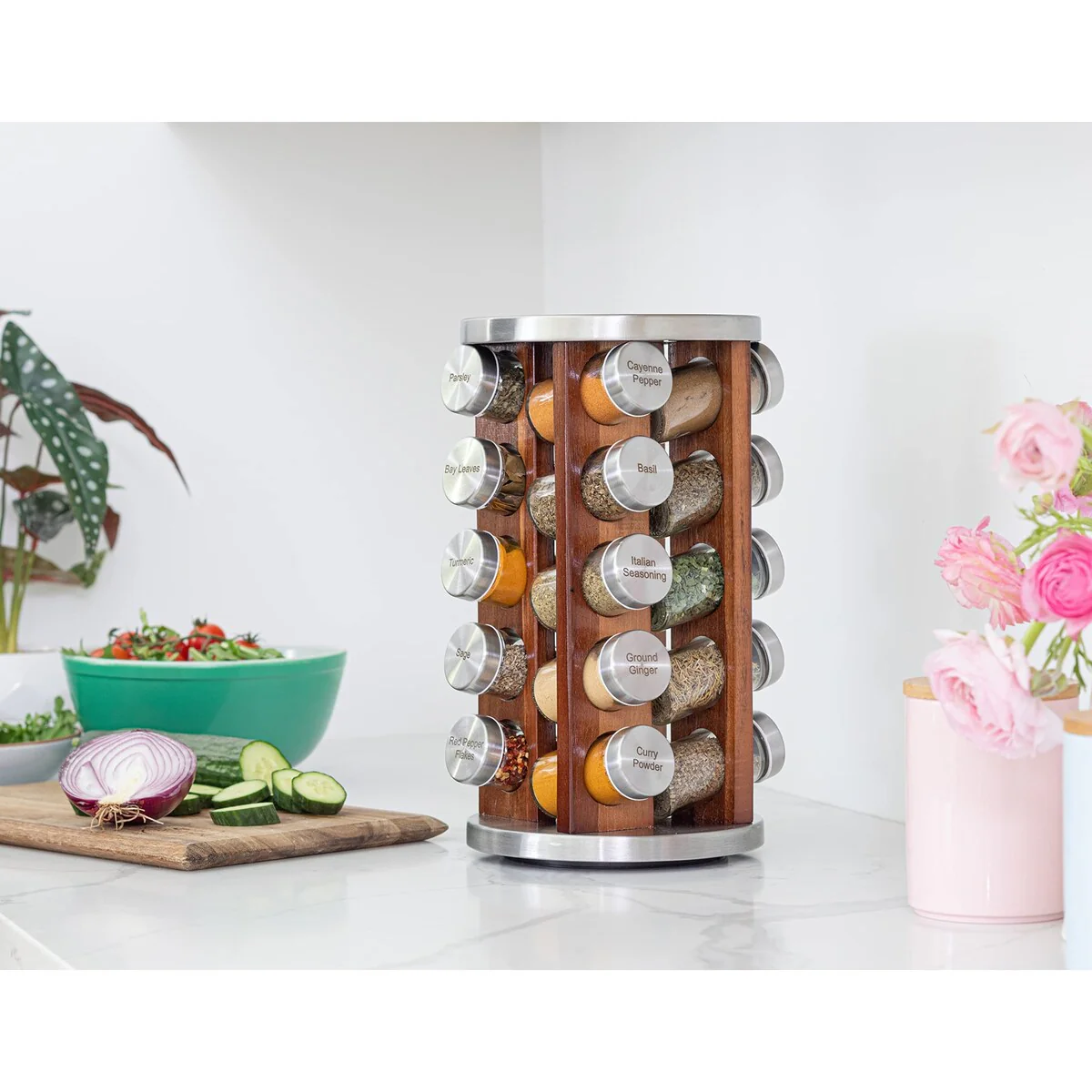 20 Jar Dark Acacia Wood Spice Rack with Spices Included – Rotating Tower Organizer for Kitchen Spices and Seasonings