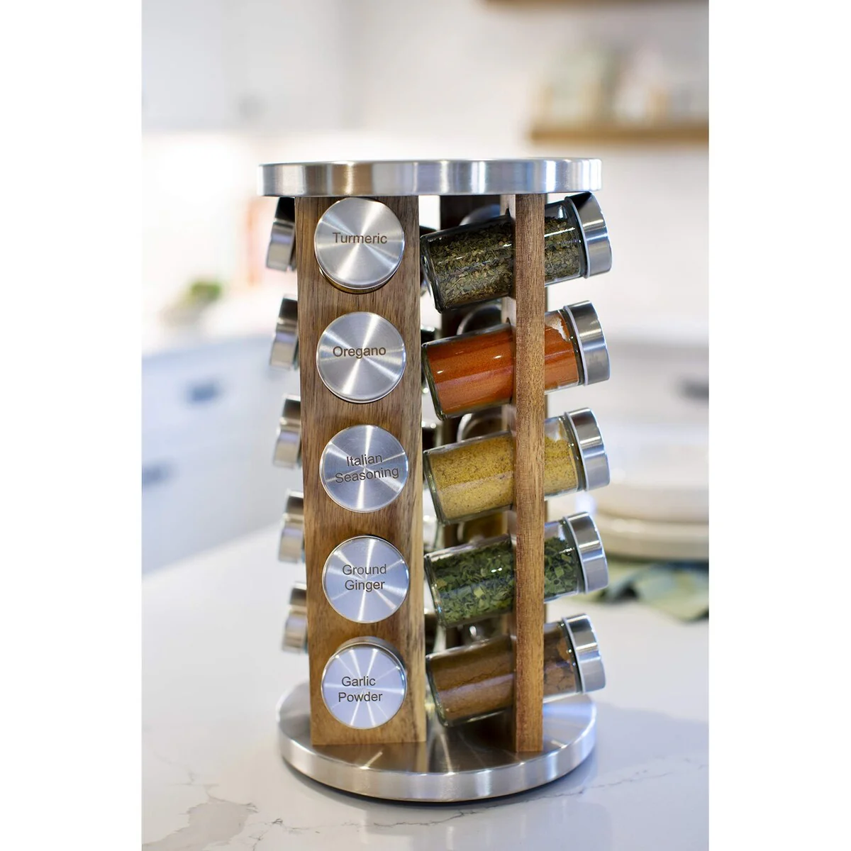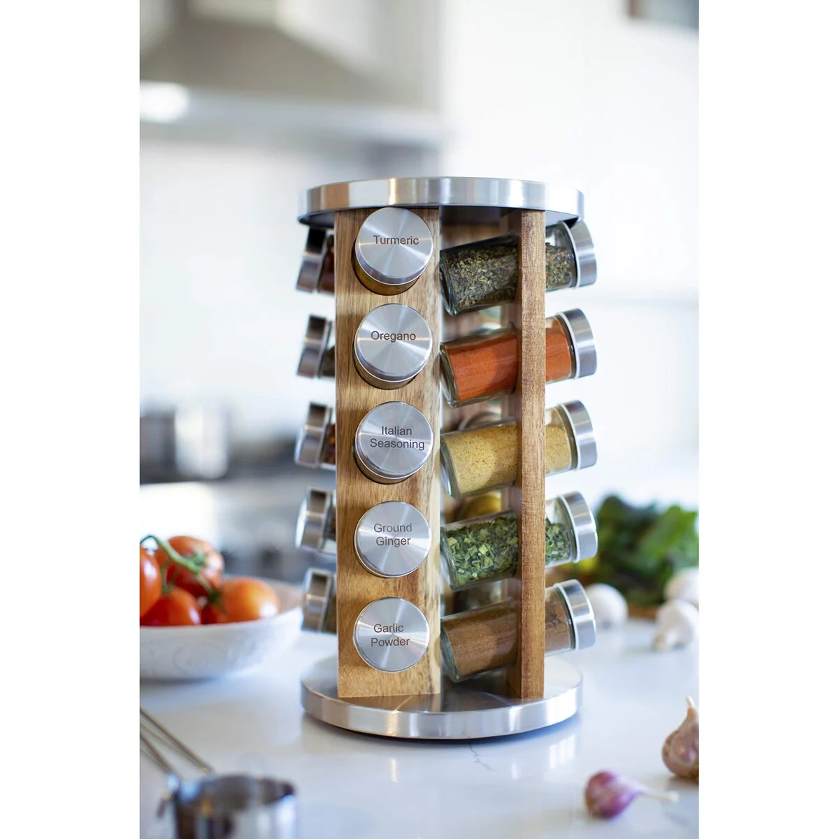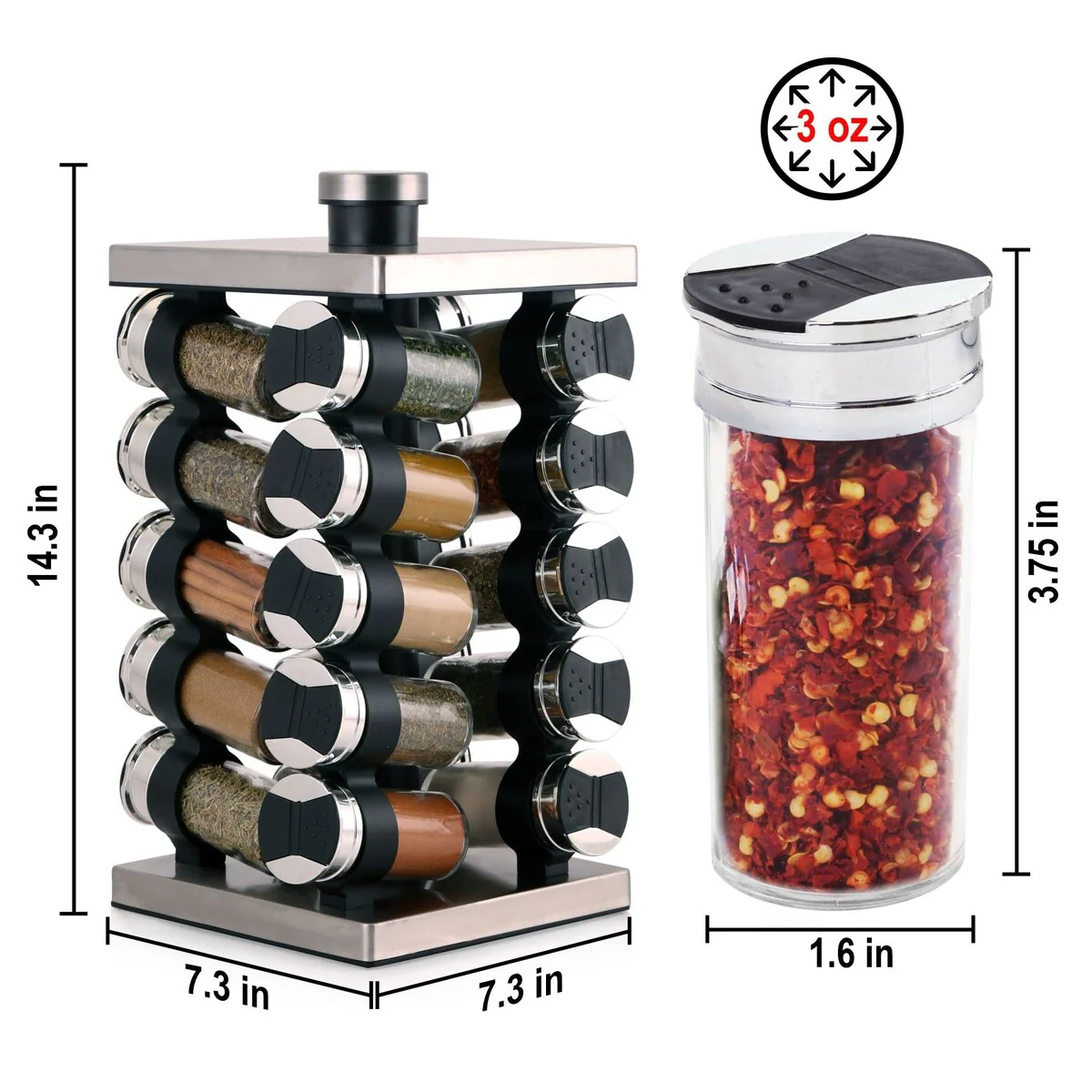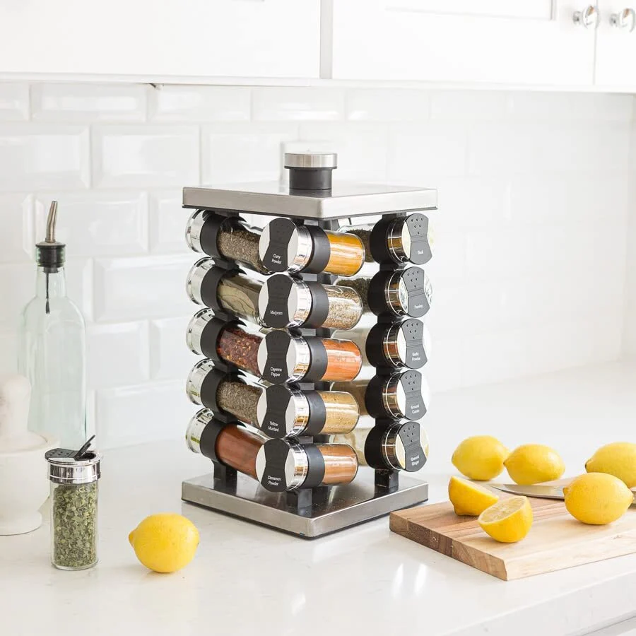 SET INCLUDES: 1 rotating spice rack and 20 prefilled, glass spice jars with removable sifter and etched stainless steel caps