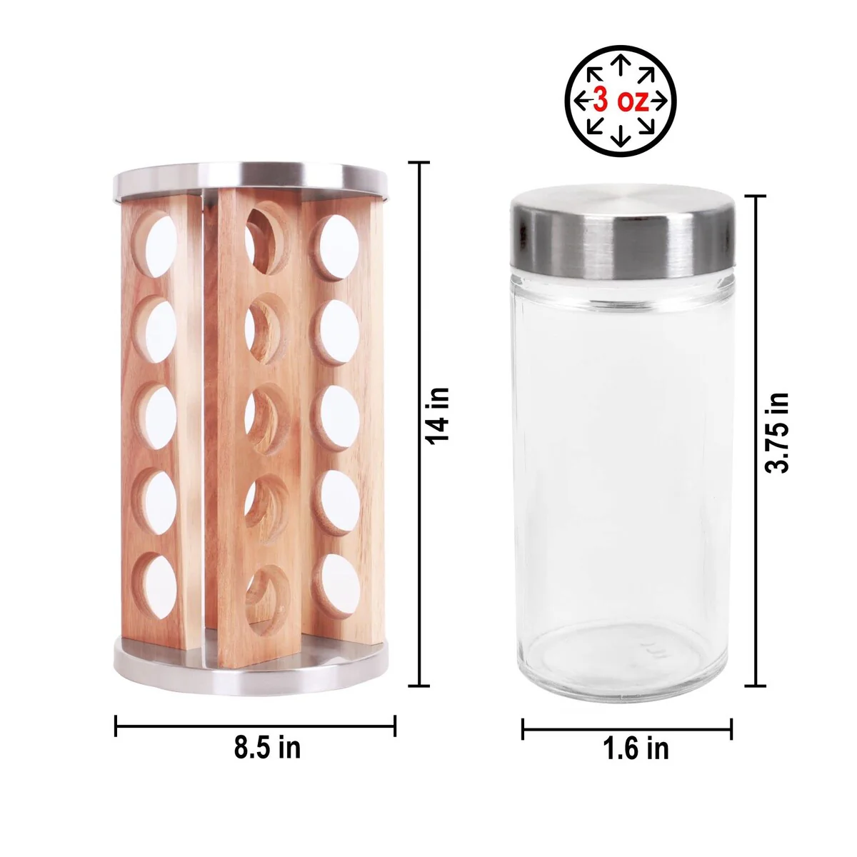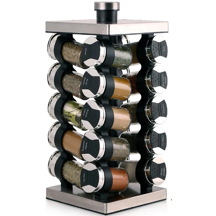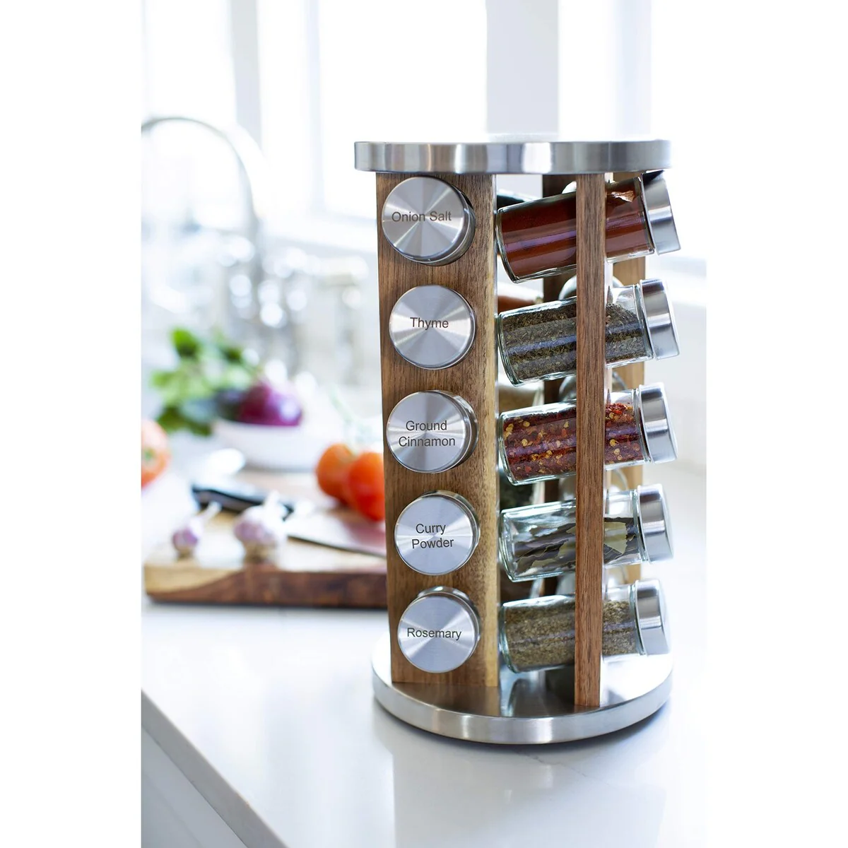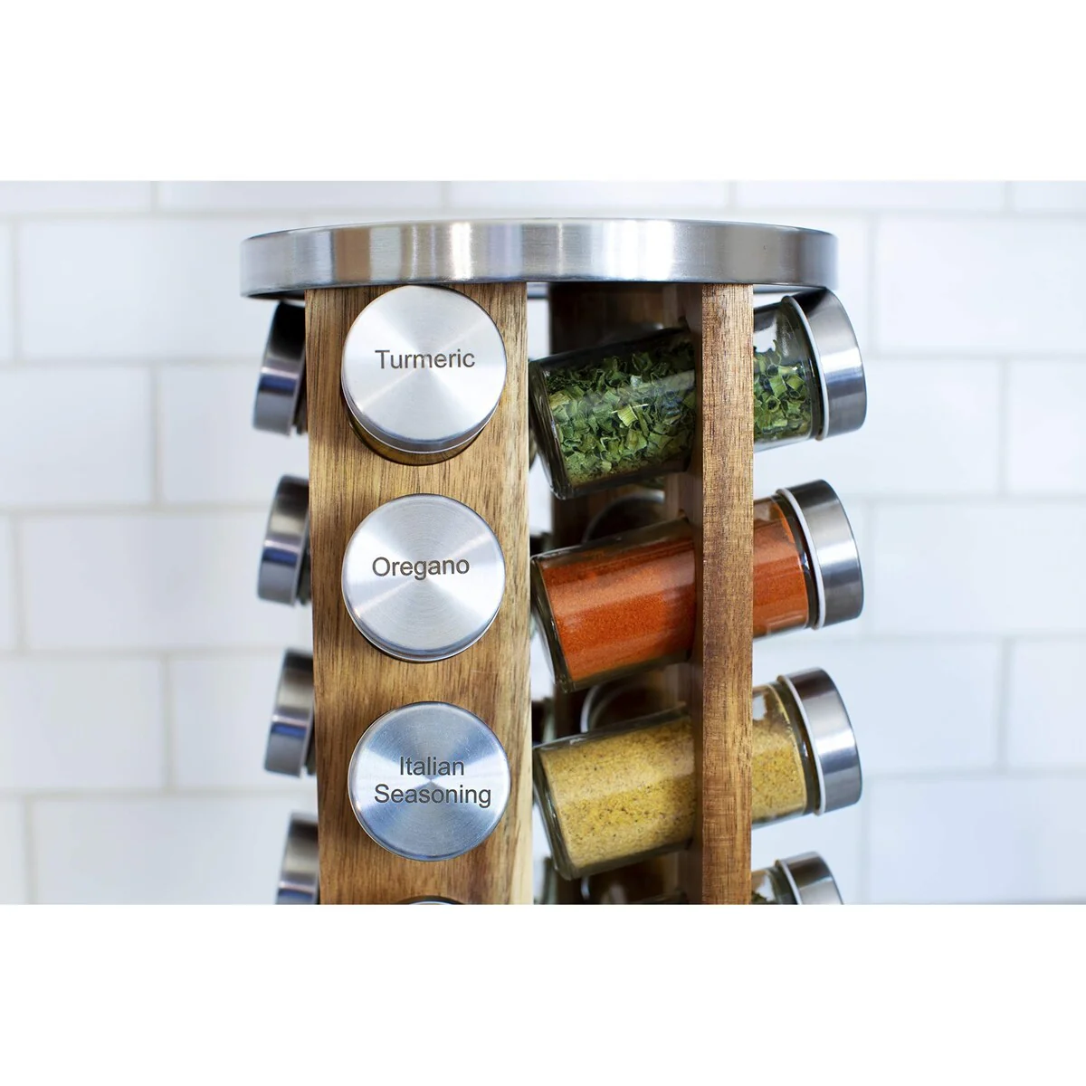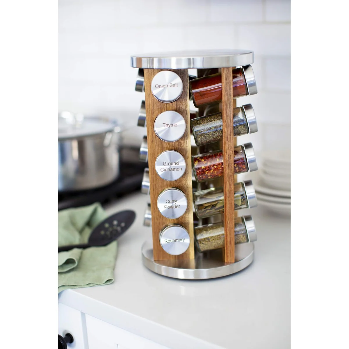 SET INCLUDES: 1 rotating spice rack and 20 prefilled, glass spice jars with removable sifter and etched stainless steel caps