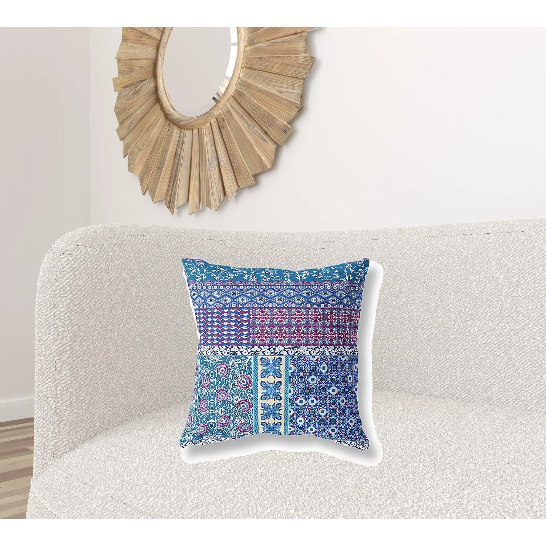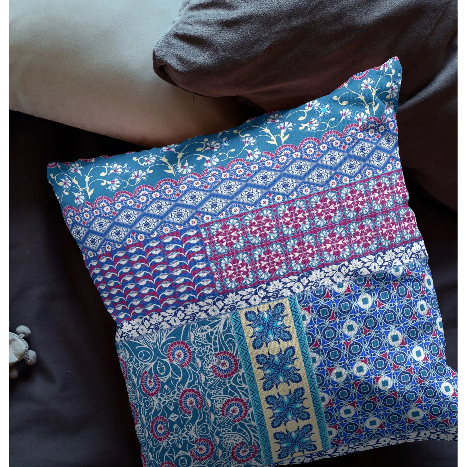 Capture the peacefulness of oceanic hues with this Navy Plum Patch Indoor Outdoor Throw Pillow that will emphasize a bohemian style into your living space. The cobalt blue base flaunts luxuriously detailed geo floral patchwork in soft blue, white, pale yellow, and pops of plum-toned hues, creating an eye-catchy design. Skillfully made of premium quality broadcloth fabric, which has a smooth surface texture with long-lasting durability to serve you for years. With an exceptionally soft and durable polyfill insert, this pillow ensures maximum comfort with enhanced fluffiness for visual appeal. This pleasant color combination of this decorative pillow will seamlessly complement the aesthetics of any modern or bohemian decor. 20"? x 20"? x 5"?