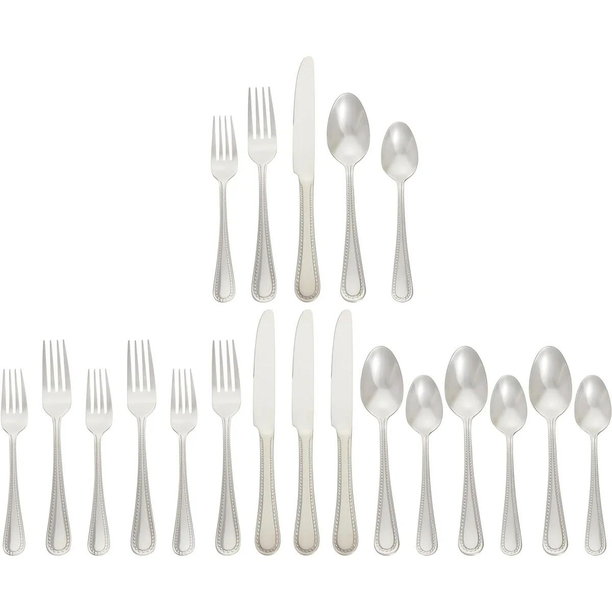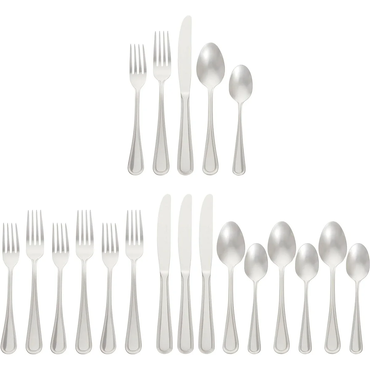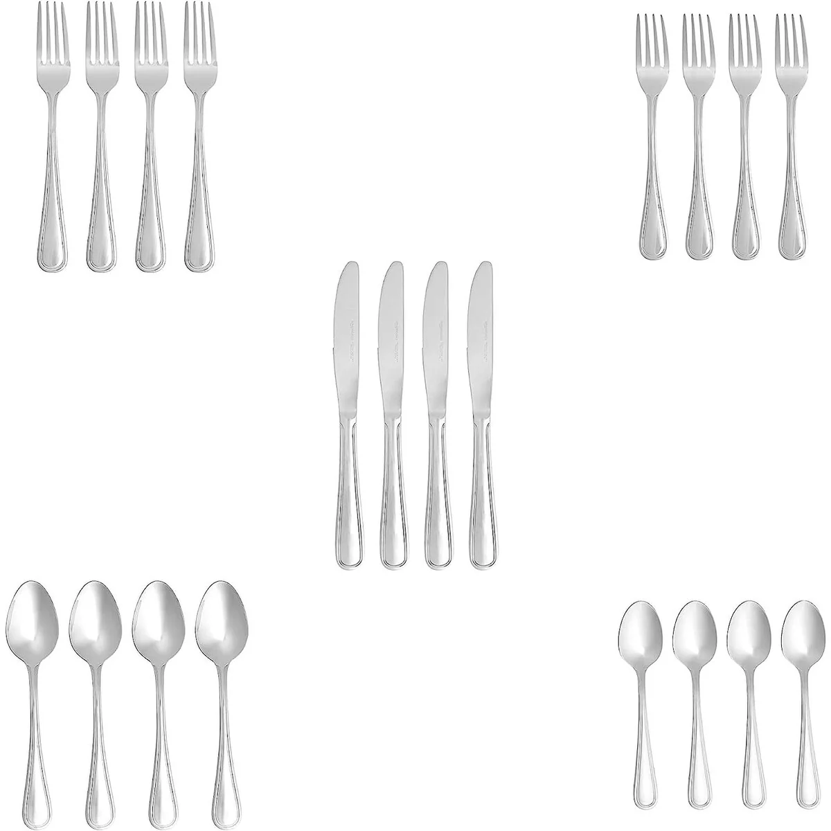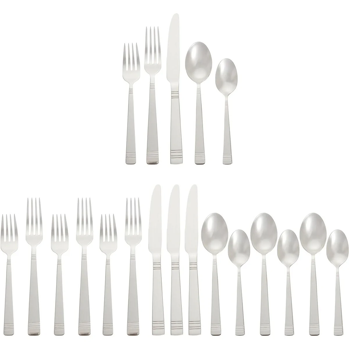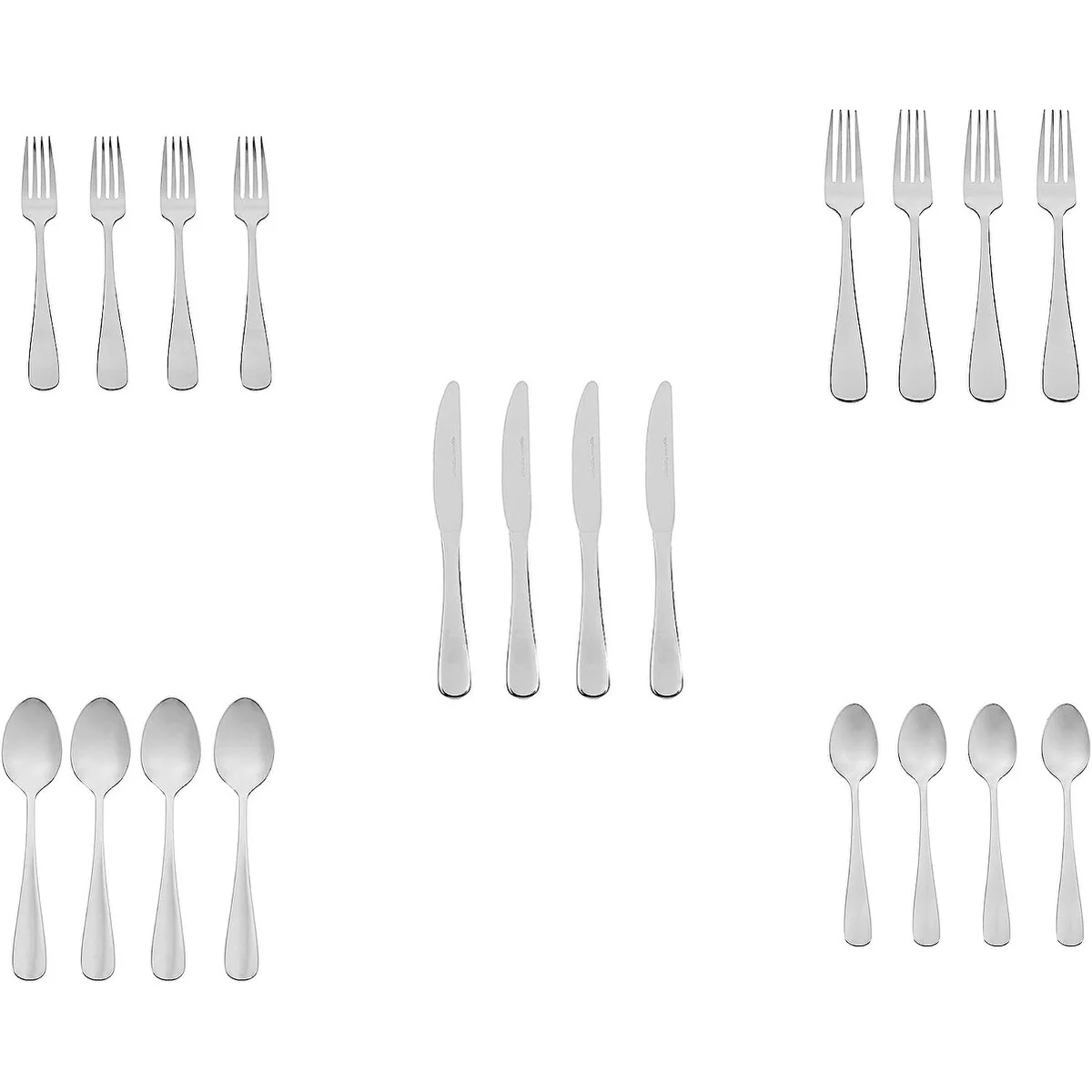 - 20-piece flatware set includes (4) 5-piece place settings, each with a salad fork, dinner fork, place knife, soup spoon, and teaspoon; ideal for everyday use or special occasions