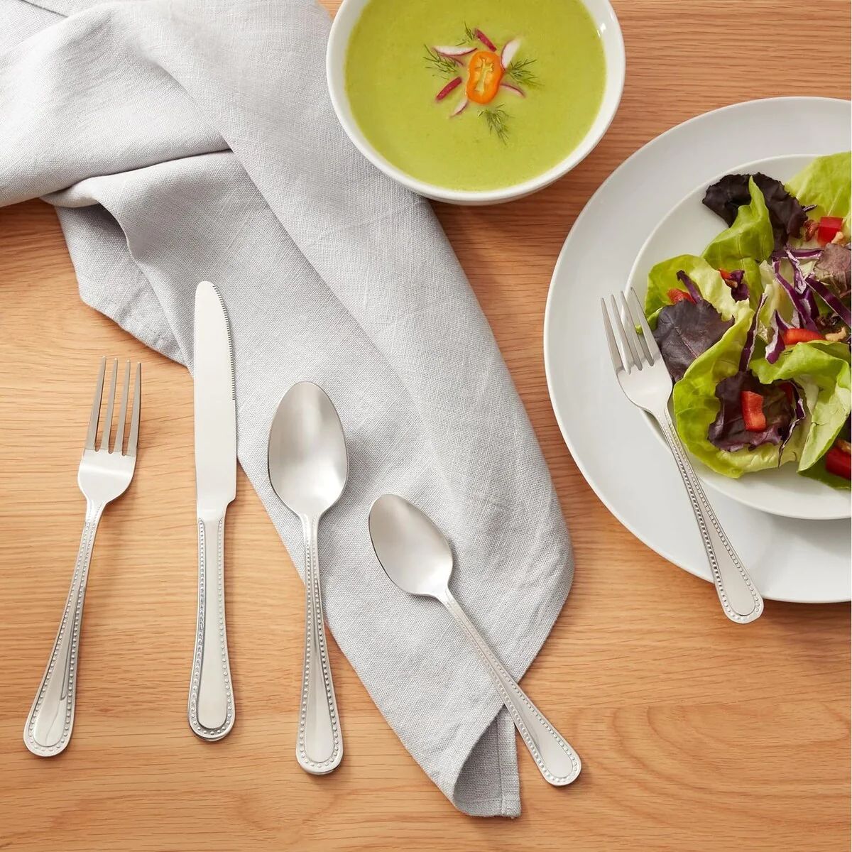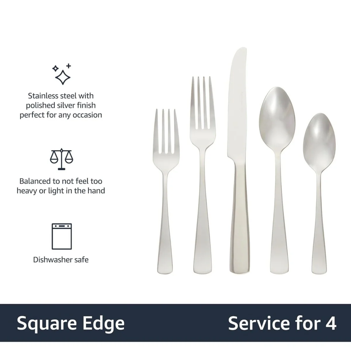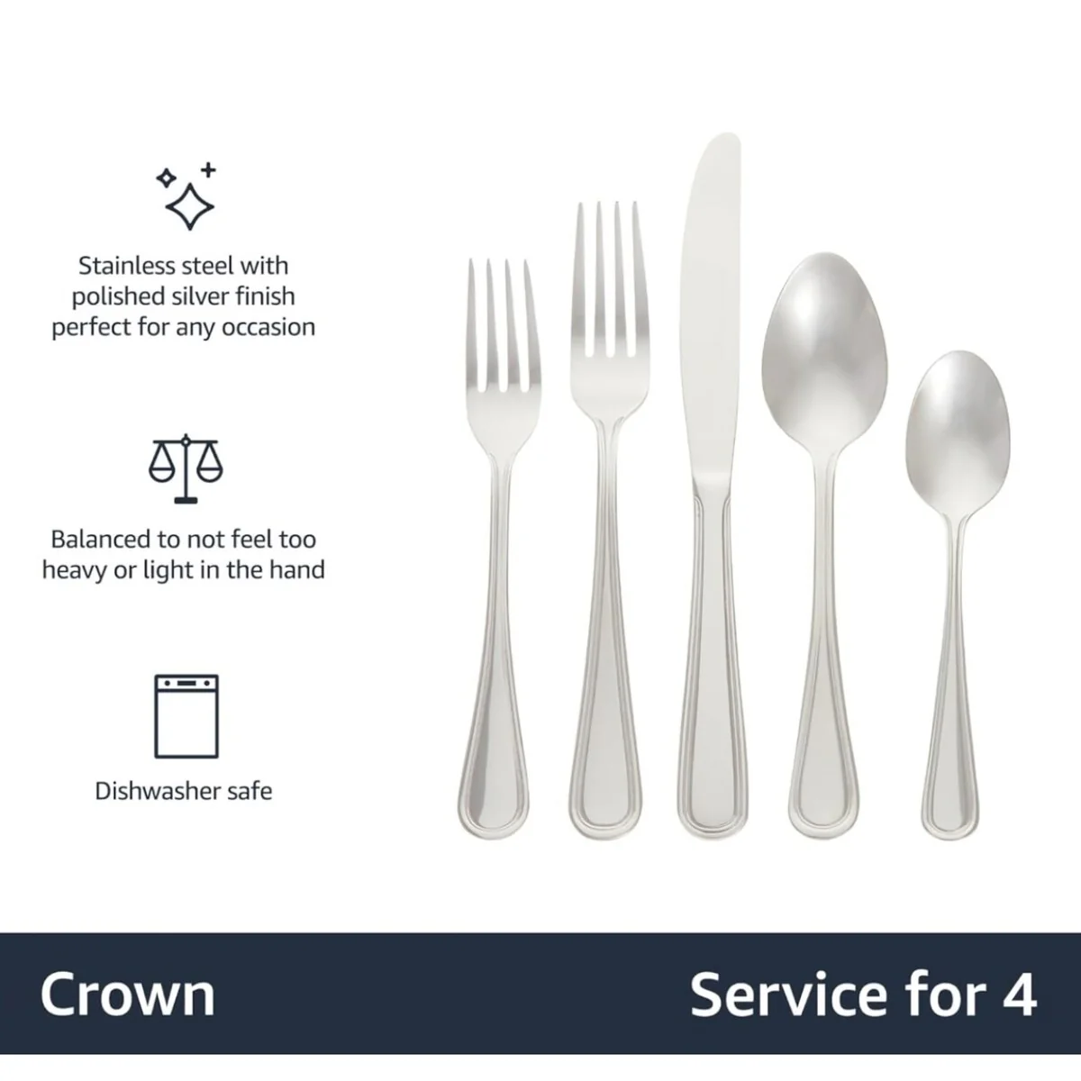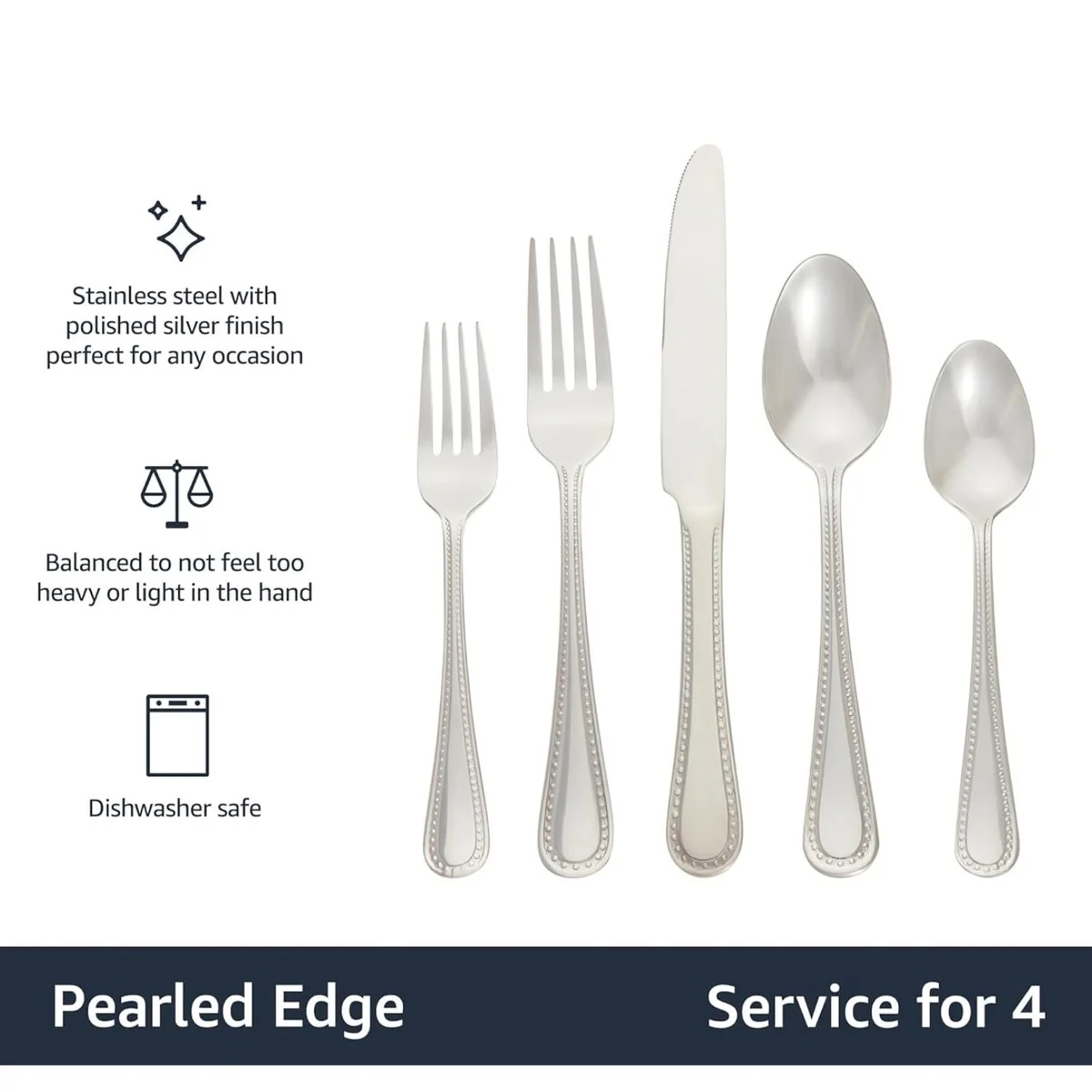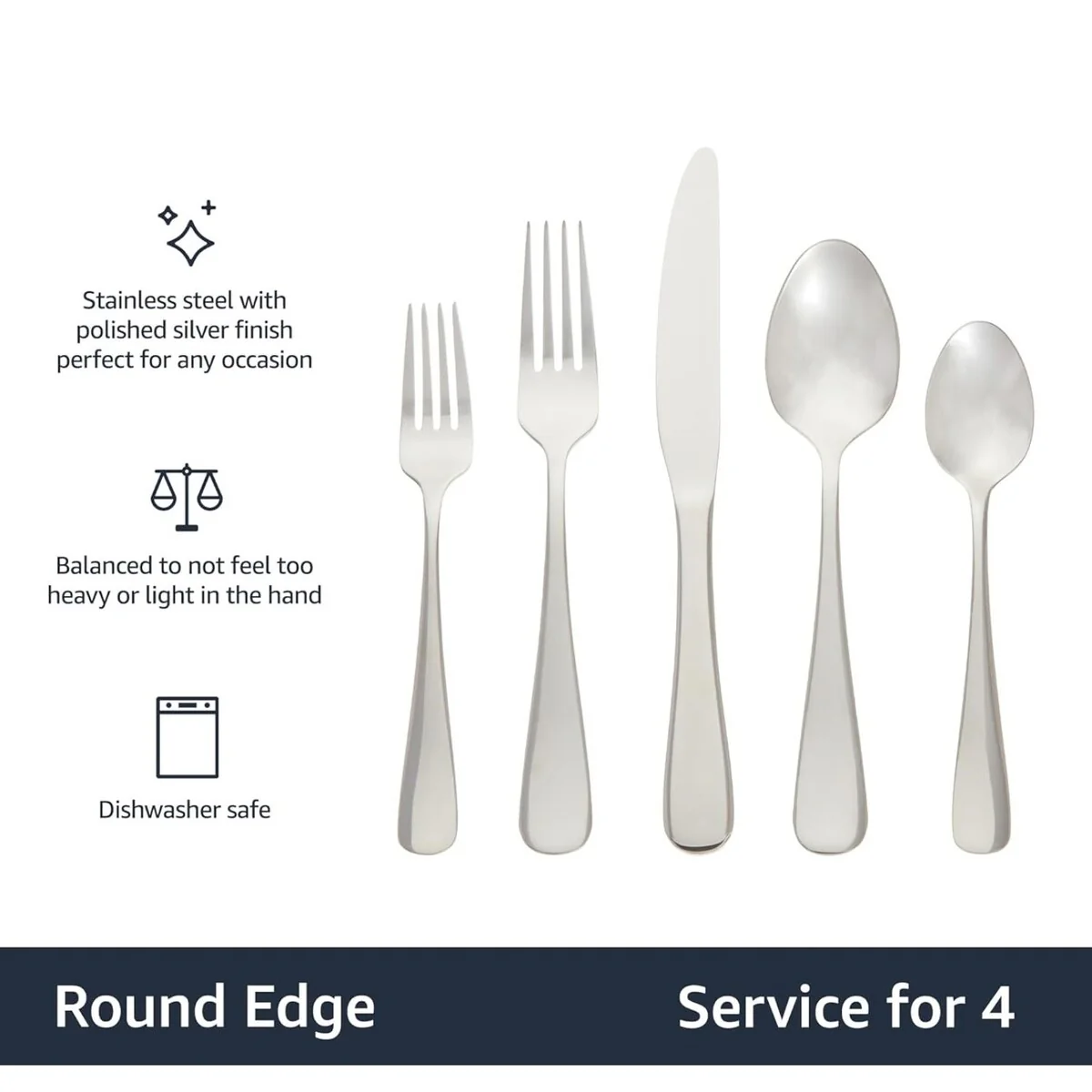 - 20-piece flatware set includes (4) 5-piece place settings, each with a salad fork, dinner fork, place knife, soup spoon, and teaspoon; ideal for everyday use or special occasions