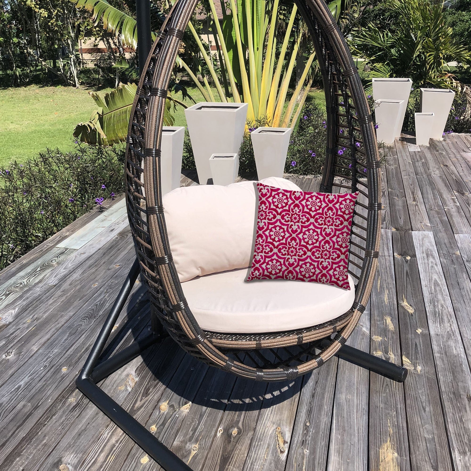 Add a pop of color to your traditional décor with this Pink Medallion Indoor Outdoor Zippered Pillow Cover. A shimmering hot-pink color envelops the base of the cover with gray and white medallions printed throughout to give it a vintage glamour. Constructed with a high-quality polyester fabric, the pillow cover is cold water washable and simply needs to be laid flat to dry. This cover can withstand sun exposure for up to 500 hours without fading and are water resistant to prevent mildew making it ideal for both indoor and outdoor settings. The cover comes with a zippered closure so you can conveniently put in the insert without wrinkling it. Pair this stunning boho inspired throw pillow with the antique pieces in your traditional abode to add a vintage charm. 19.5" x 19.5" x 0.25"