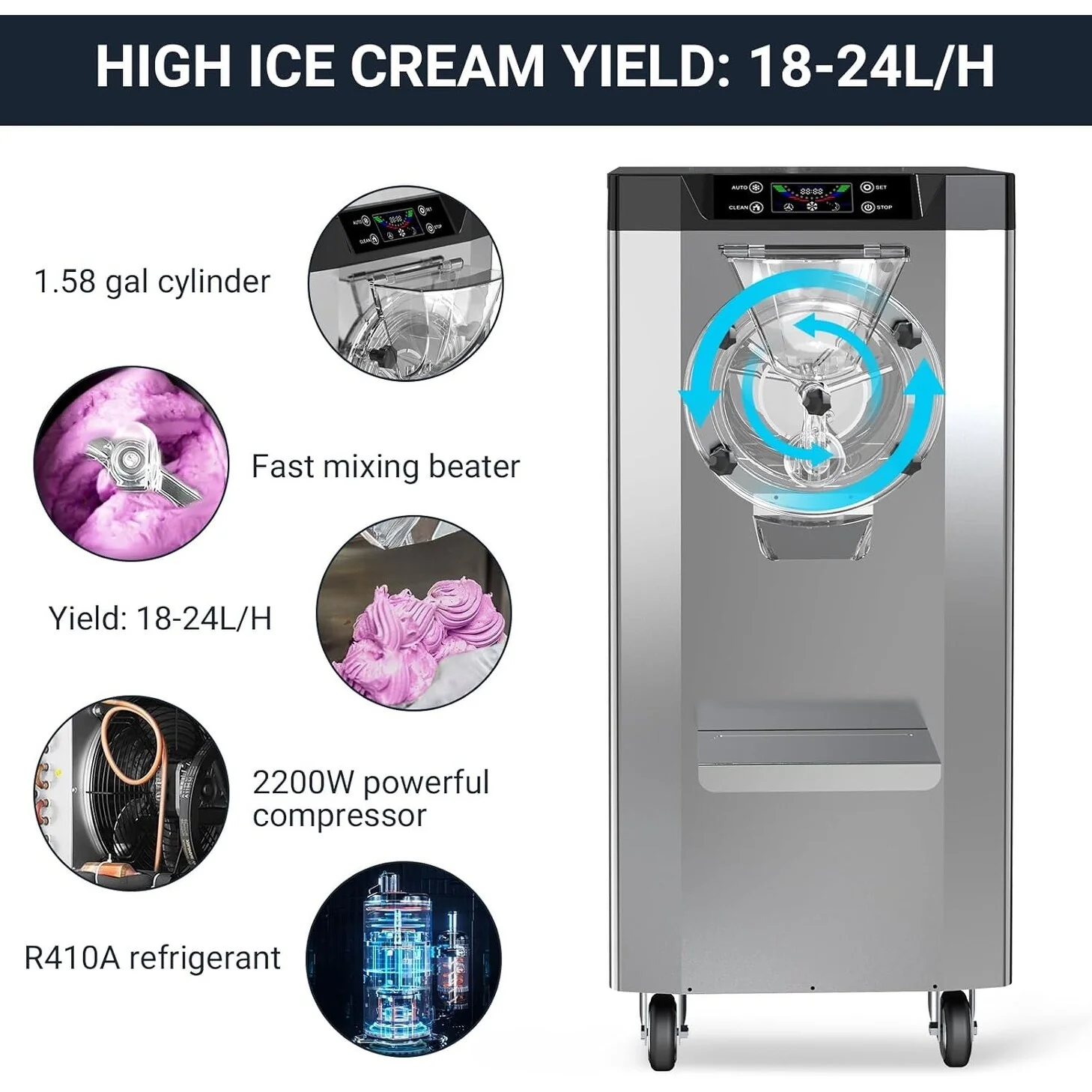 - High Production Capacity: Produces 4.8–6.3 gallons (18–24 liters) of ice cream per hour, ideal for both home and commercial use.