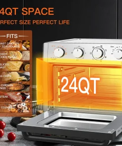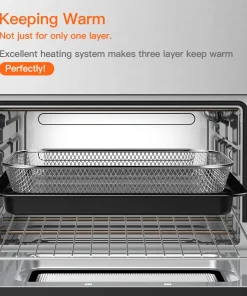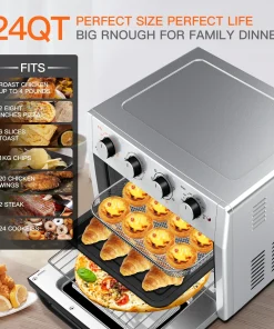 This 24-quart air fryer oven allows you to prepare family dinners for up to 10 people! 50% faster than traditional ovens. The 3-level heating allows you to cook more food at a time. Make the perfect chiffon cake, steak, 12-inch pizza, 6 pounds of chicken, 3 pounds of French fries, 6 toasts, bread and vegetables.