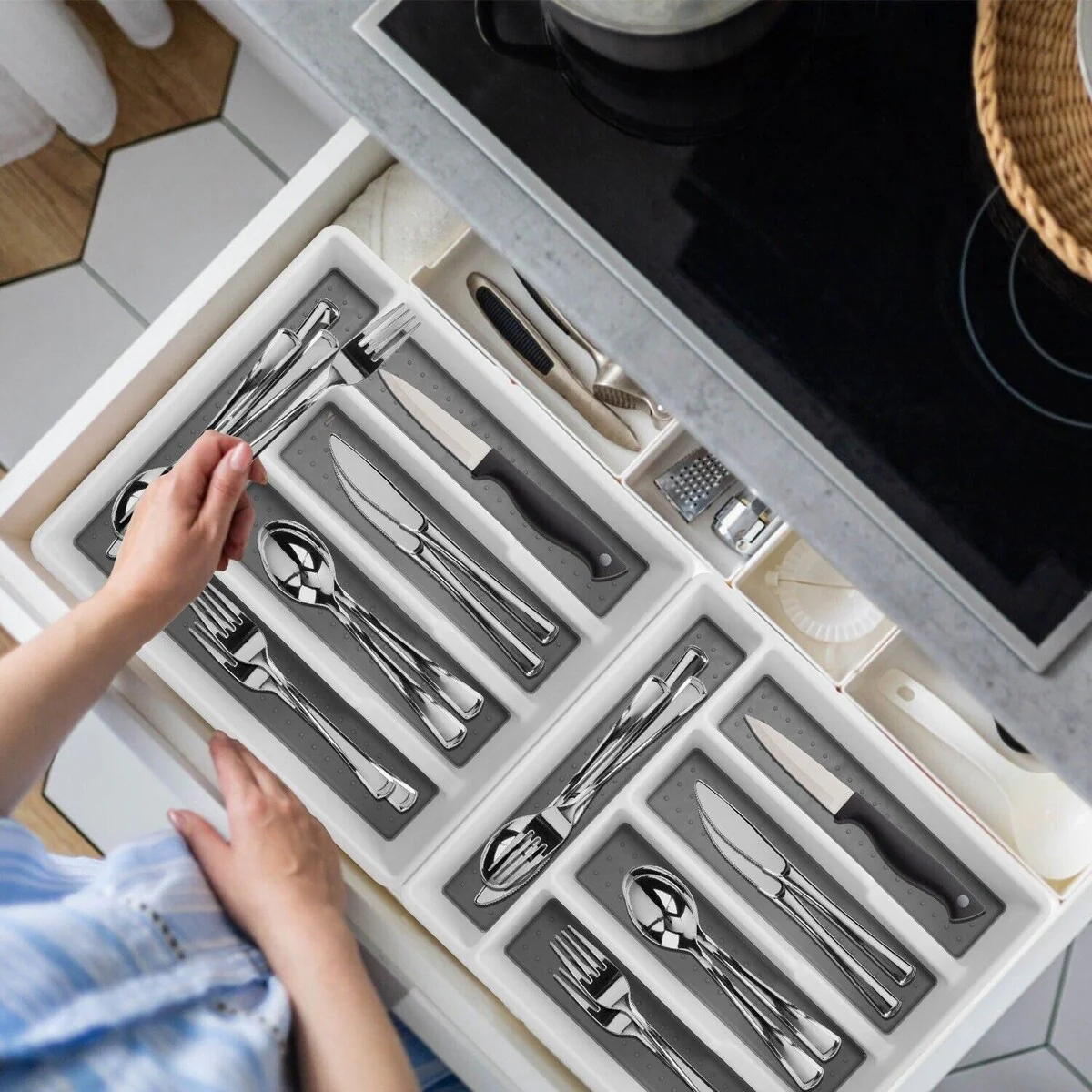 - Keep Drawer Tidy: Are you disturbed by the messy cutlery in the drawer or always have to waste a lot of time to find your desired knife or spoon? Our package includes 2Pcs silverware organizers that massively improve the utilization of your drawer space, which help you directly see everything at a glance and keep your kitchen drawer, desktop, and cabinet in well-organized.