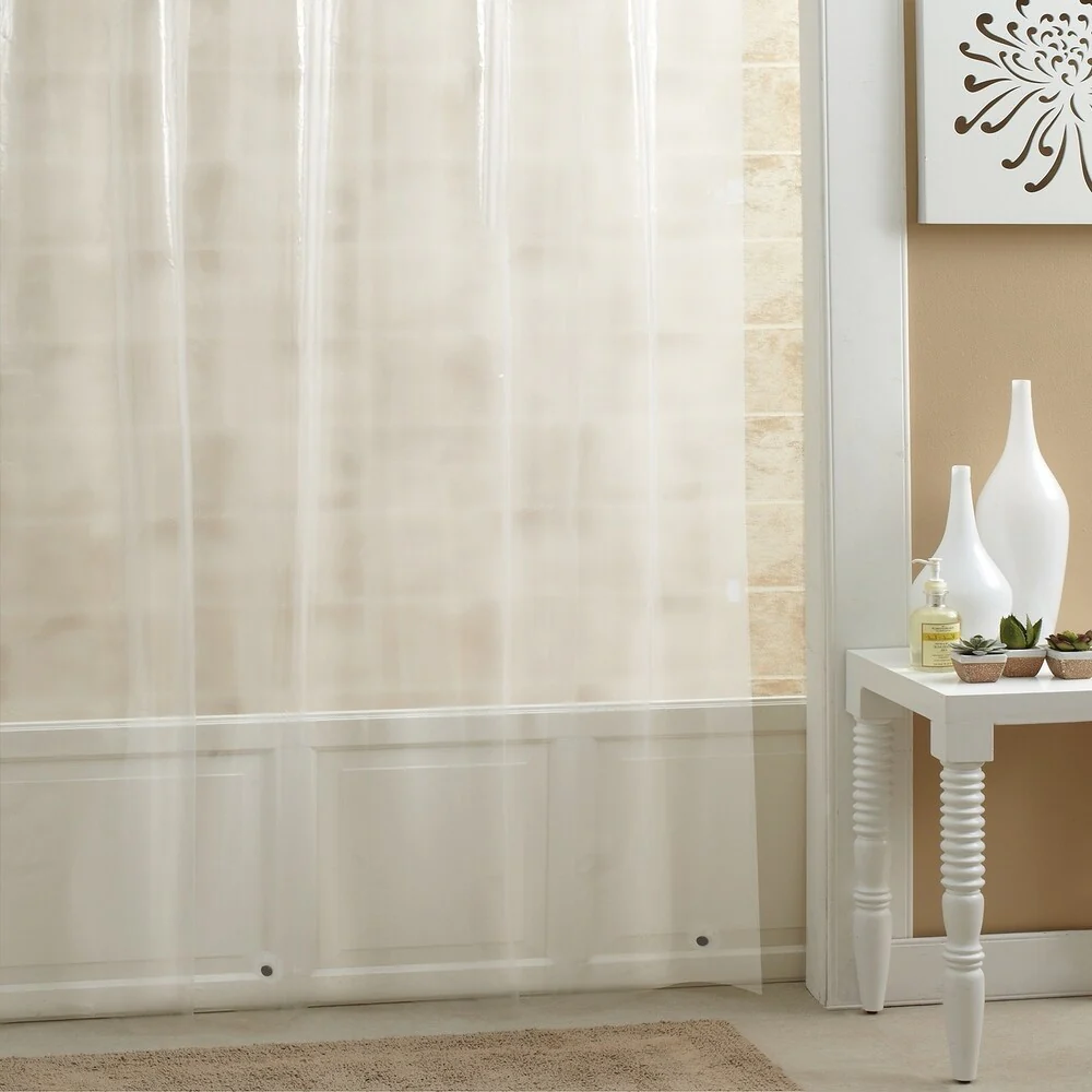 The Medium Weight PEVA Shower Curtain Liner can be used to protect your favorite shower curtain or hang all by itself! Treated with agent to protect it from mildew. 12 Rust resistant metal grommet reinforcements for shower curtain hooks. 3 Magnets on bottom hem to reduce shower curtain movement. Suctions cups on the sides securely keep water in your shower. Chlorine and PVC free. Peva is a beautiful liner. Clear in color