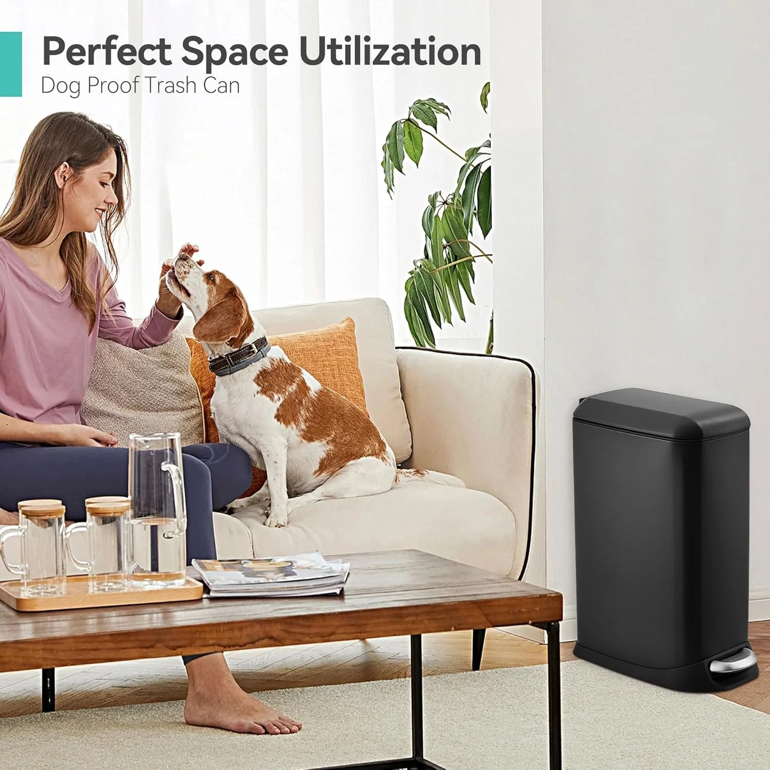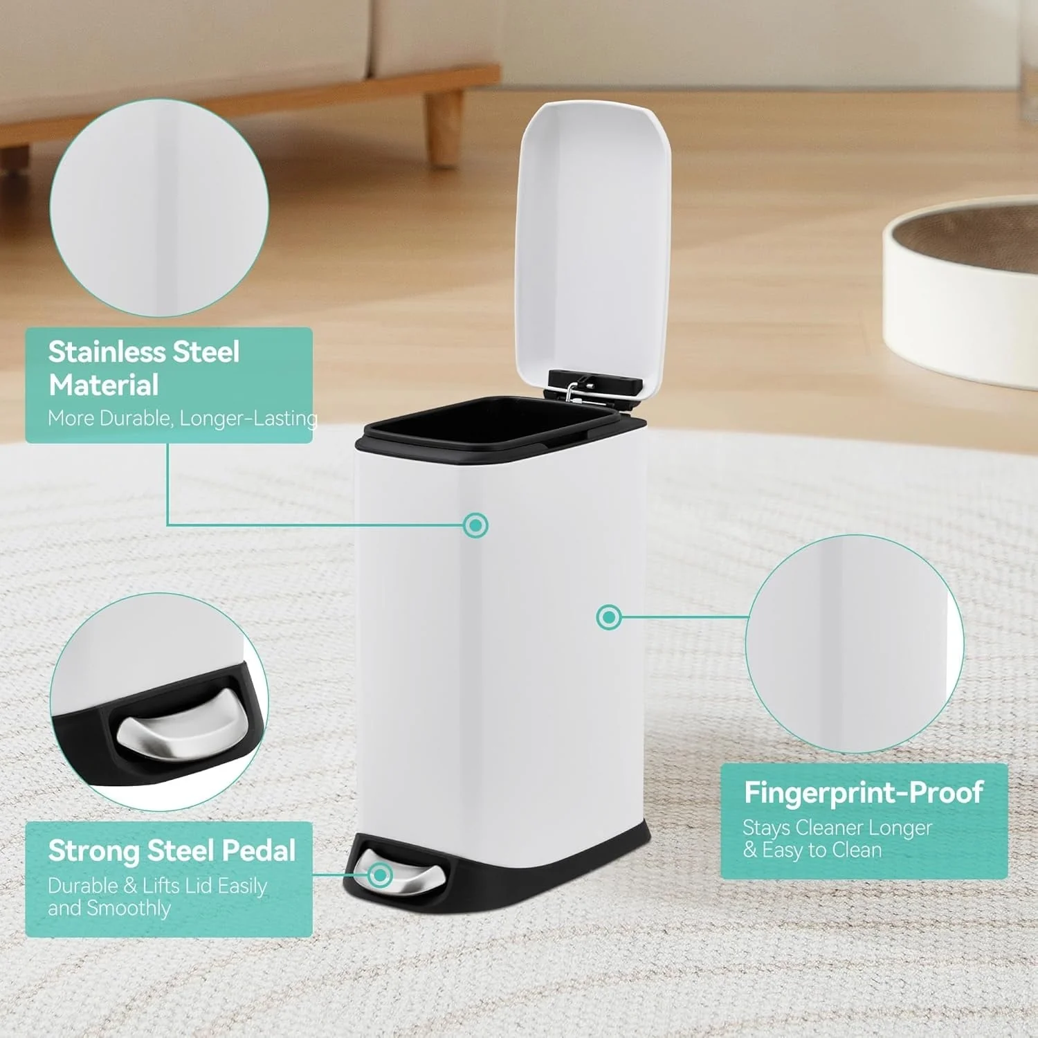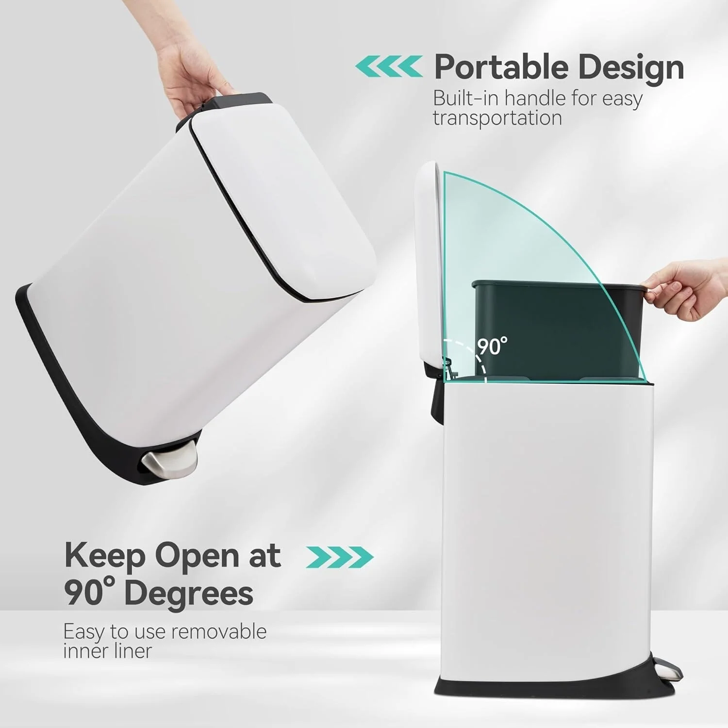 - [Silent Step-On Lid]The foot pedal opens the lid smoothly with minimal pressure, freeing hands during cooking or cleaning. Slow-close hinges ensure the lid shuts quietly—no sudden slams to disturb naptime or movie nights. The tight seal contains odors from food scraps or diapers while allowing easy disposal of bulky items like cereal boxes. Rubber grips on the base prevent sliding on tile or hardwood floors. Simple mechanics require no lubrication or adjustments over time.
