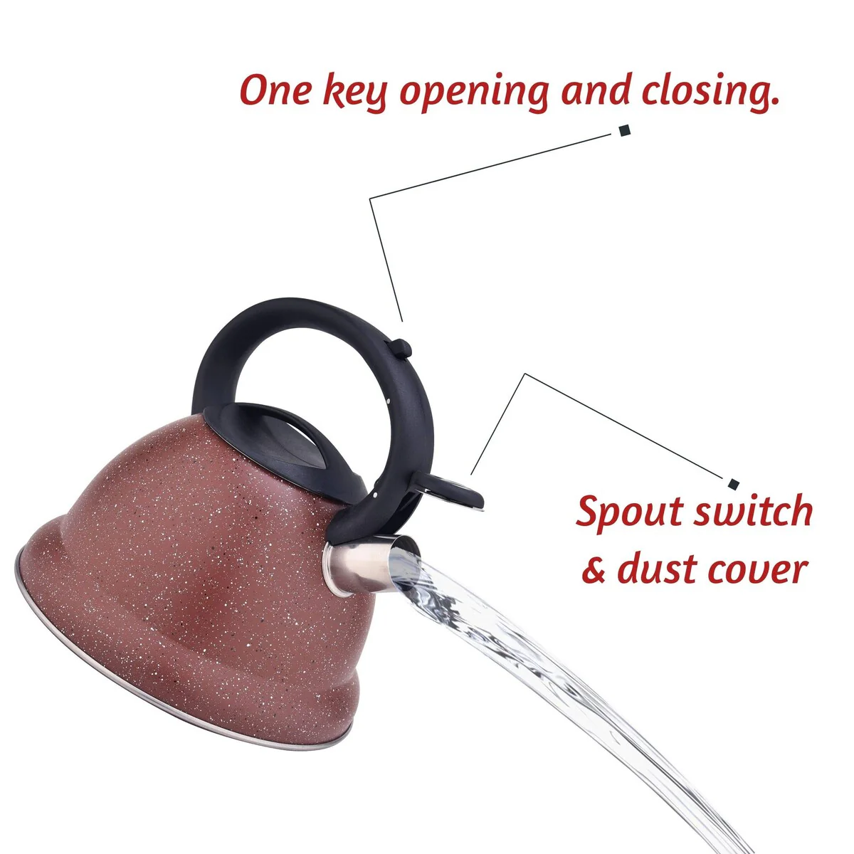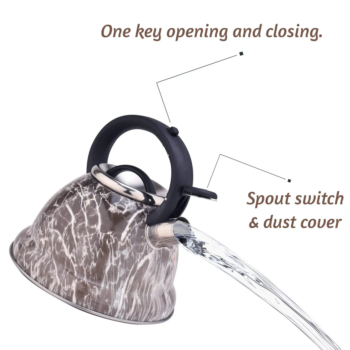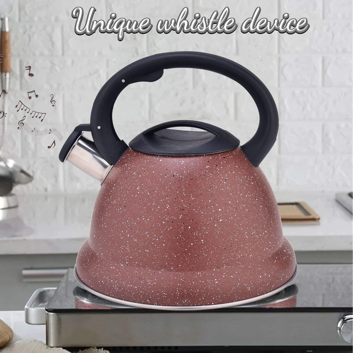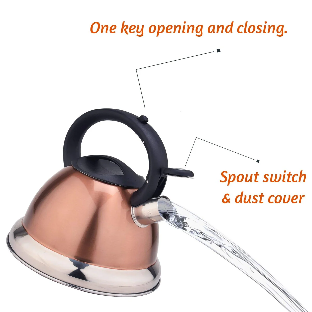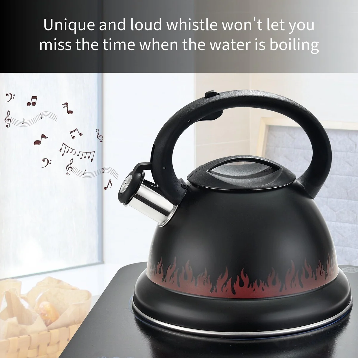 Loudly whistle: When the water is boiling, the whistling kettle will   automatically emit a whistle, so you can hear a unique and loud whistle. When   you are focusing on other issues (such as housework, watching TV, or games), the   whistle on the kettle will attract your attention. Time-saving, simple, and   stress-free.