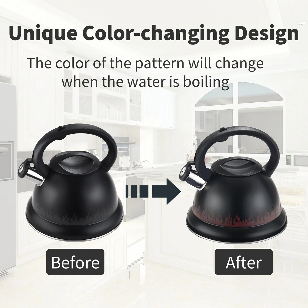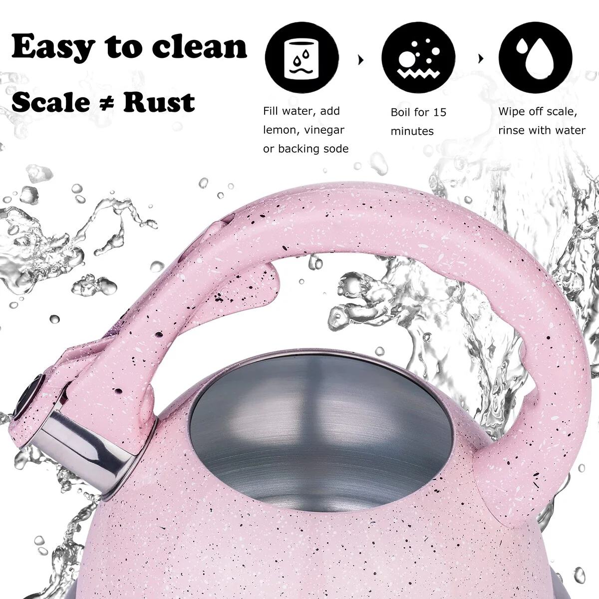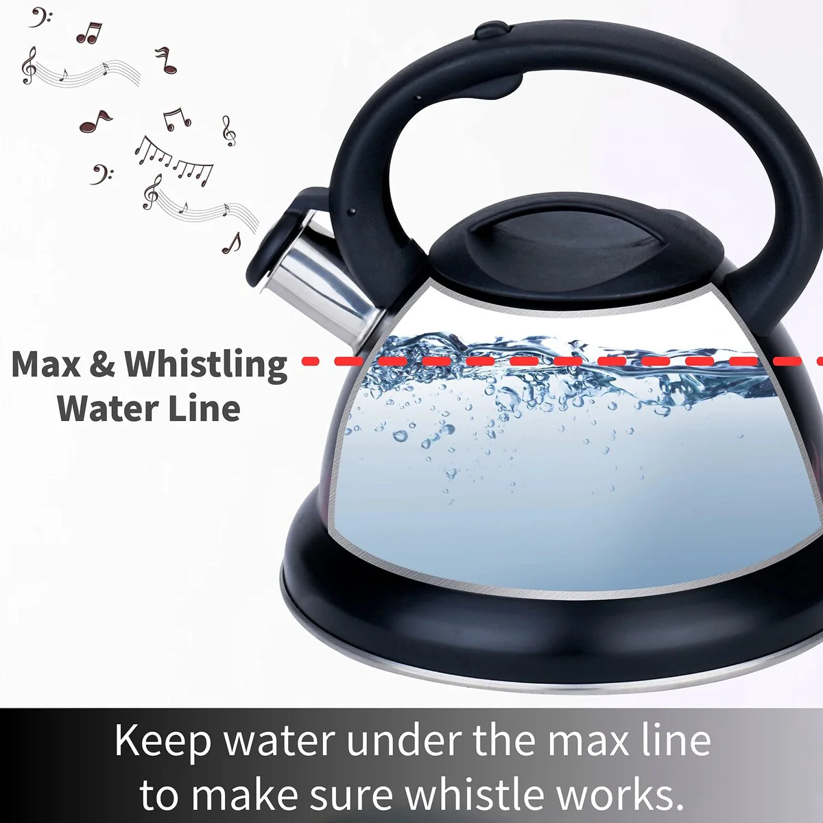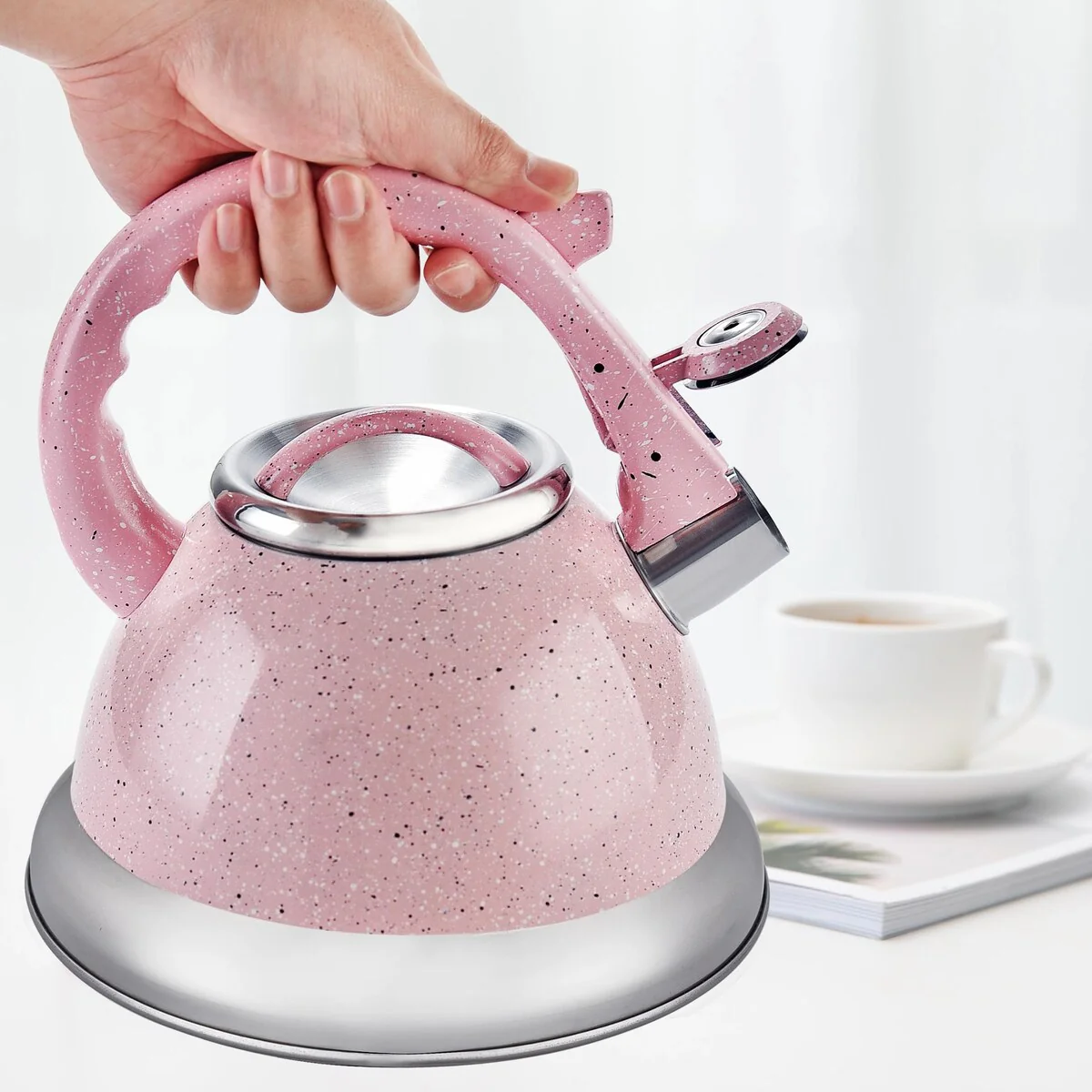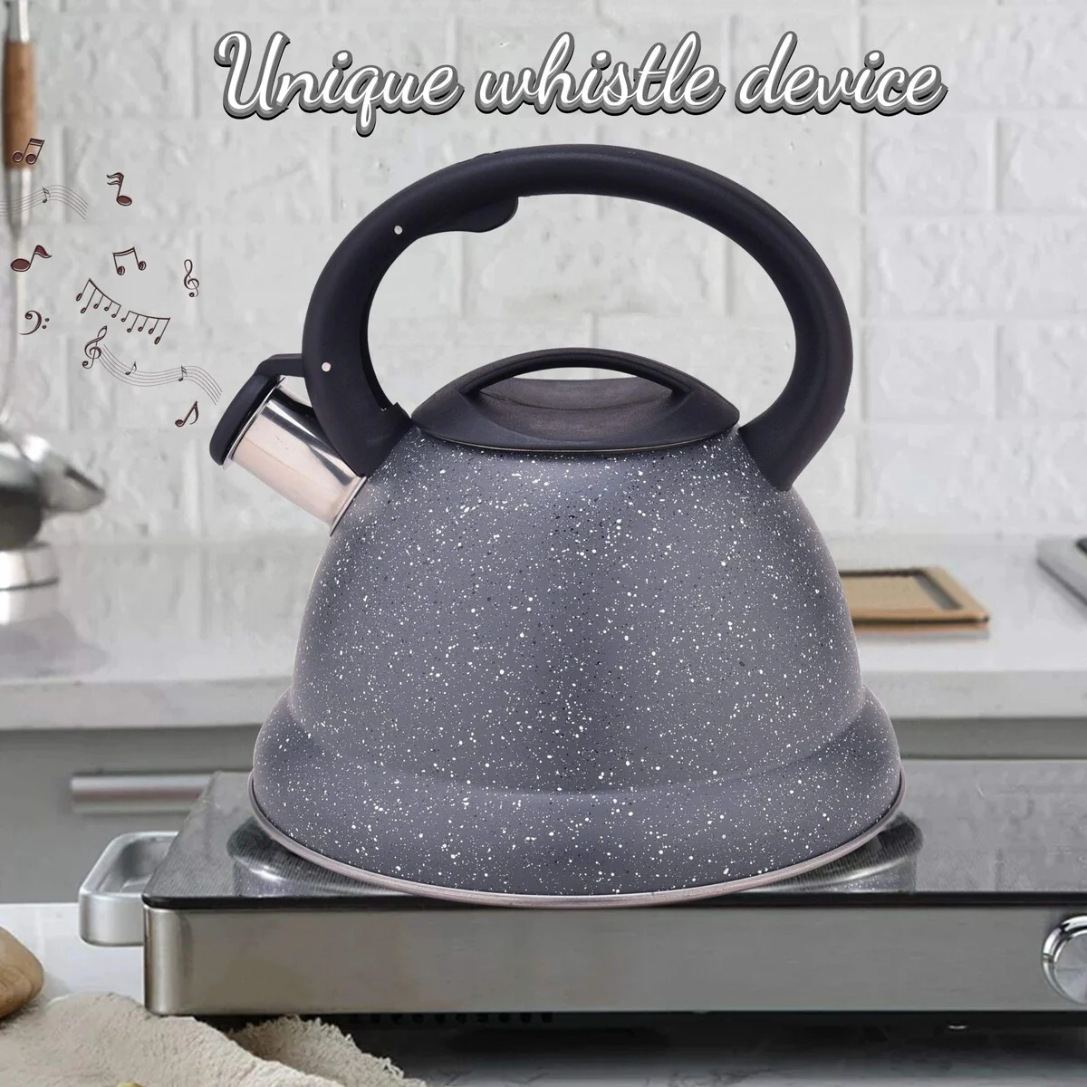 Loudly whistle: When the water is boiling, the whistling kettle will   automatically emit a whistle, so you can hear a unique and loud whistle. When   you are focusing on other issues (such as housework, watching TV, or games), the   whistle on the kettle will attract your attention. Time-saving, simple, and   stress-free.