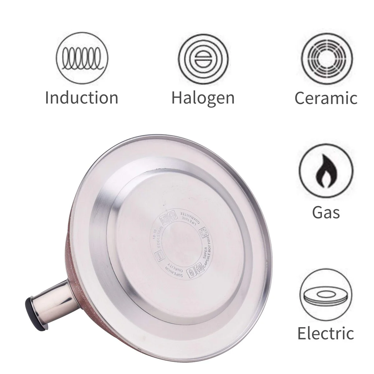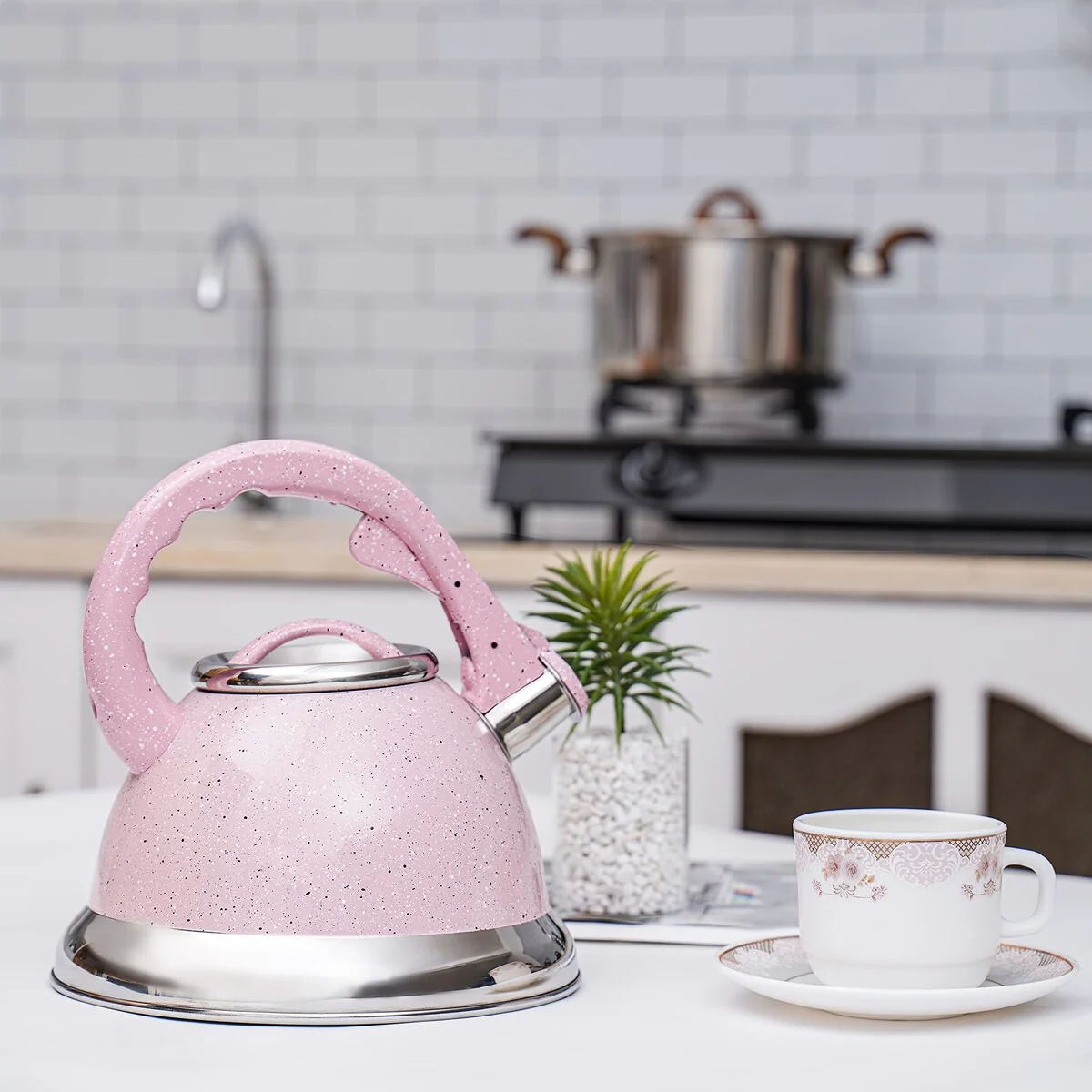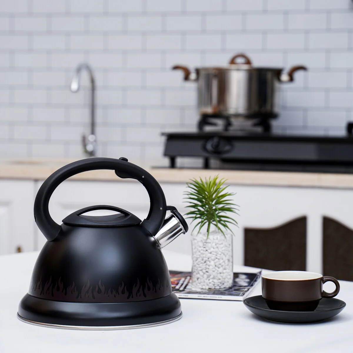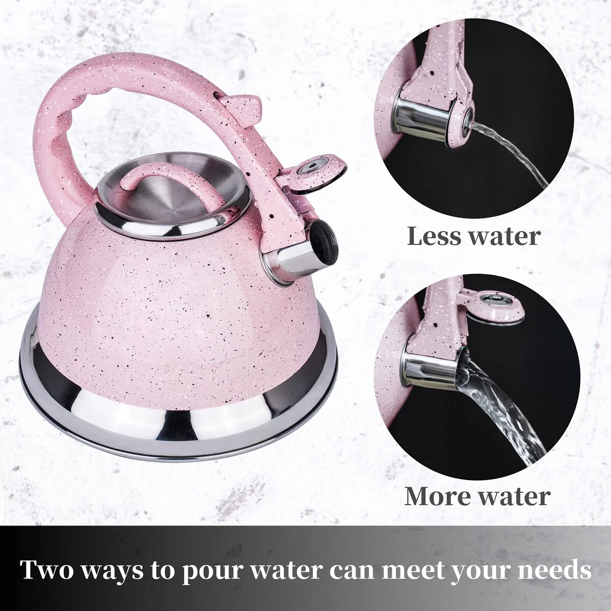 Loudly whistle: When the water is boiling, the whistling kettle will   automatically emit a whistle, so you can hear a unique and loud whistle. When   you are focusing on other issues (such as housework, watching TV, or games), the   whistle on the kettle will attract your attention. Time-saving, simple, and   stress-free.