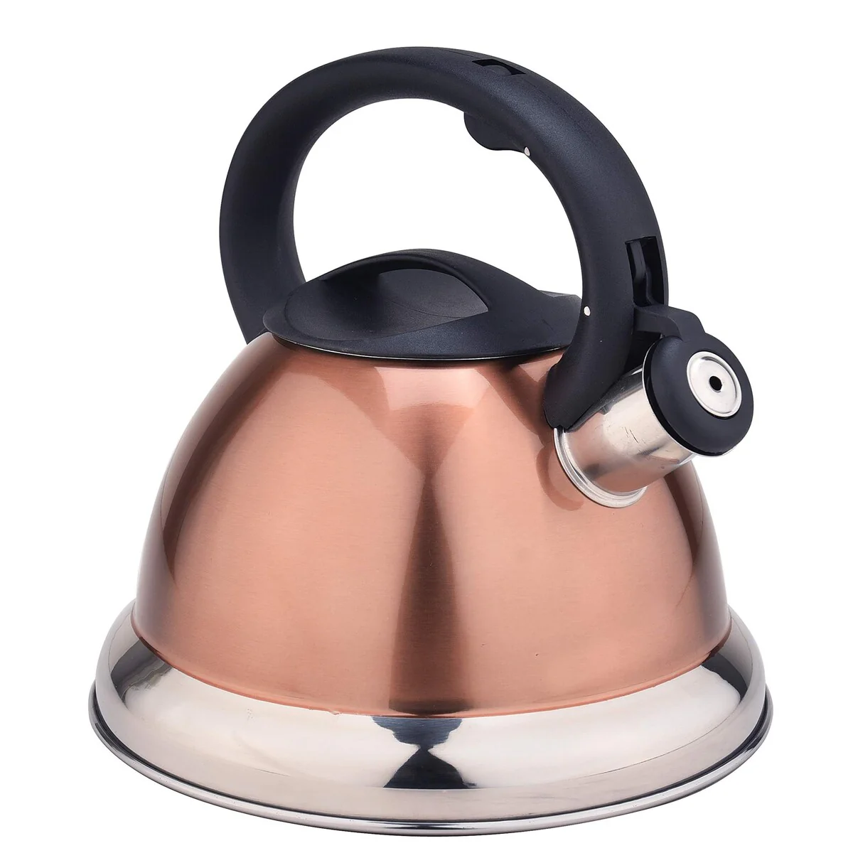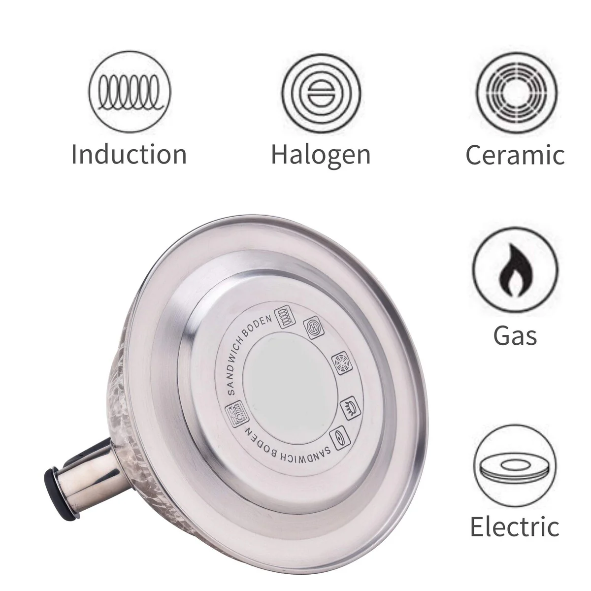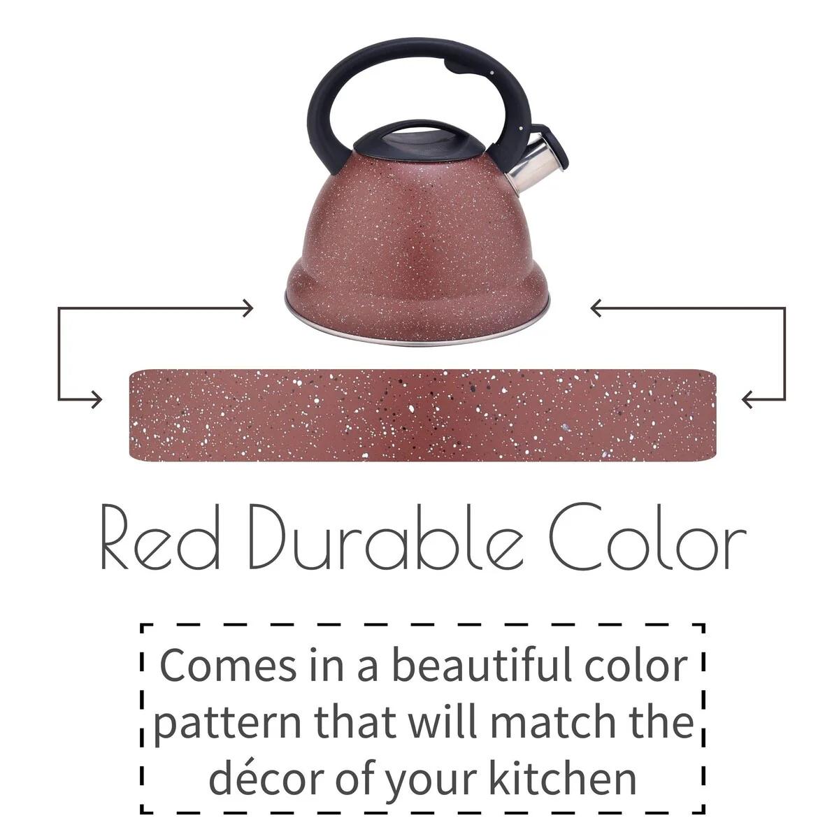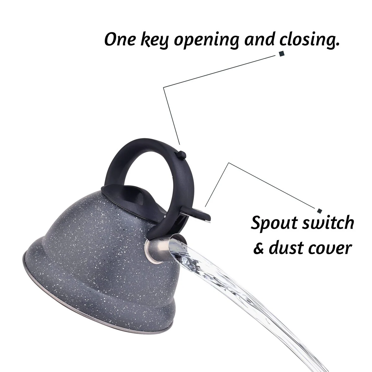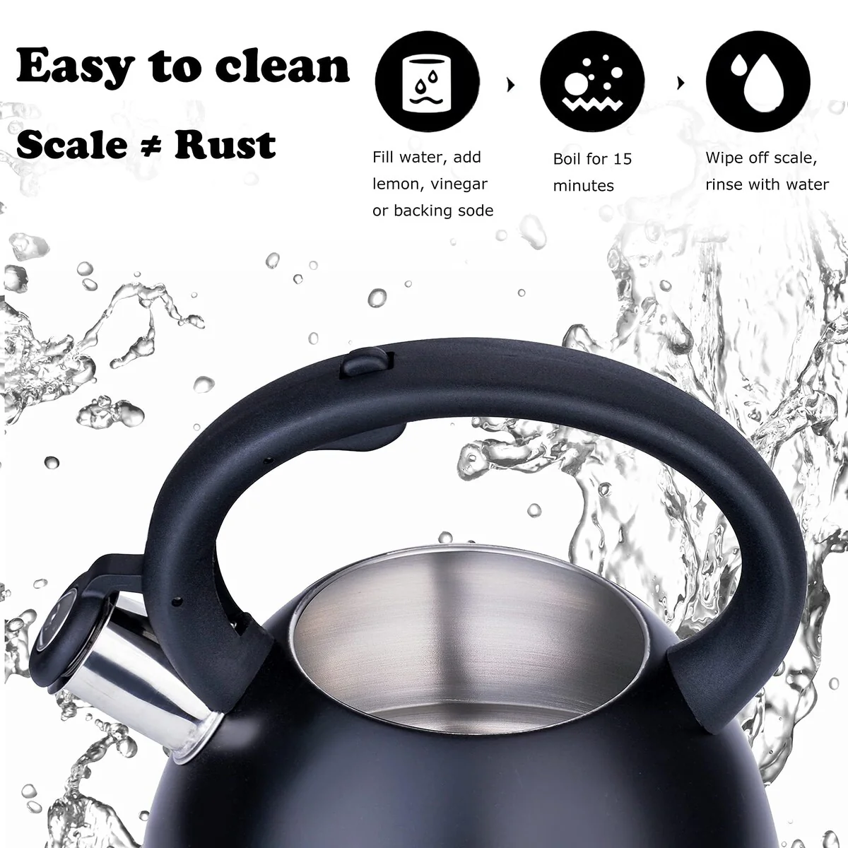 Loudly whistle: When the water is boiling, the whistling kettle will   automatically emit a whistle, so you can hear a unique and loud whistle. When   you are focusing on other issues (such as housework, watching TV, or games), the   whistle on the kettle will attract your attention. Time-saving, simple, and   stress-free.
