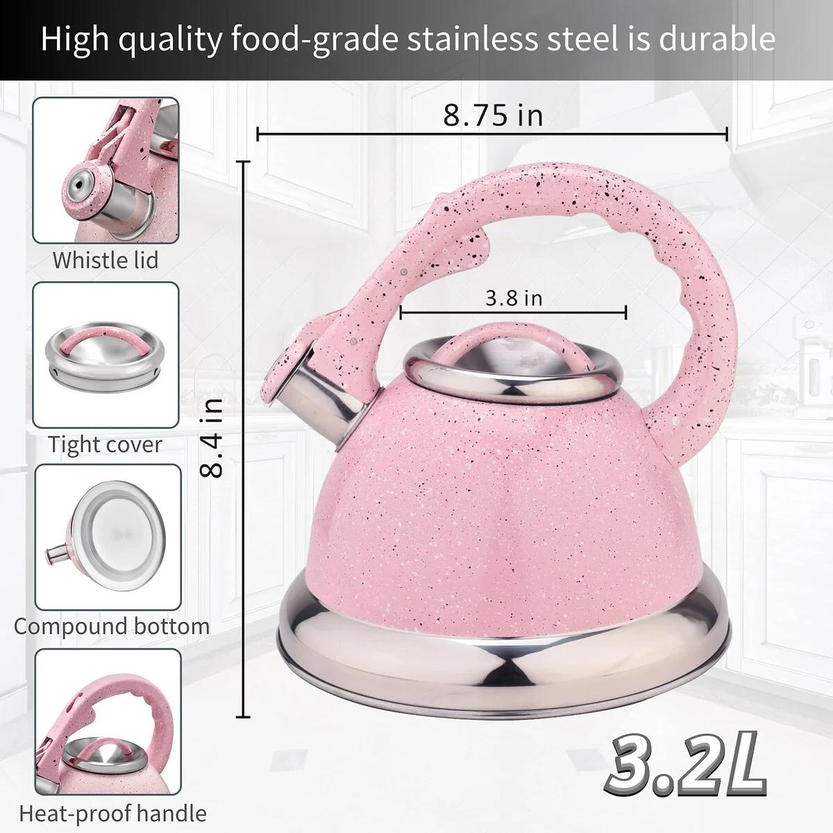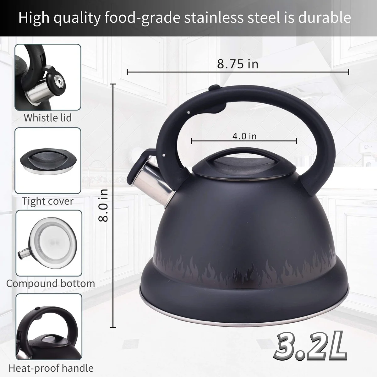 Large capacity: 3.2L large capacity stove tea kettle saves your time and   energy, suitable for family use. The larger opening makes it easy to fill and   clean the stove top teapot. The unique design of the opening angle of the spout can not   only open the lid and fill with water but also quickly fill with water through the spout.